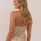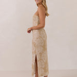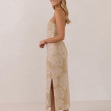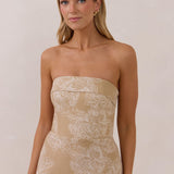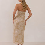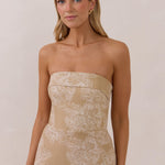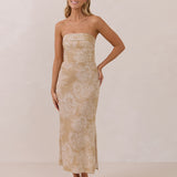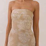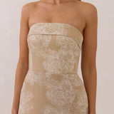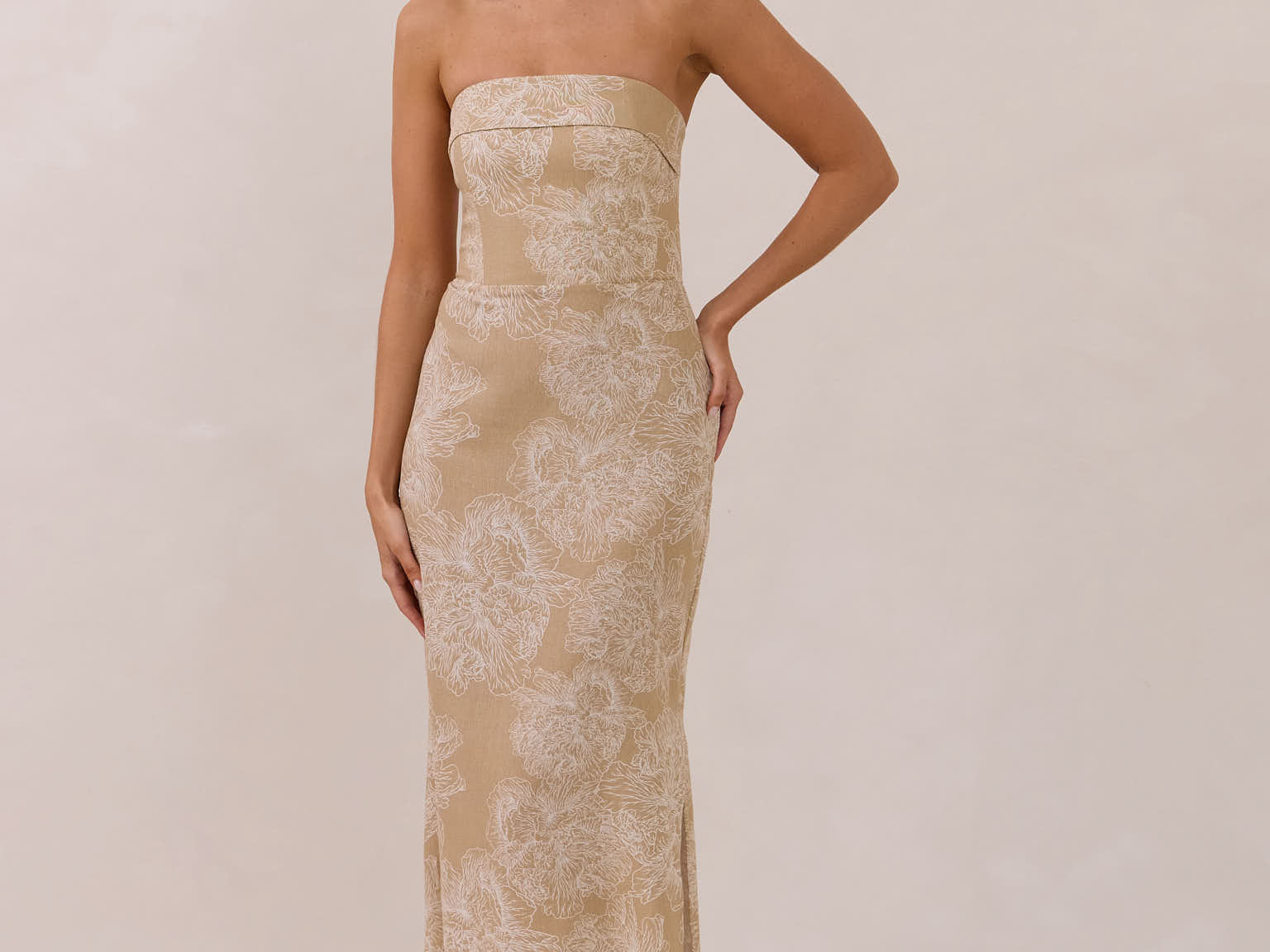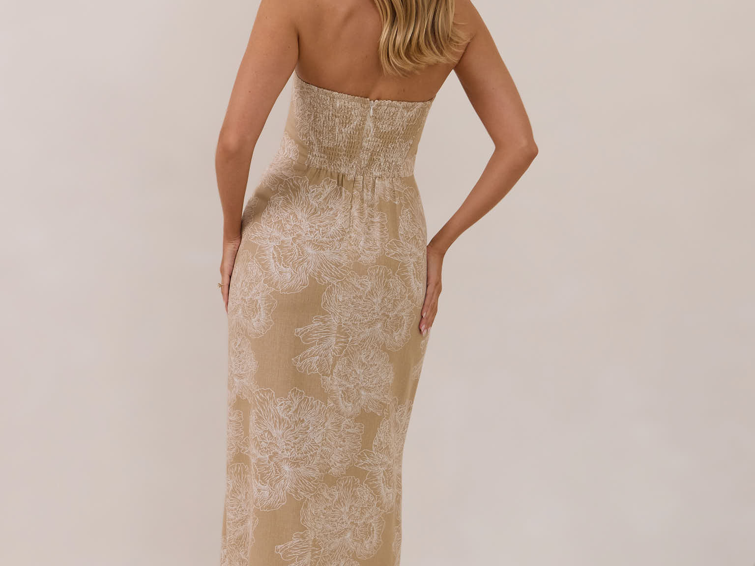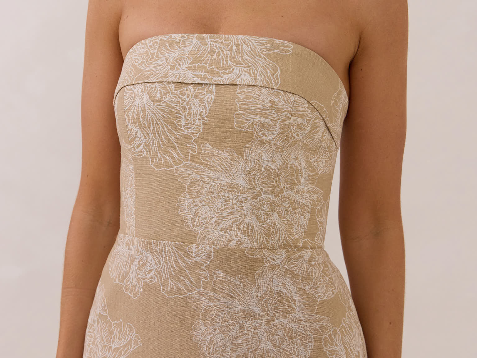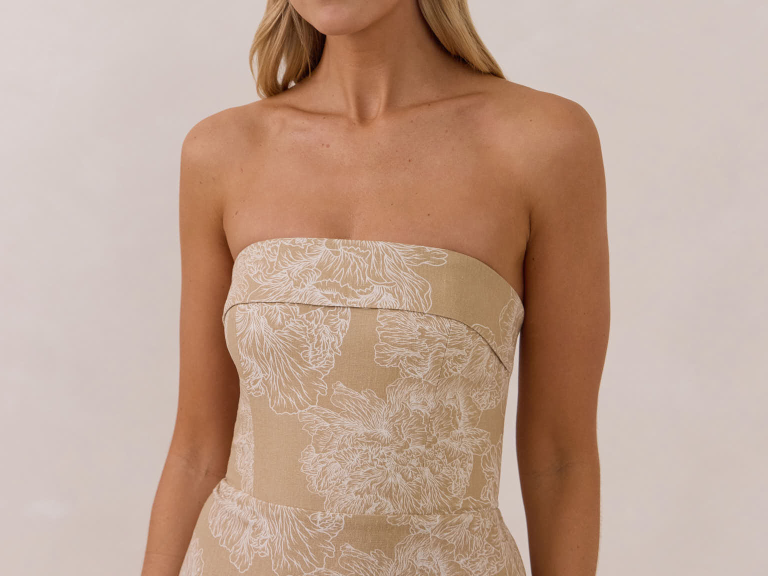 Structured and streamlined, the Vaughn Dress is a strapless midi with a clean, minimal silhouette. It features a fitted bodice with boning for added support, a straight neckline, and subtle back shirring for a flexible fit.