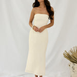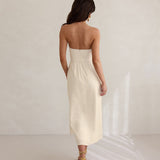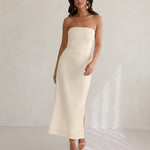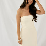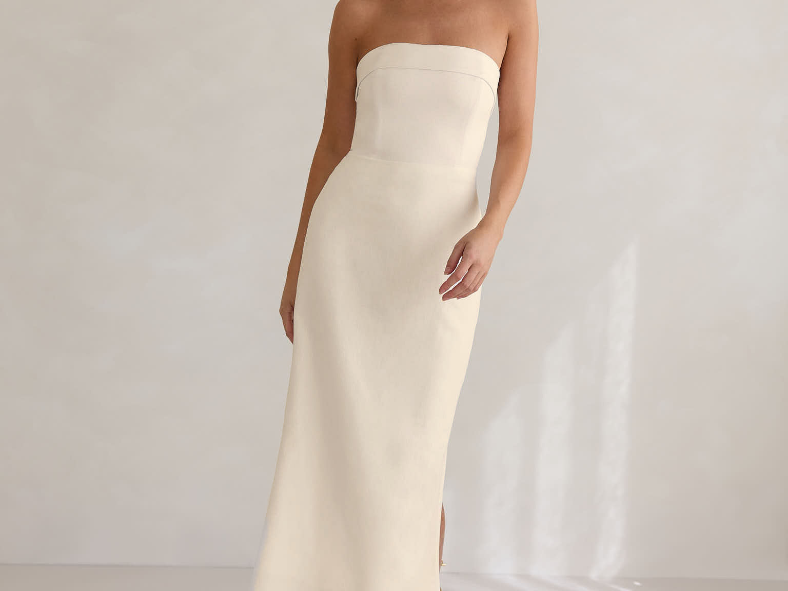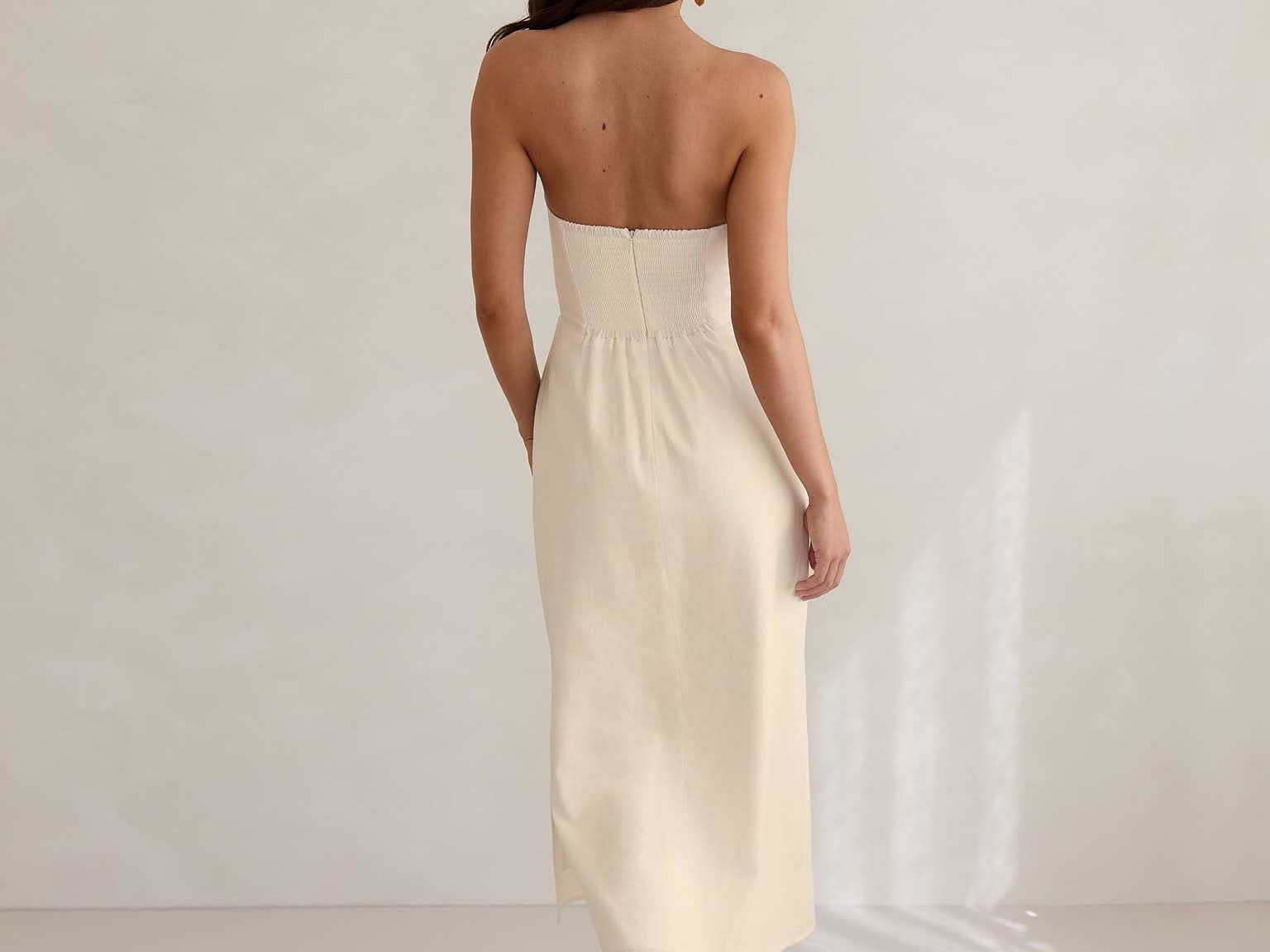 Structured and streamlined, the Vaughn Dress is a strapless midi with a clean, minimal silhouette. It features a fitted bodice with boning for added support, a straight neckline, and subtle back shirring for a flexible fit.