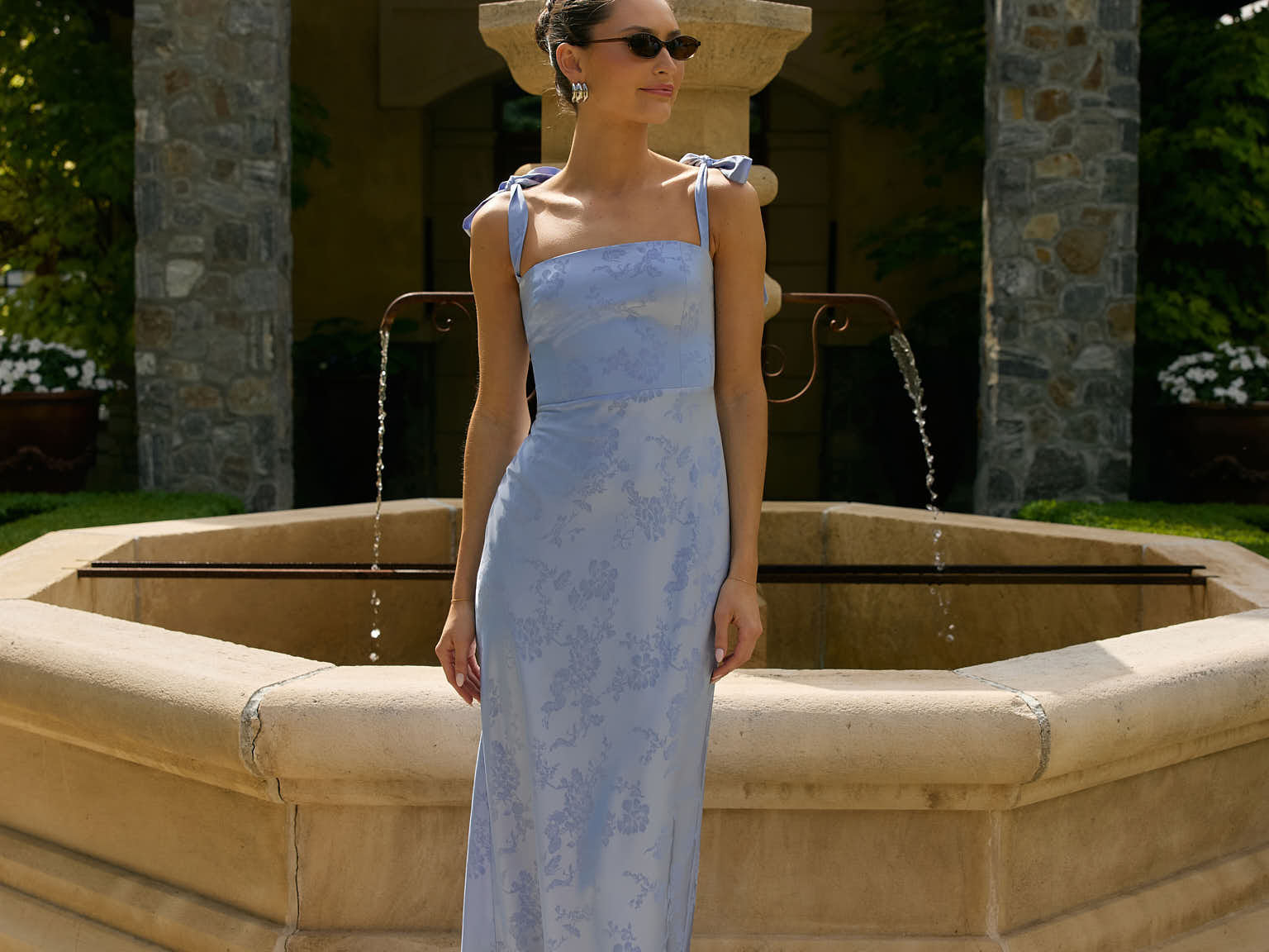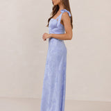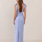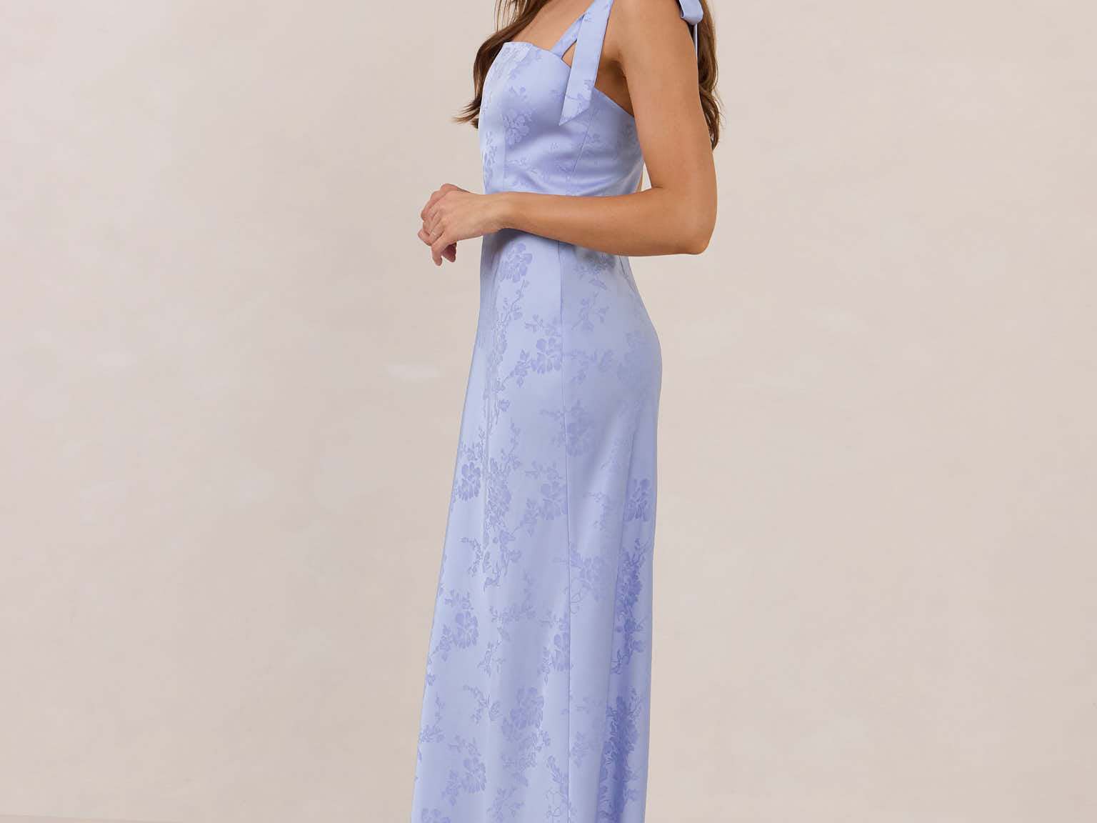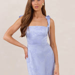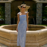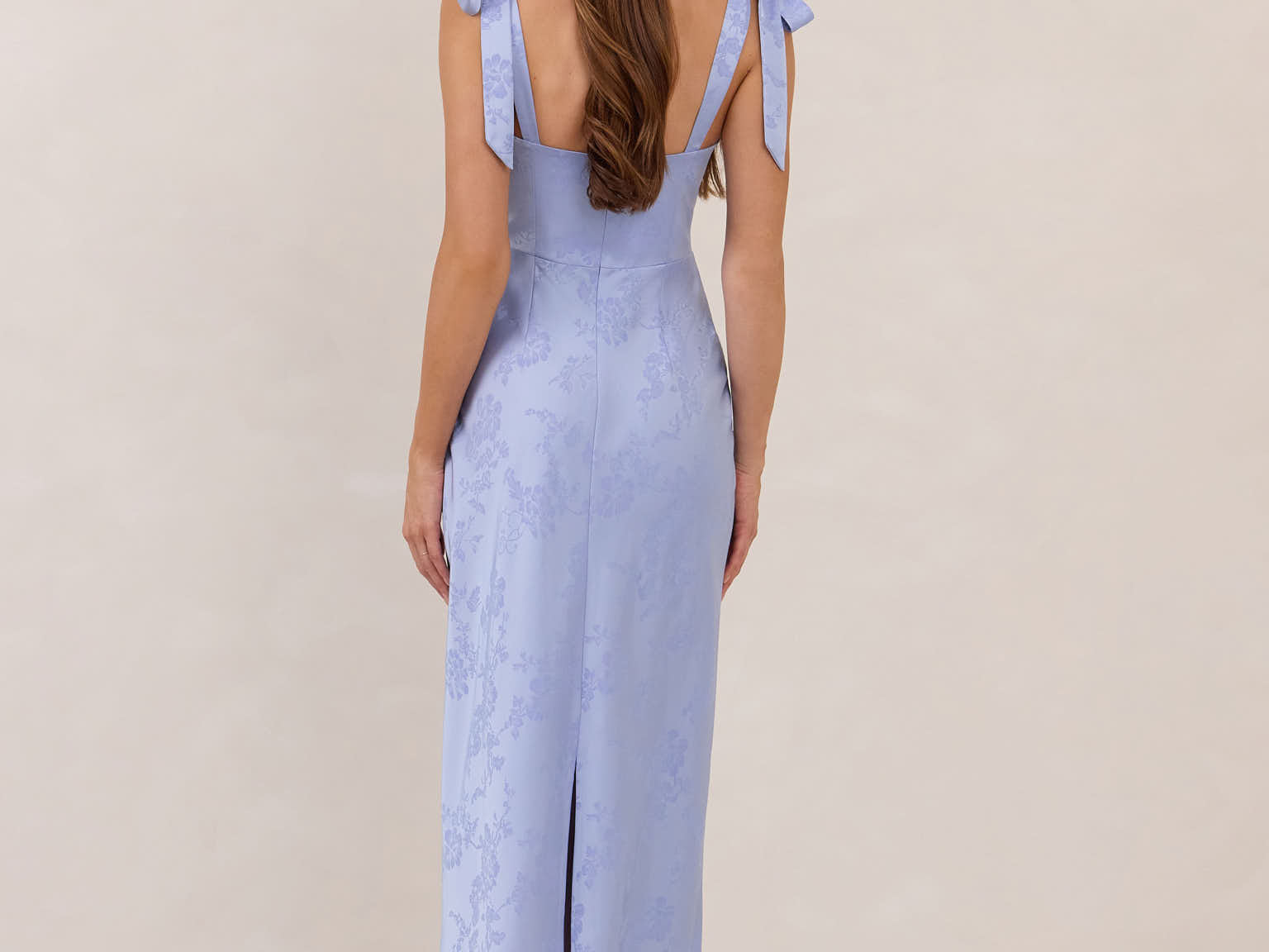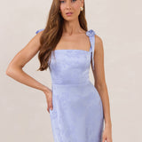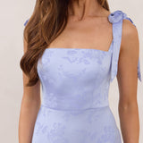Featuring a sleek square neckline and thick tie straps, this style provides an effortless yet structured fit. The slim-fit skirt skims the body for a smooth, elongated silhouette, while an invisible back zipper ensures a seamless finish. Perfect for elevated evenings.