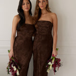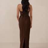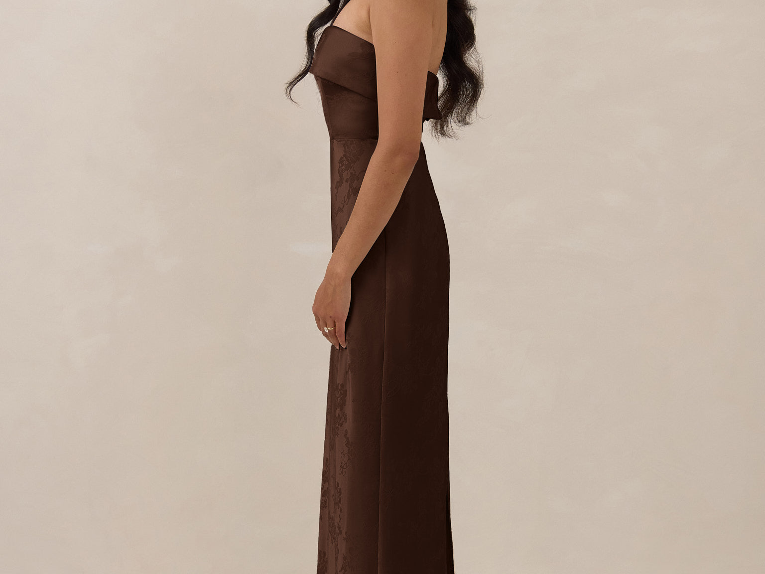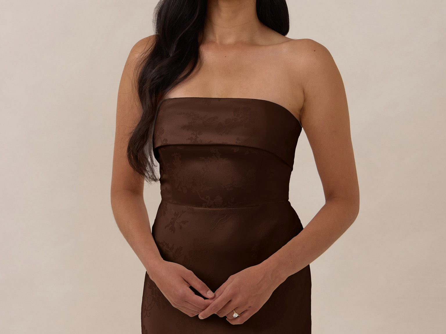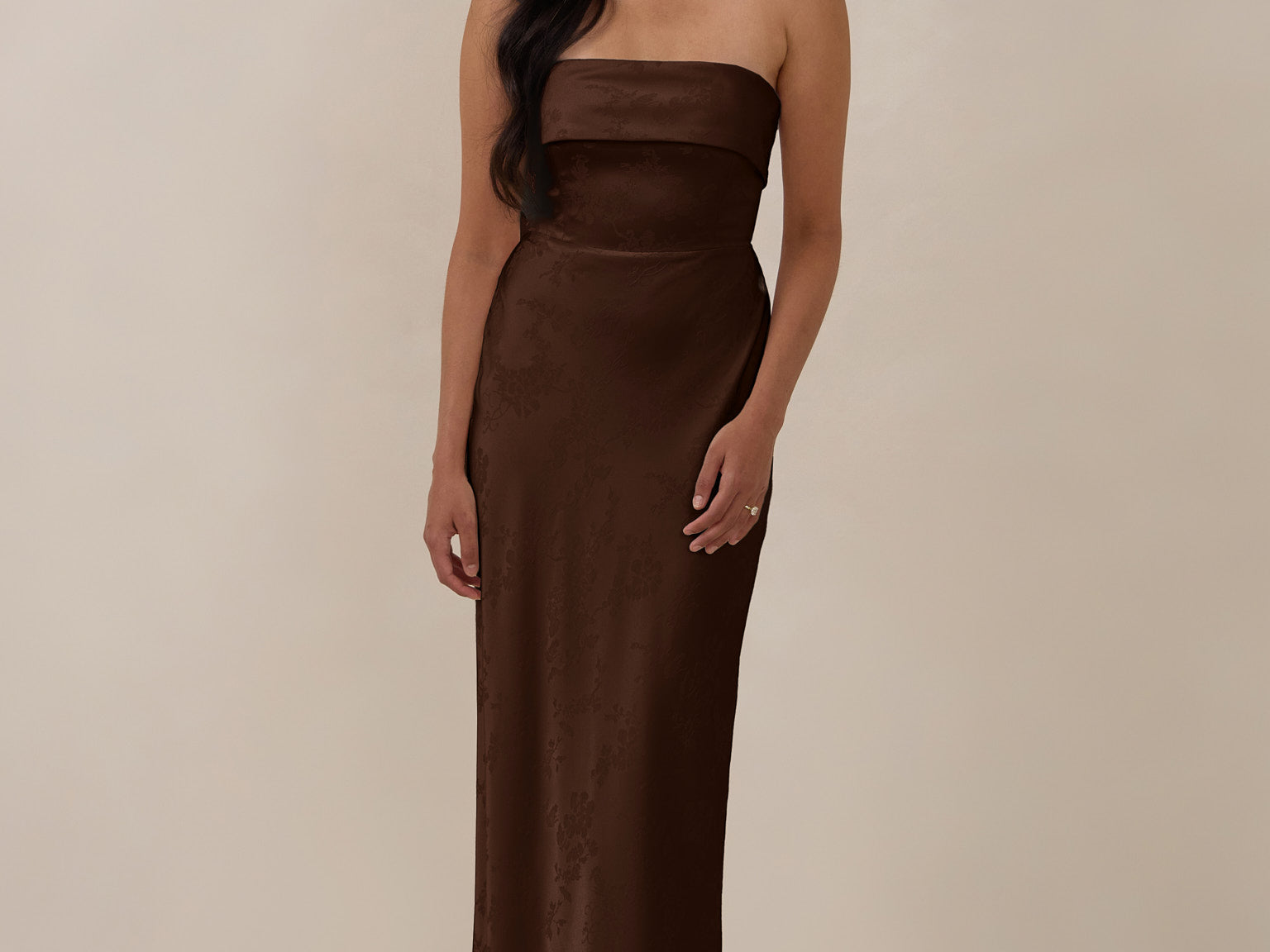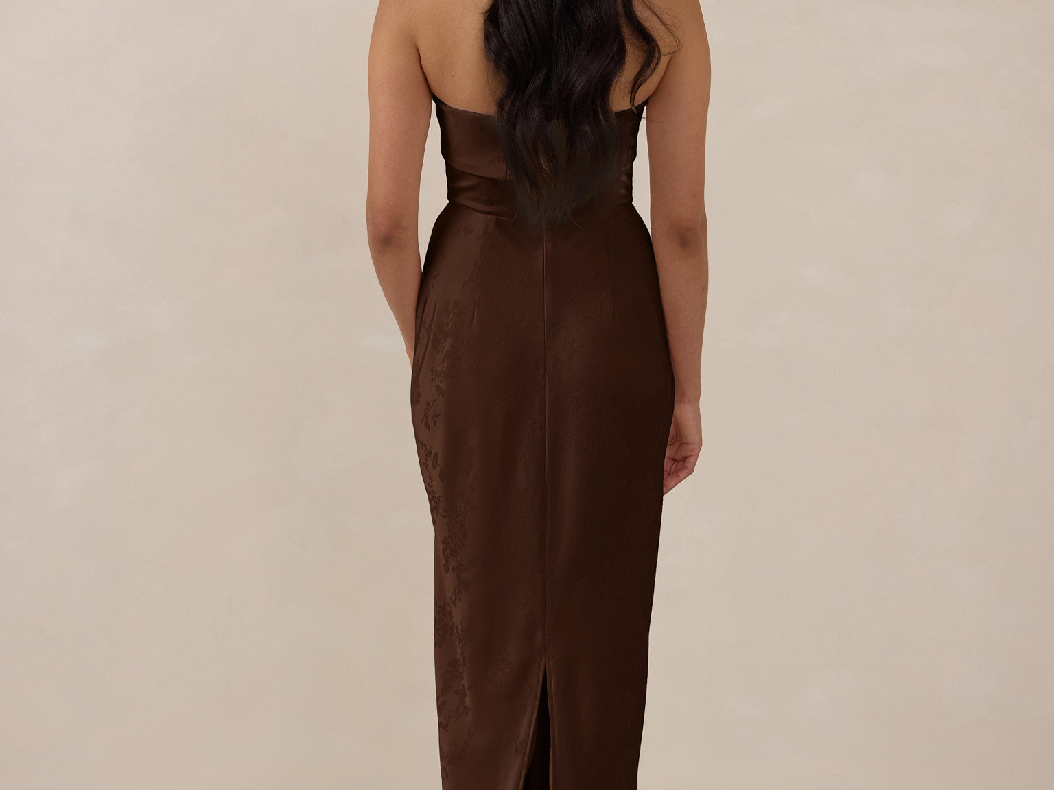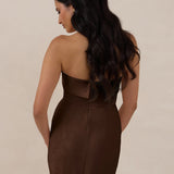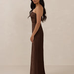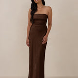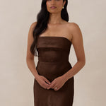 A timeless piece designed to captivate. Designed from luxe bubble satin fabric with a subtle sheen, this dress exudes understated glamour. The structured, folded strapless neckline adds a modern sculptural element, gracefully framing the shoulders.