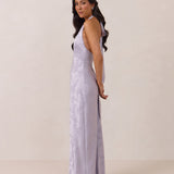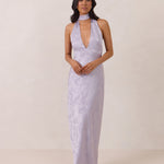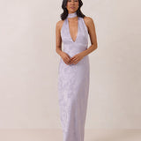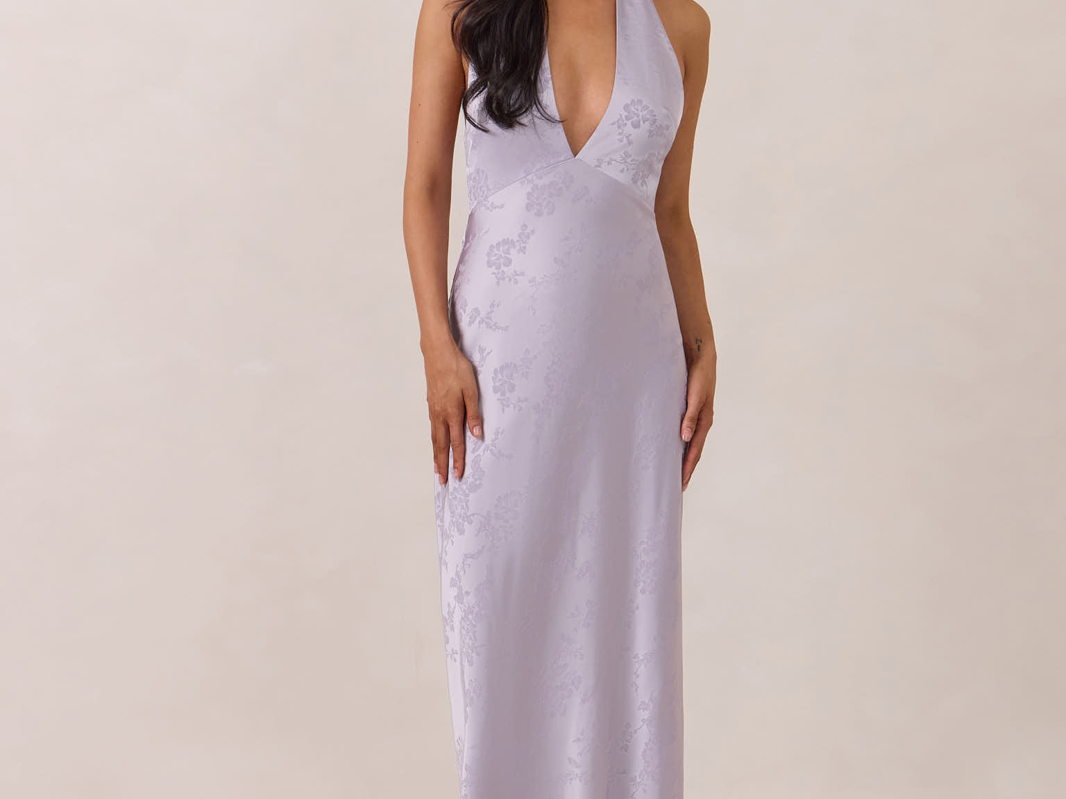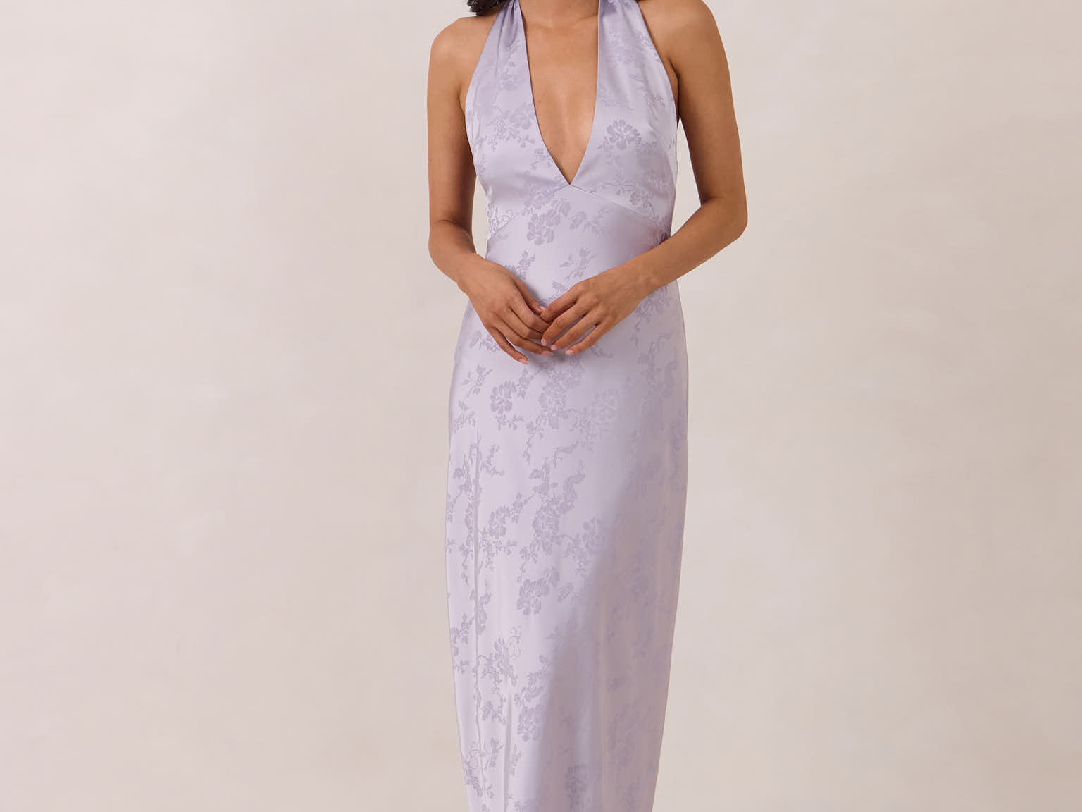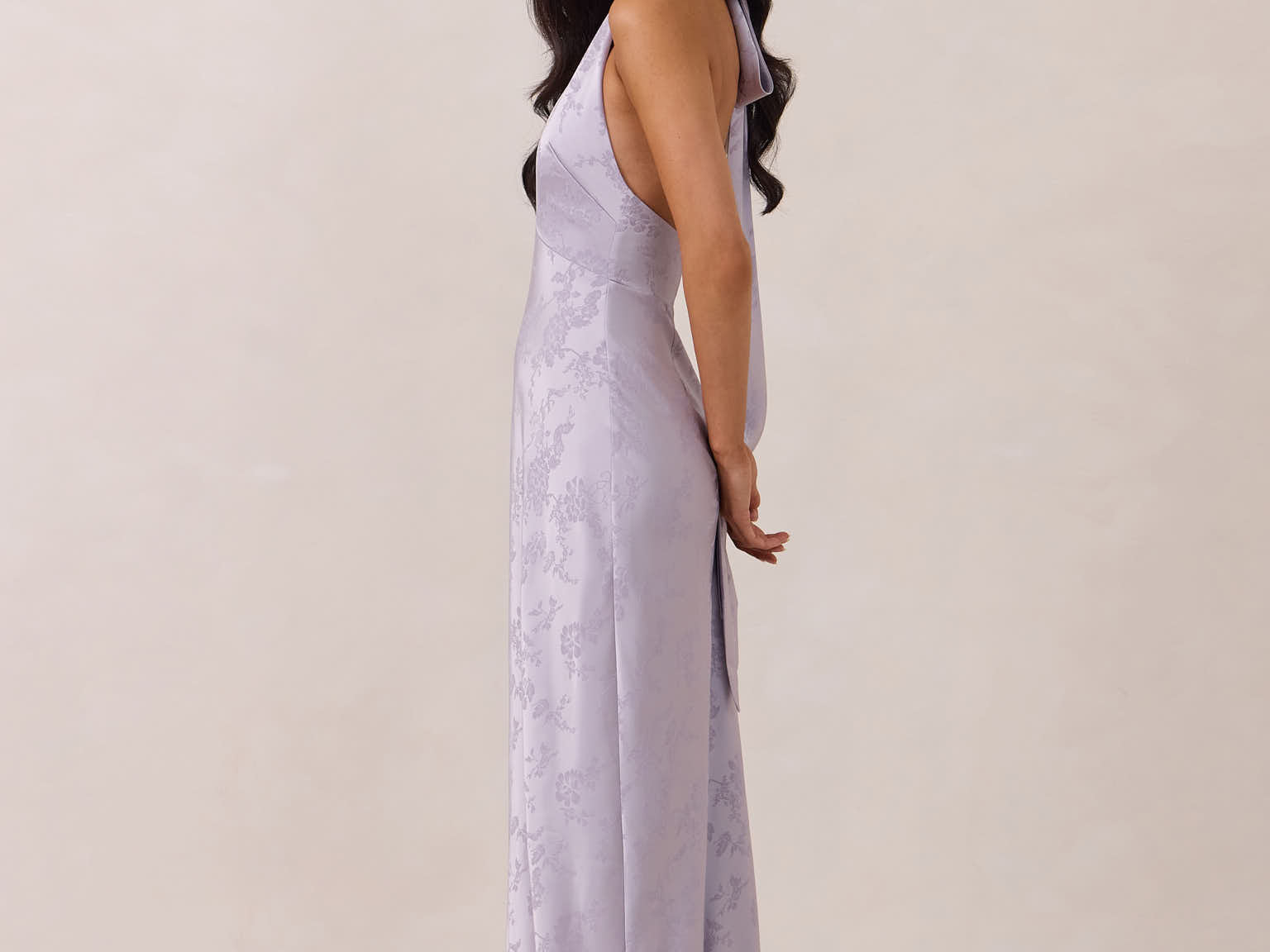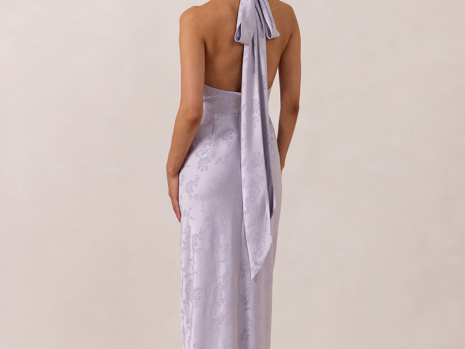 A sleek and versatile silhouette crafted in luxurious Jacquard for a touch of texture and sophistication. Designed for effortless elegance, it features a halter neckline with a dramatic open back and long ties that can be styled as a scarf or knotted for a custom halter look. The bias-cut skirt flows beautifully into a flattering maxi length, creating graceful movement with every step.