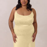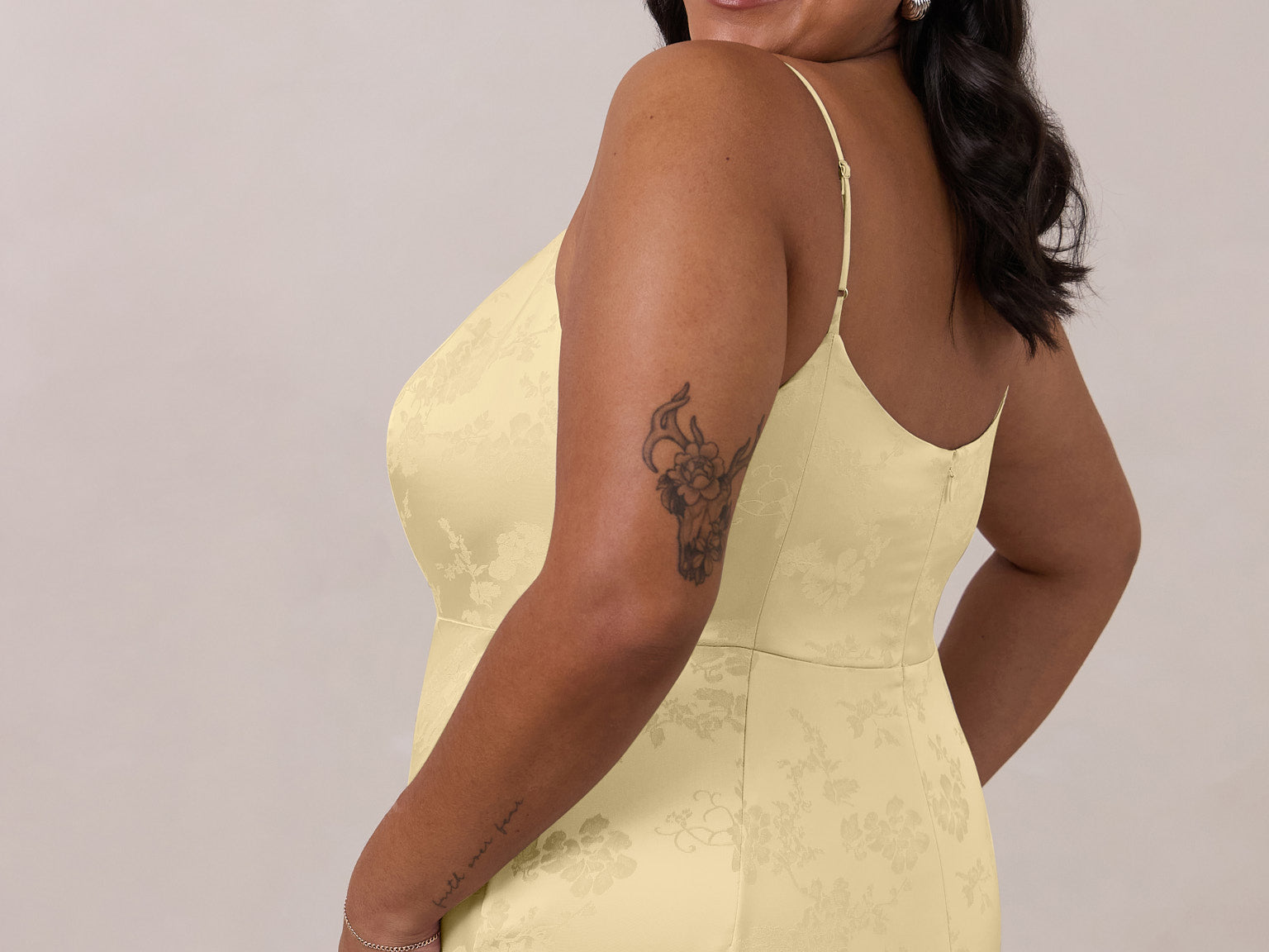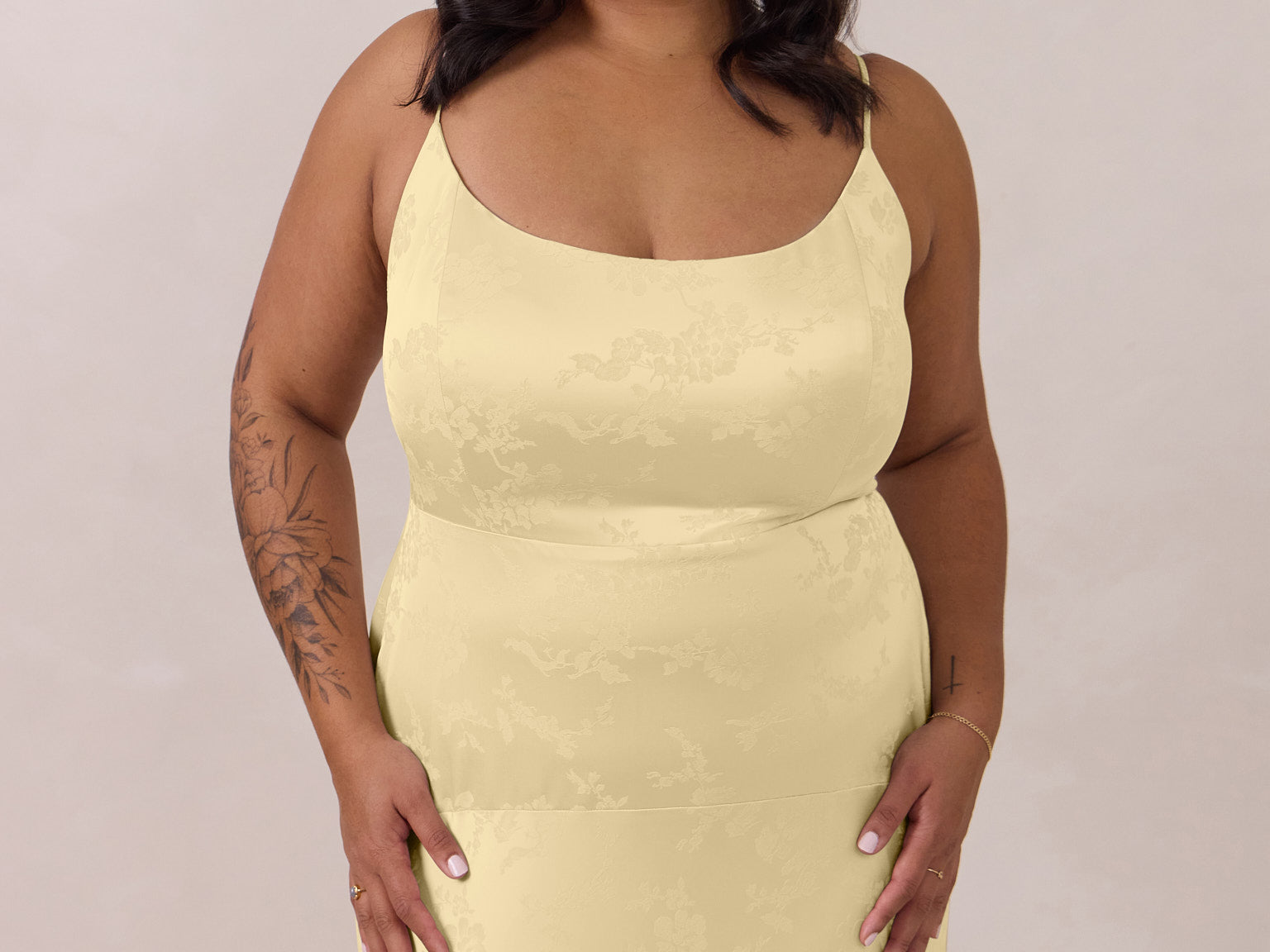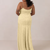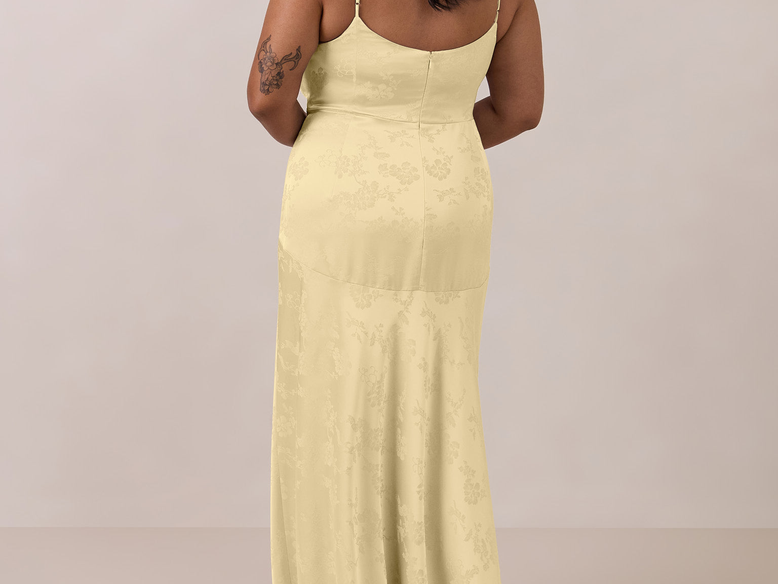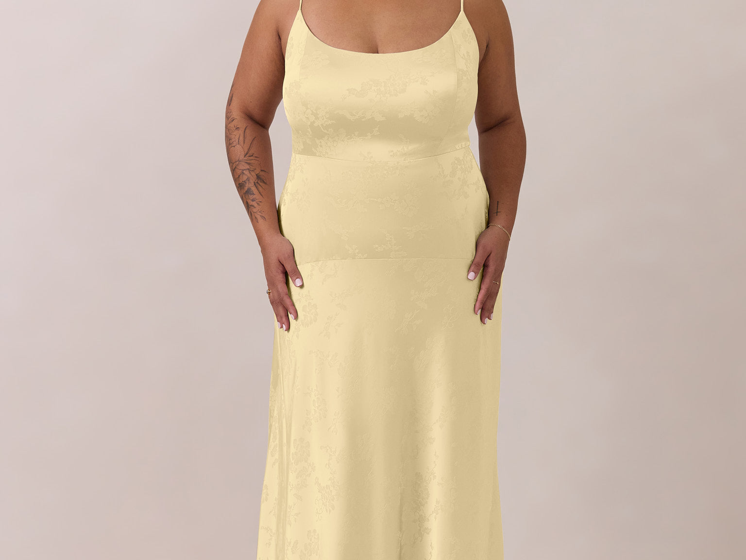 Crafted from luxurious Jacquard satin, this full-length dress features adjustable straps and a flattering drop waist, creating an elegant silhouette with timeless appeal. The scoop neckline and back add a delicate, feminine touch, while the bias-cut skirt flows gracefully to the floor, combining sophistication and comfort for a truly captivating look.