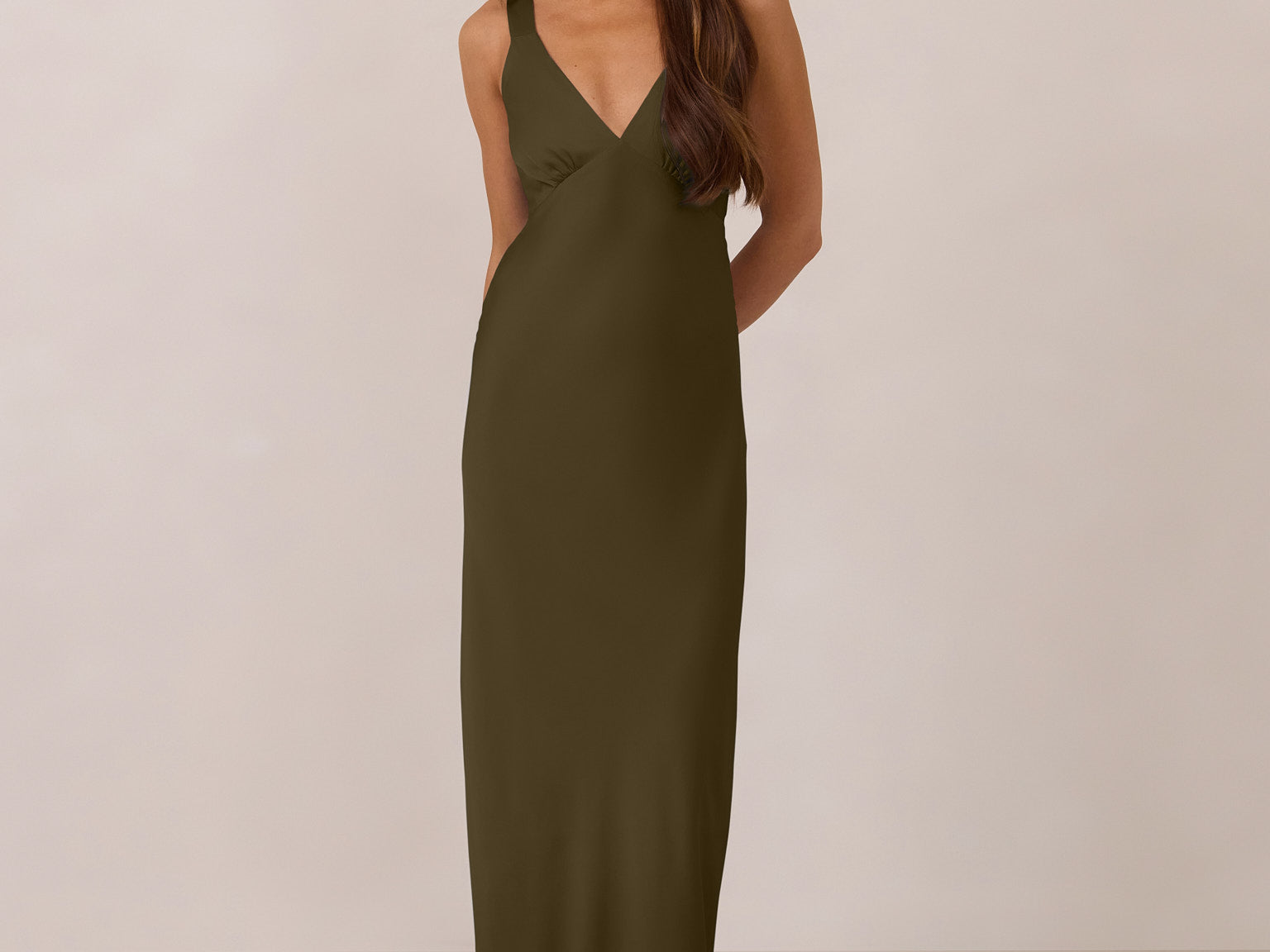 Featuring a flattering V-neckline, gathering at the bust, and an open back, this bias-cut dress offers a sleek, elongating silhouette. The clean lines and minimalist design make it the perfect choice for any special occasion.