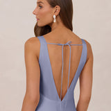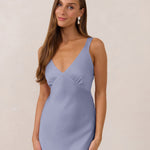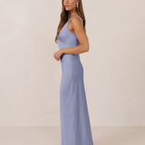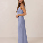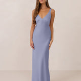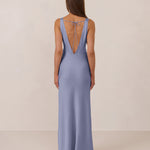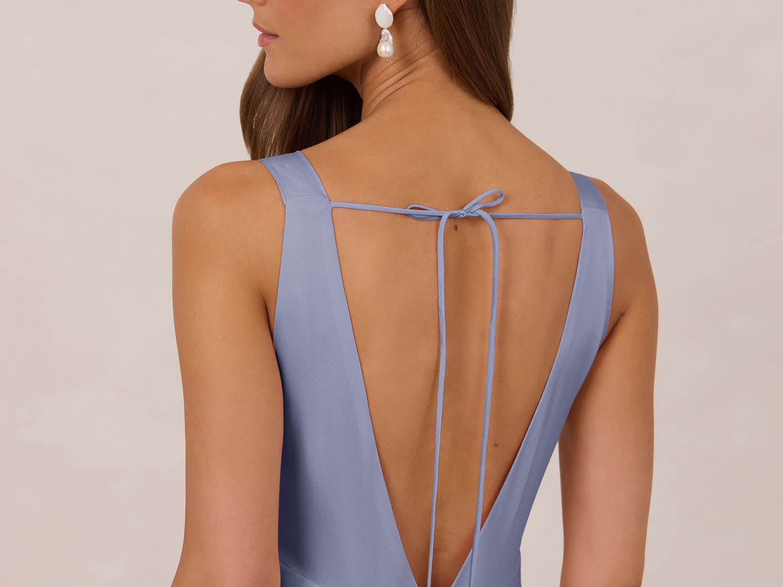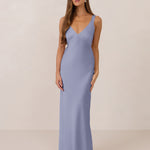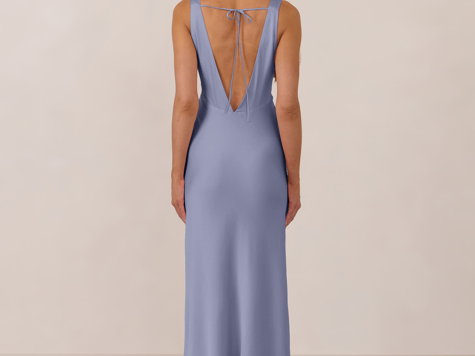 Featuring a flattering V-neckline, gathering at the bust, and an open back, this bias-cut dress offers a sleek, elongating silhouette. The clean lines and minimalist design make it the perfect choice for any special occasion.