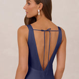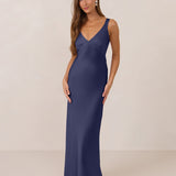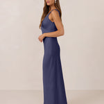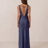 Featuring a flattering V-neckline, gathering at the bust, and an open back, this bias-cut dress offers a sleek, elongating silhouette. The clean lines and minimalist design make it the perfect choice for any special occasion.