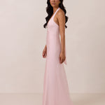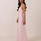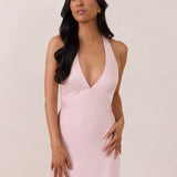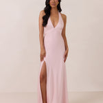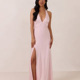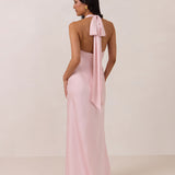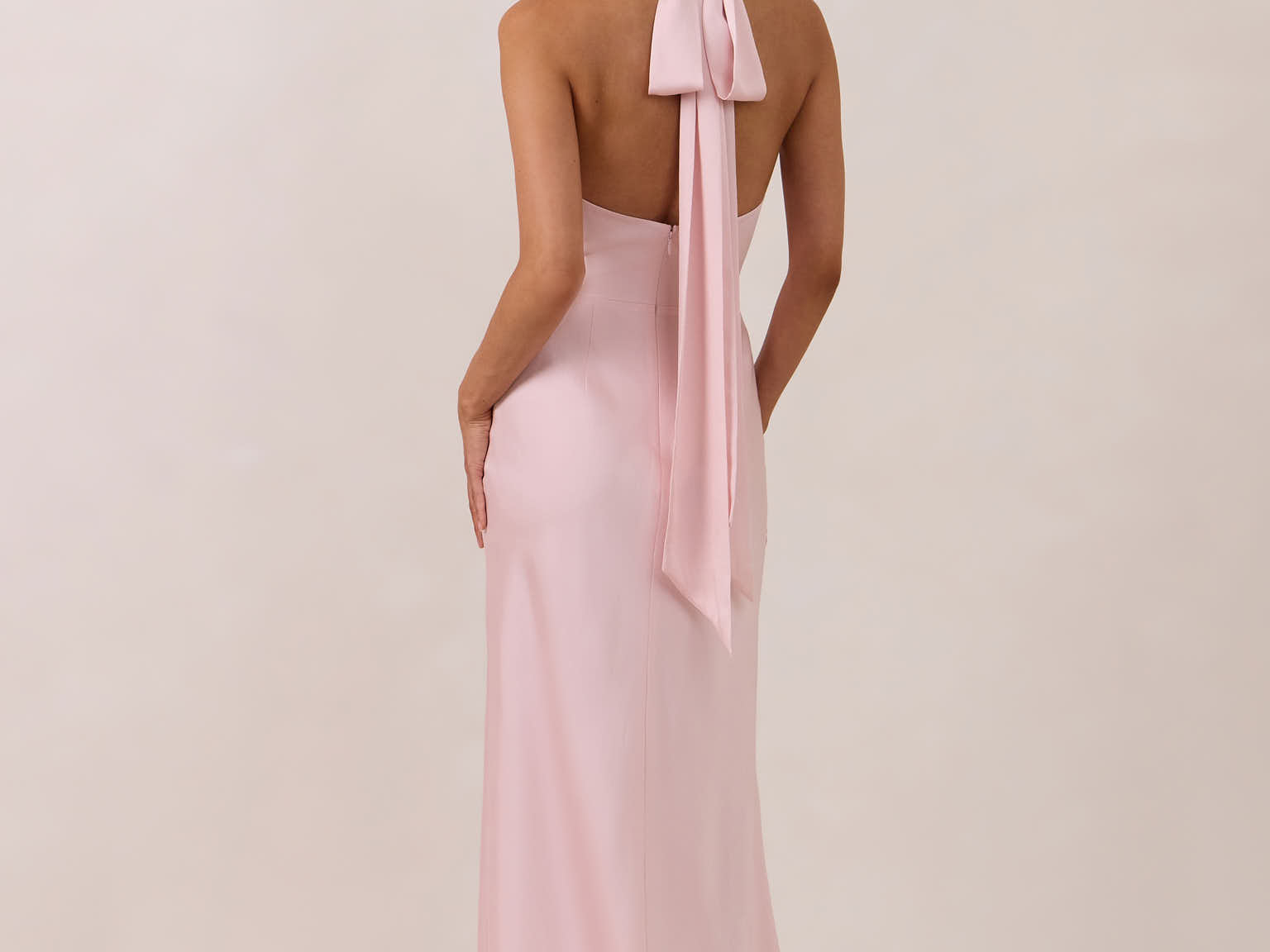 Designed to turn heads. Crafted from our smooth satin, this bust-friendly halter style features long, versatile ties that can be styled in a bow or worn as a neck scarf for a modern touch. Finished with a bias-cut skirt and a subtle slit, this dress effortlessly balances elegance with a bold edge.