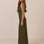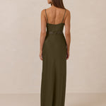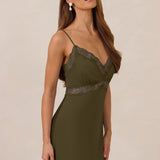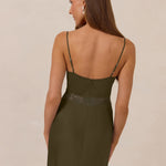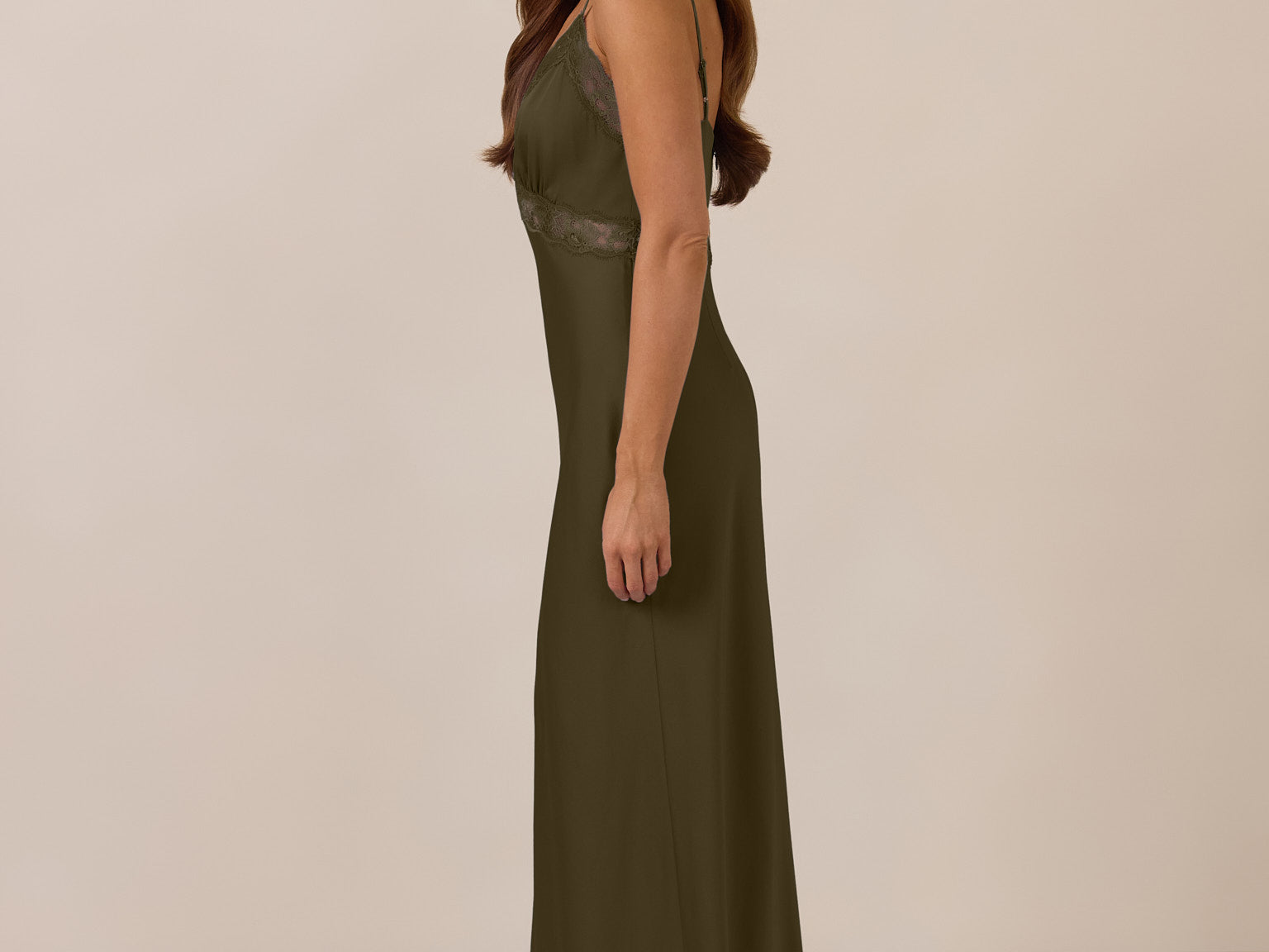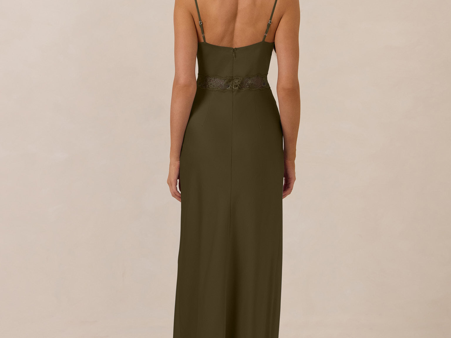 The Theodora is an elevated take on the classic slip dress, made from satin and cut on a bias for an elegant drape. It features a deep lace-trimmed neckline for a romantic touch. This full-length dress offers a fitted silhouette with adjustable straps and a discreet side zip, creating an effortlessly impactful look.