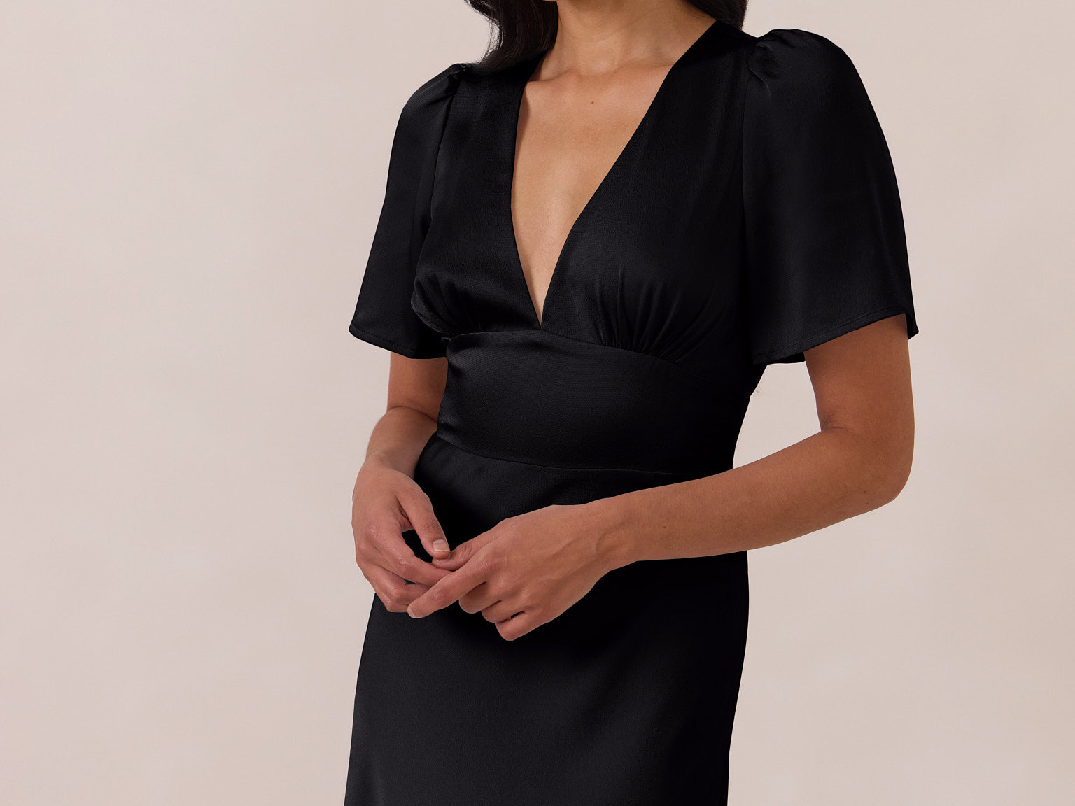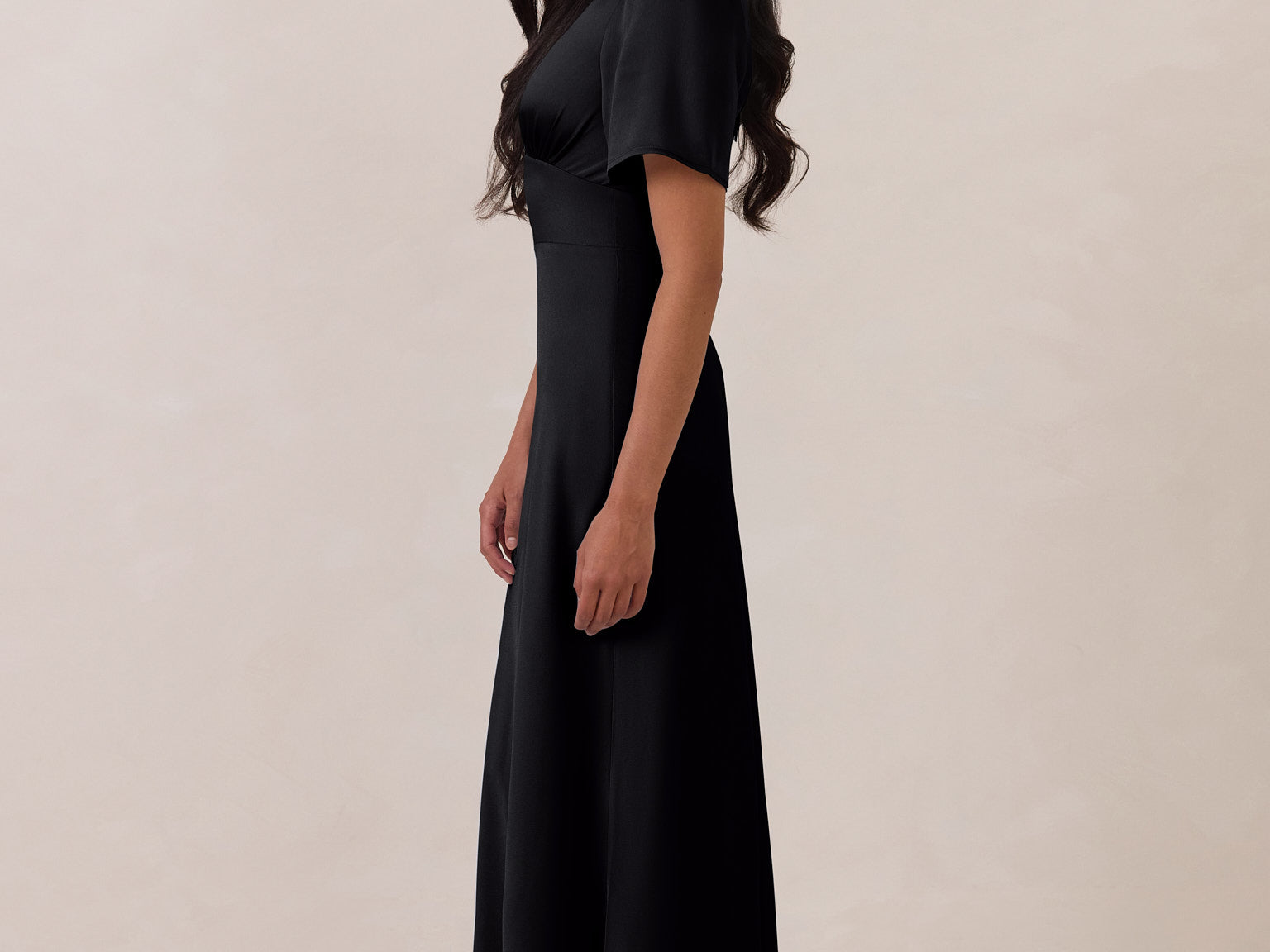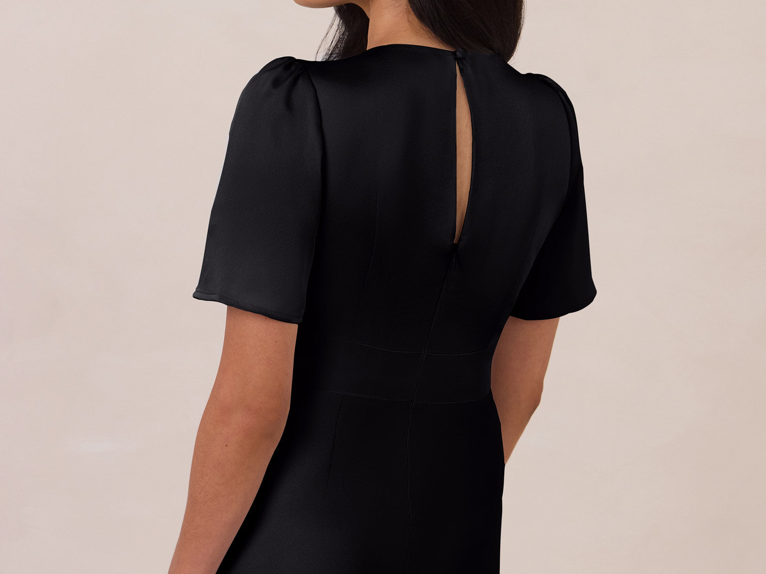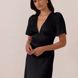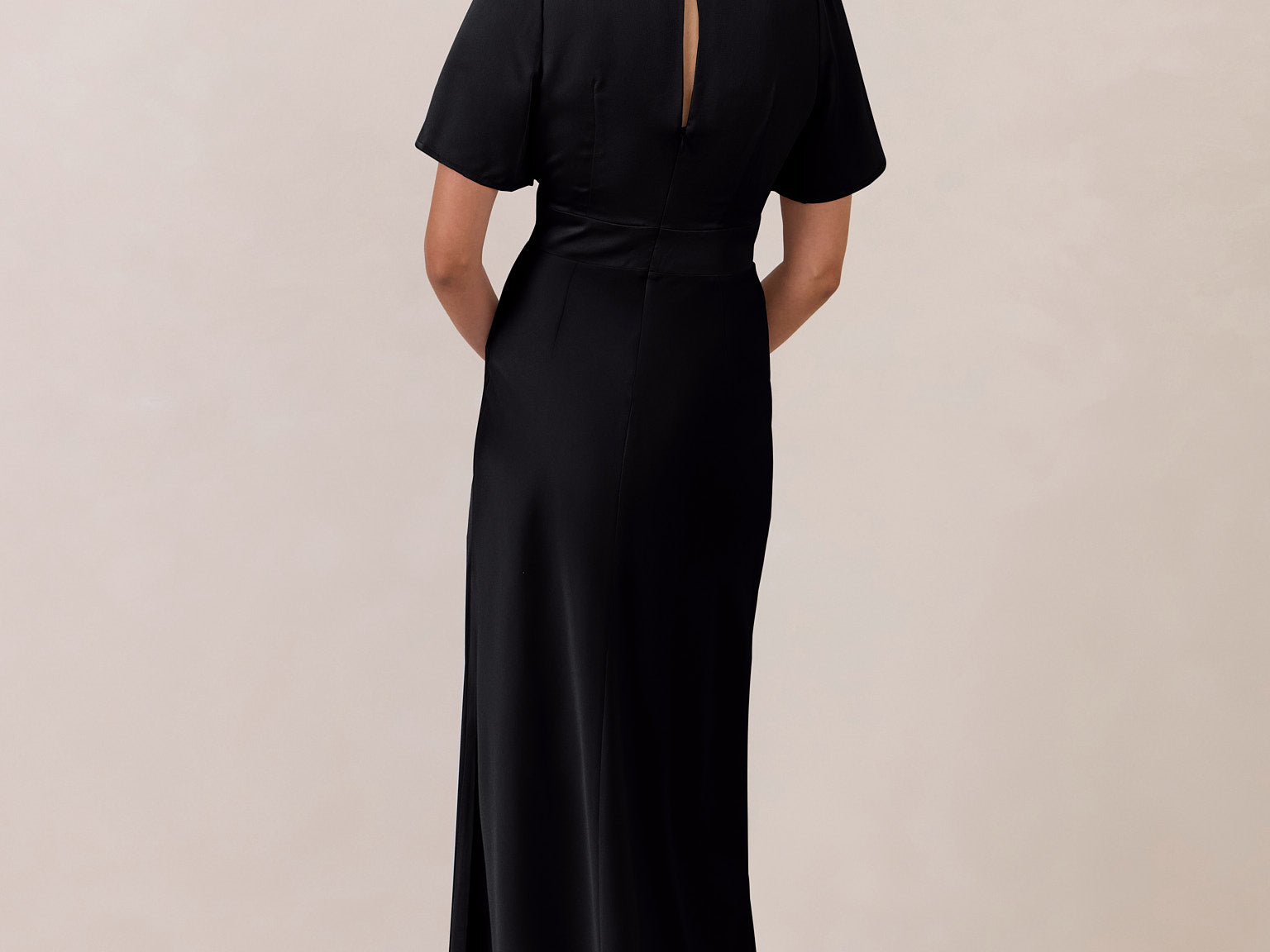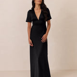 This full-length satin dress features a romantic V neckline, short sleeves, and a bias-cut skirt for an effortlessly feminine silhouette. A subtle keyhole back and delicate button closure add unexpected detail. Finished in silky satin with a soft, light-catching sheen.
