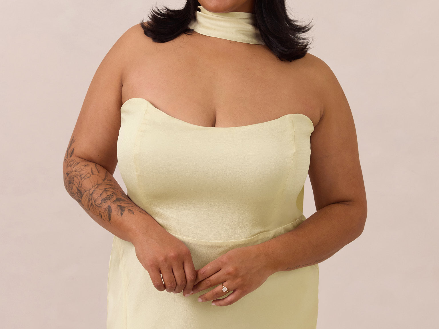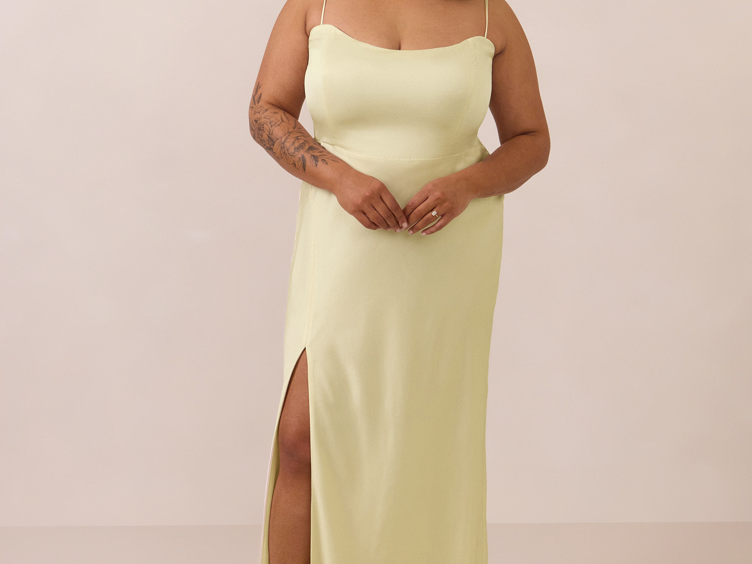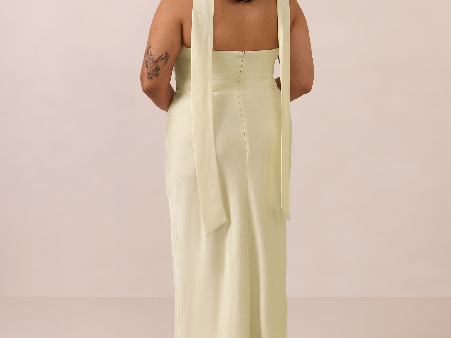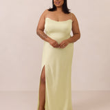With an emphasis on the details, this satin maxi dress is cut on the bias for an ultra-flattering drape that skims the body perfectly. A subtle, hip-grazing slit adds movement and a touch of leg, while removable straps offer versatility—wear it strapless for a sleek look or with straps for added support and structure.