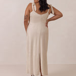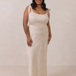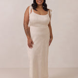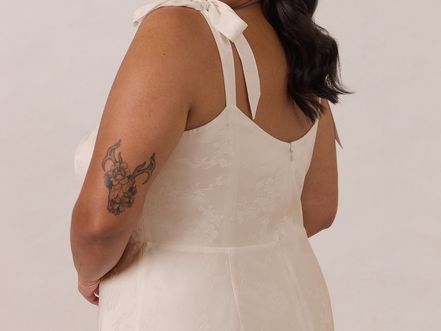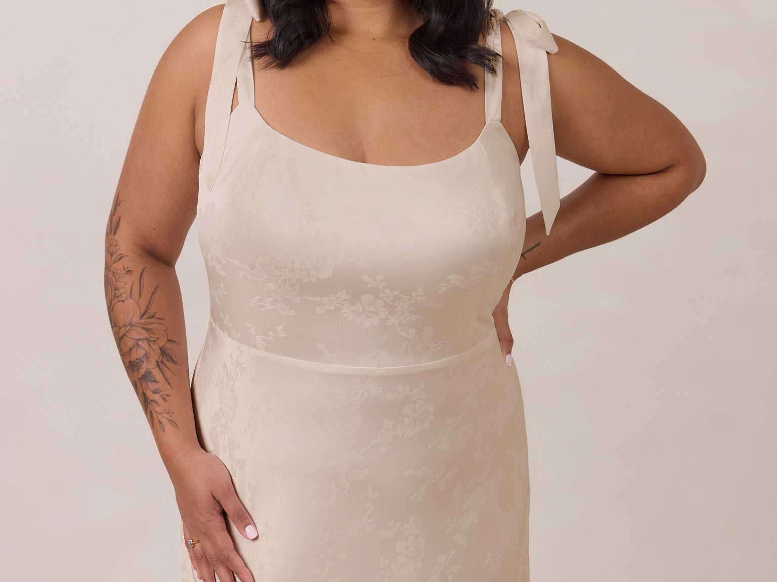 Crafted from luxurious Jacquard satin, this dress features feminine tie straps and a flattering bias-cut skirt, offering a flattering silhouette with timeless appeal.