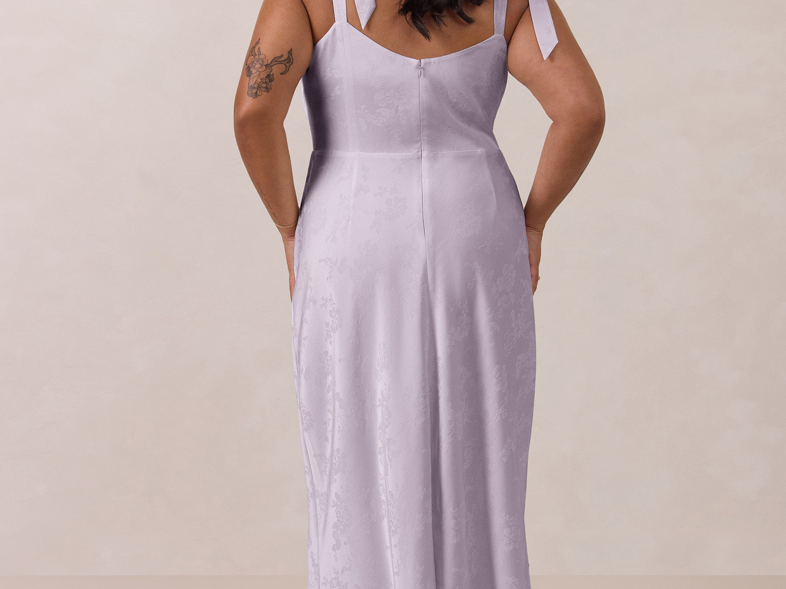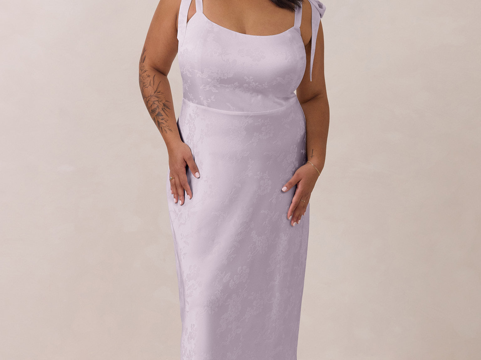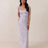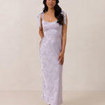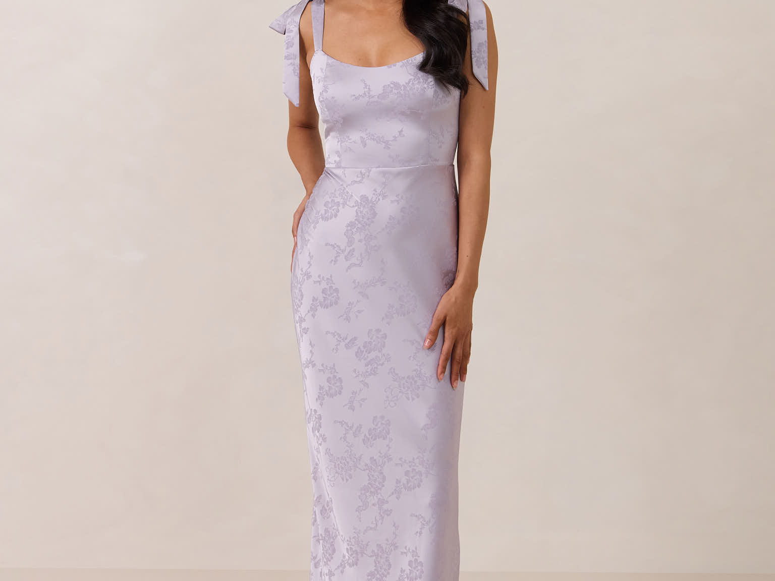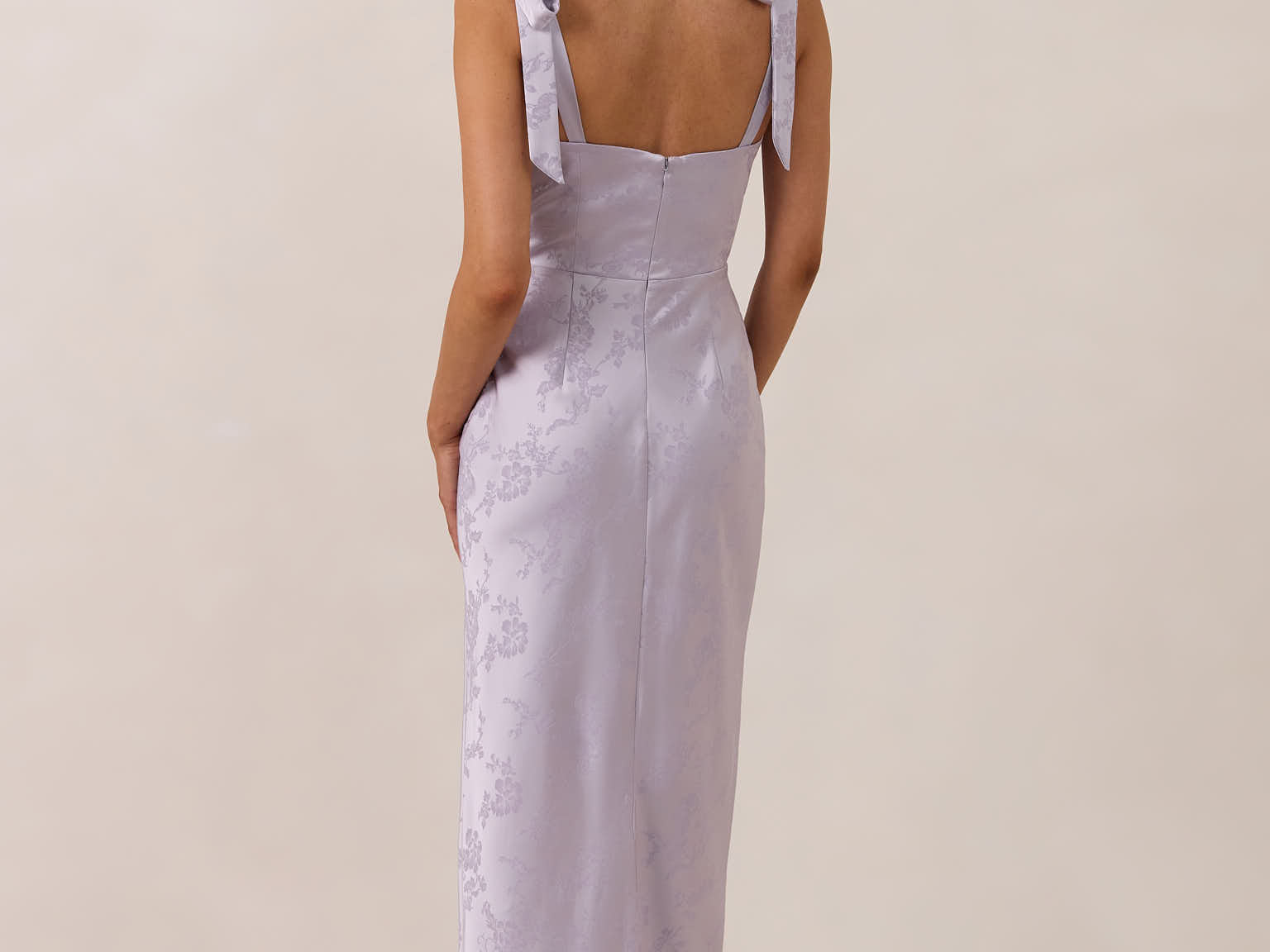 Crafted from luxurious Jacquard satin, this dress features feminine tie straps and a flattering bias-cut skirt, offering a flattering silhouette with timeless appeal.