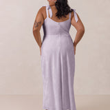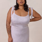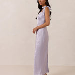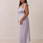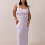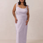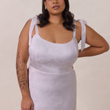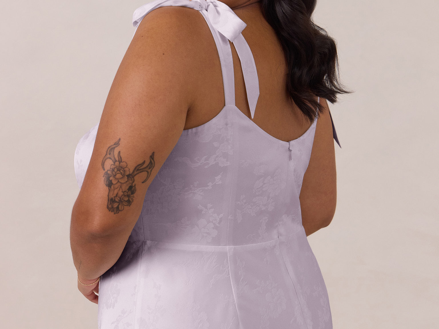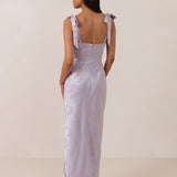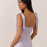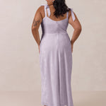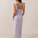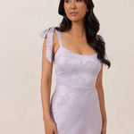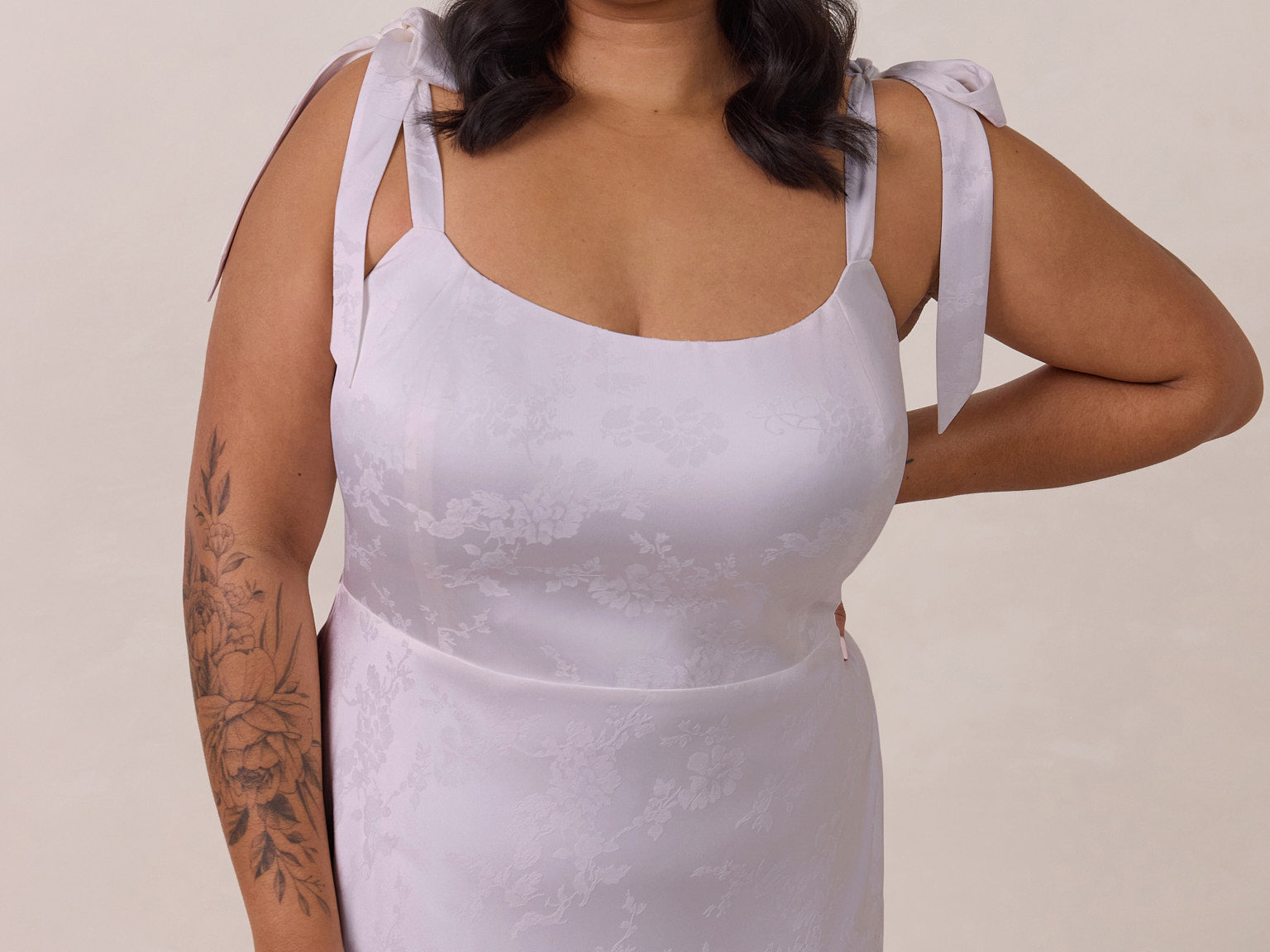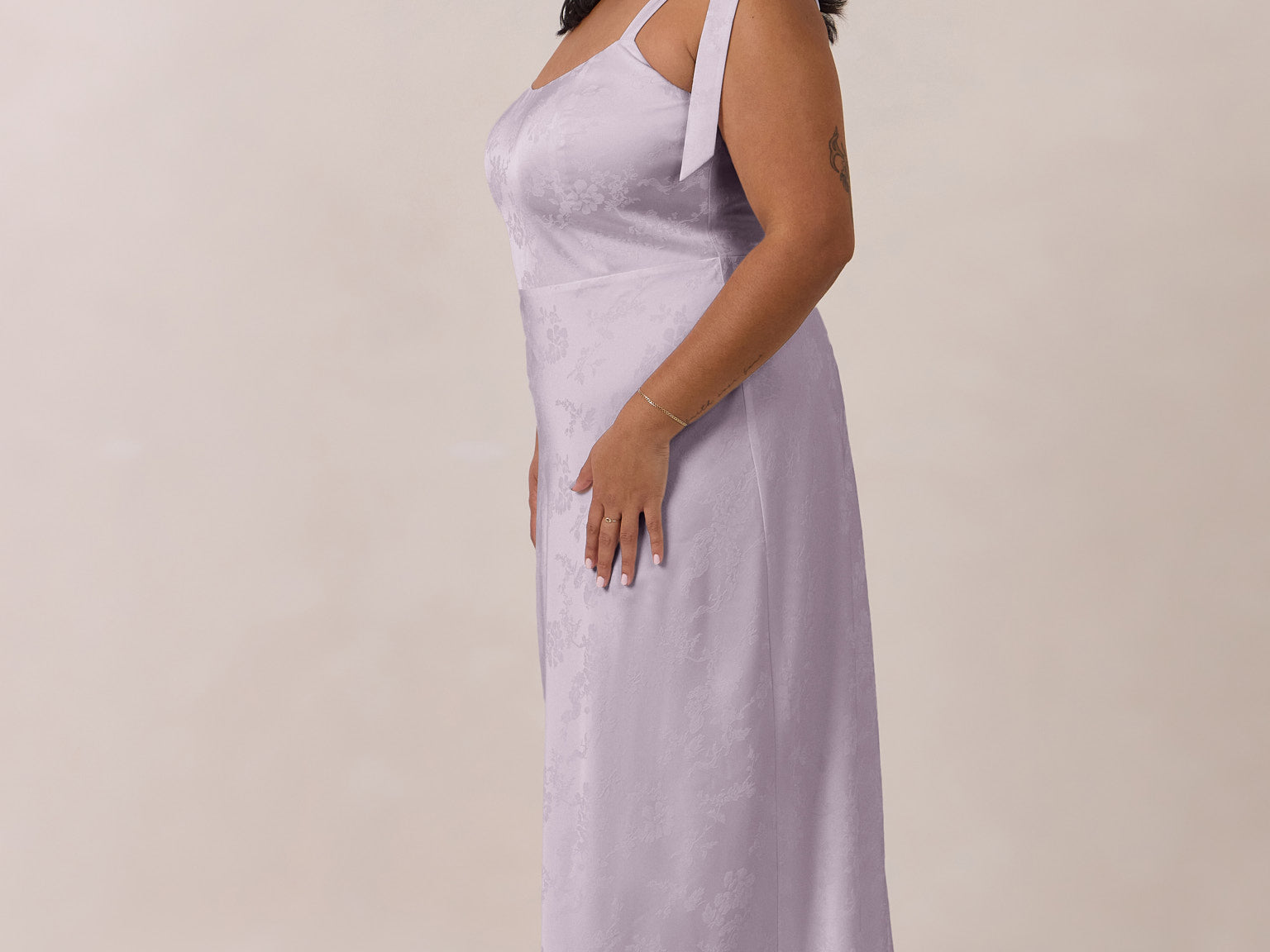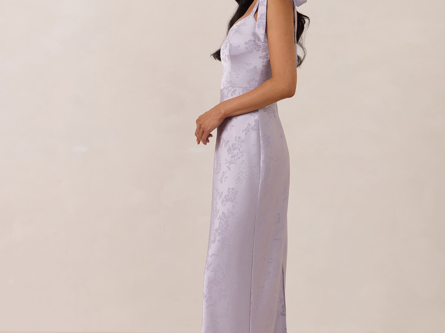 Crafted from luxurious Jacquard satin, this dress features feminine tie straps and a flattering bias-cut skirt, offering a flattering silhouette with timeless appeal.
