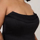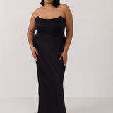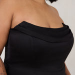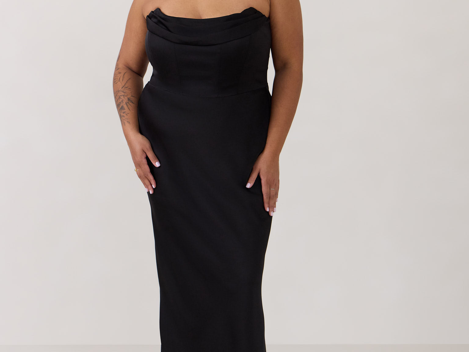 An elegant strapless design with a modern edge, this dress features an exaggerated pointed neckline and a boned bodice for a structured, flattering fit. The bias-cut skirt creates a smooth, elongating silhouette, while the full-length design makes it perfect for galas and formal occasions.