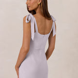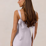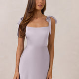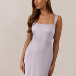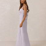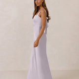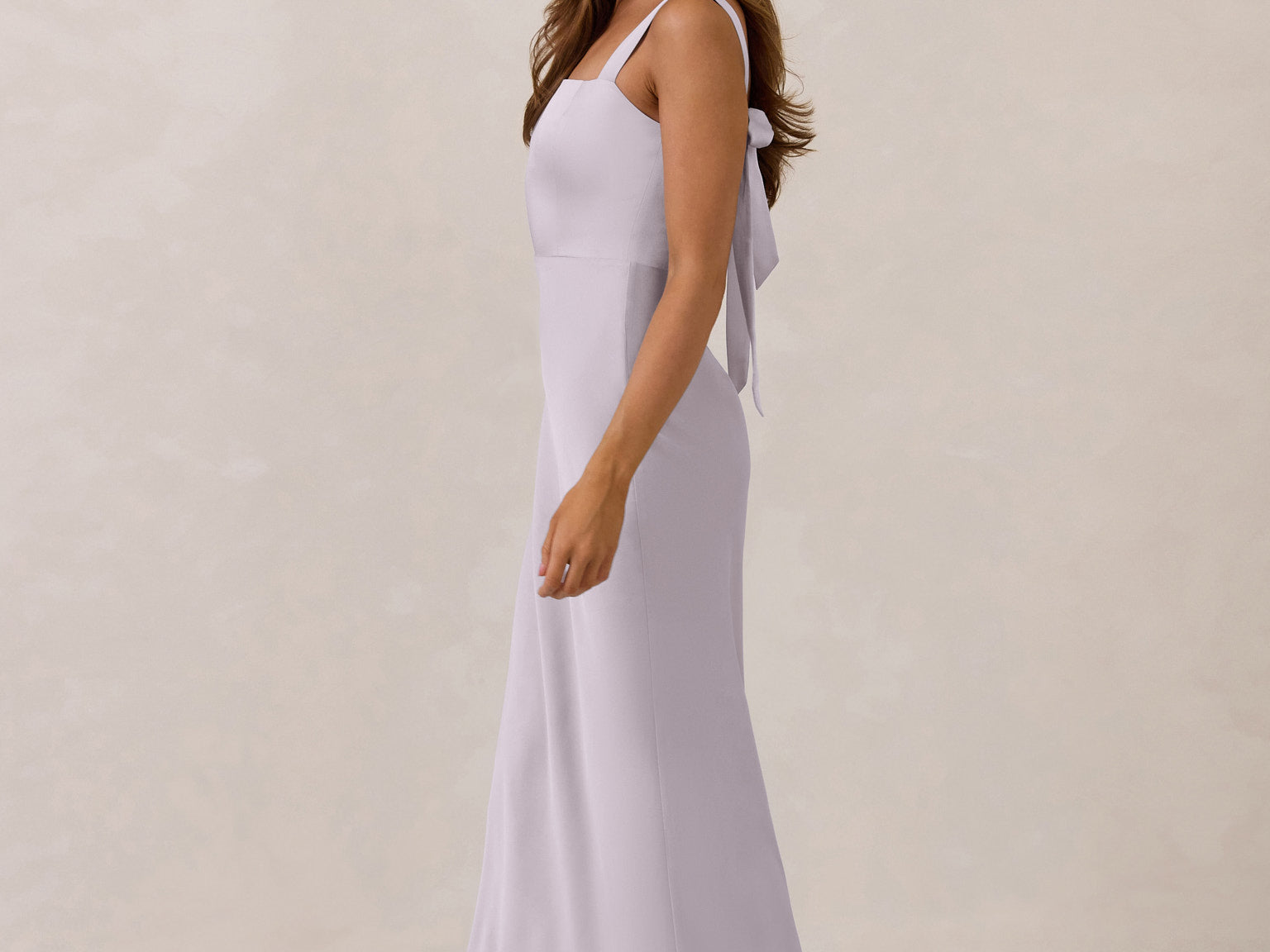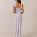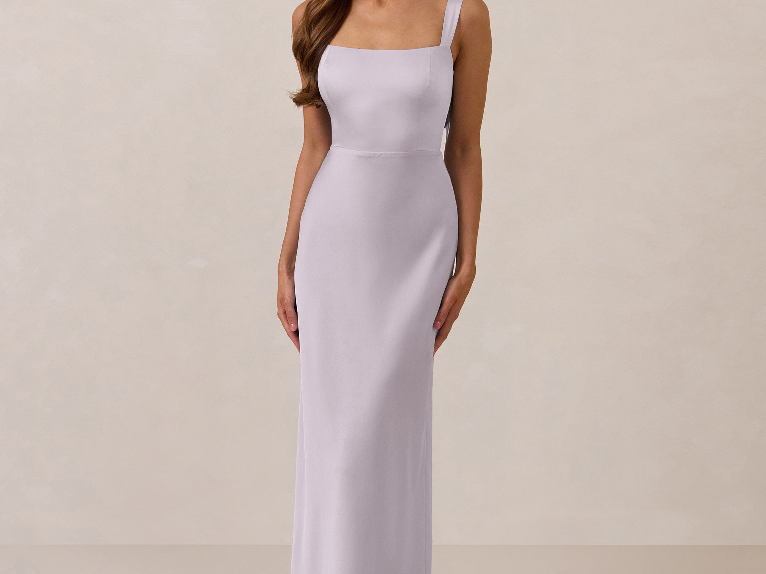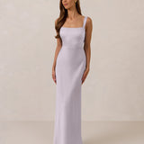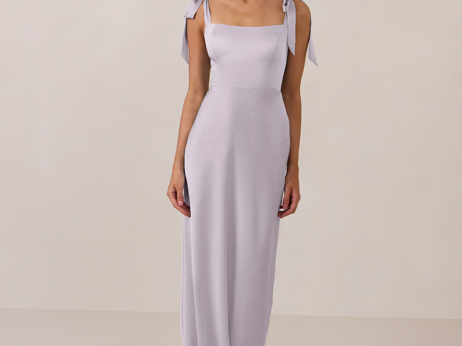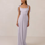 This full-length dress, made from luxurious satin, features a sleek square neckline and thick tie straps, offering a structured yet effortless aesthetic. The slim-fit skirt gently embraces the body, creating a smooth and elongated silhouette. An invisible back zipper ensures a seamless finish, making this dress ideal for sophisticated evening events.