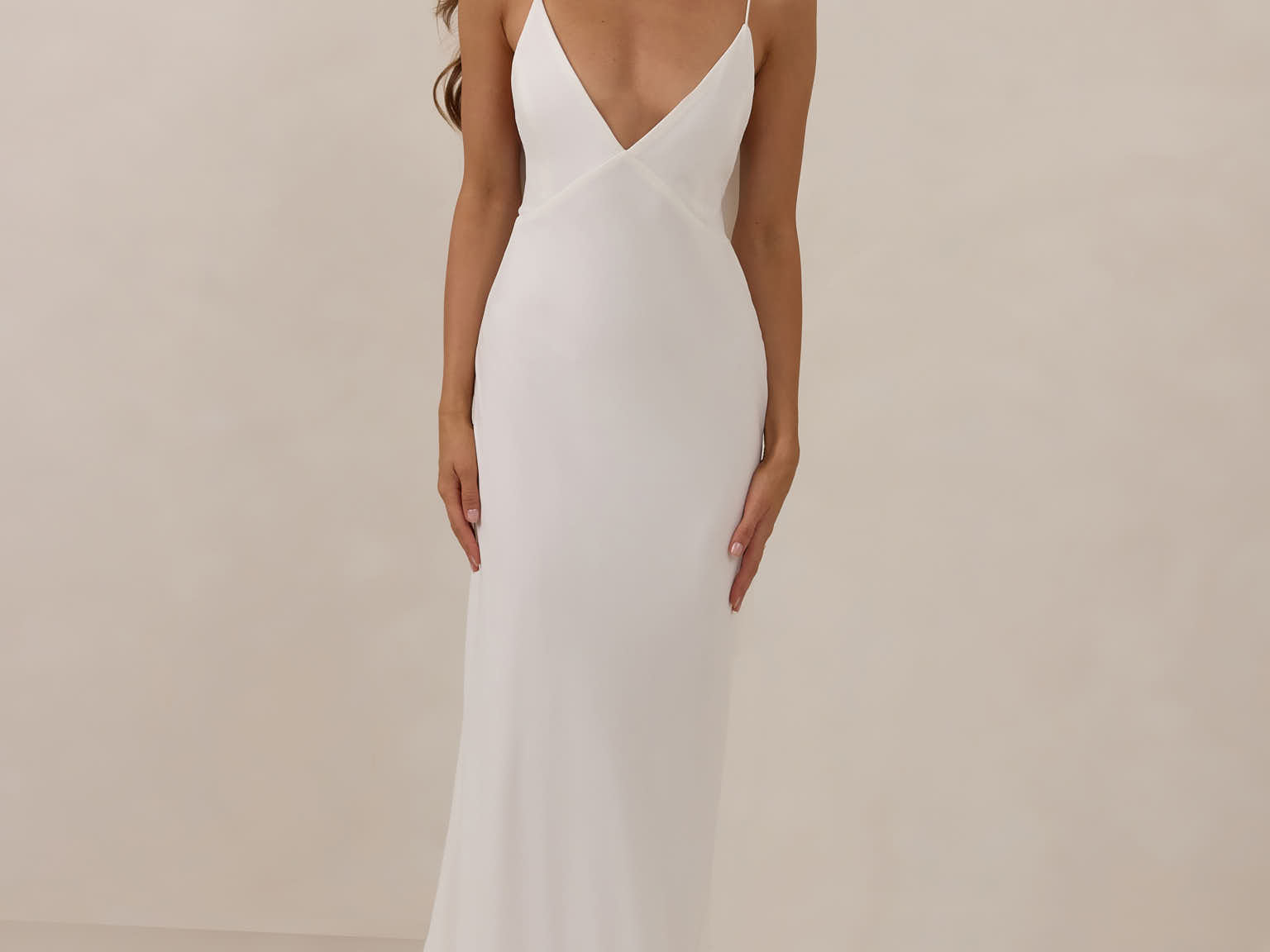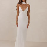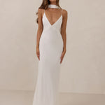 The Alexandra Dress is a vision in soft chiffon. Designed for the contemporary bride, this dress features a plunging V-neckline that flatters the neckline, paired with an open back for a striking silhouette that captivates from every angle.