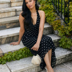 Effortlessly chic halter neck design crafted from soft chiffon that can be worn either as a halter or with a scarf detail. Featuring a bias-cut tea length skirt, this dress offers a flattering, flowing silhouette that moves with ease. Perfect for any occasion, this dress combines sophistication with practicality.