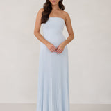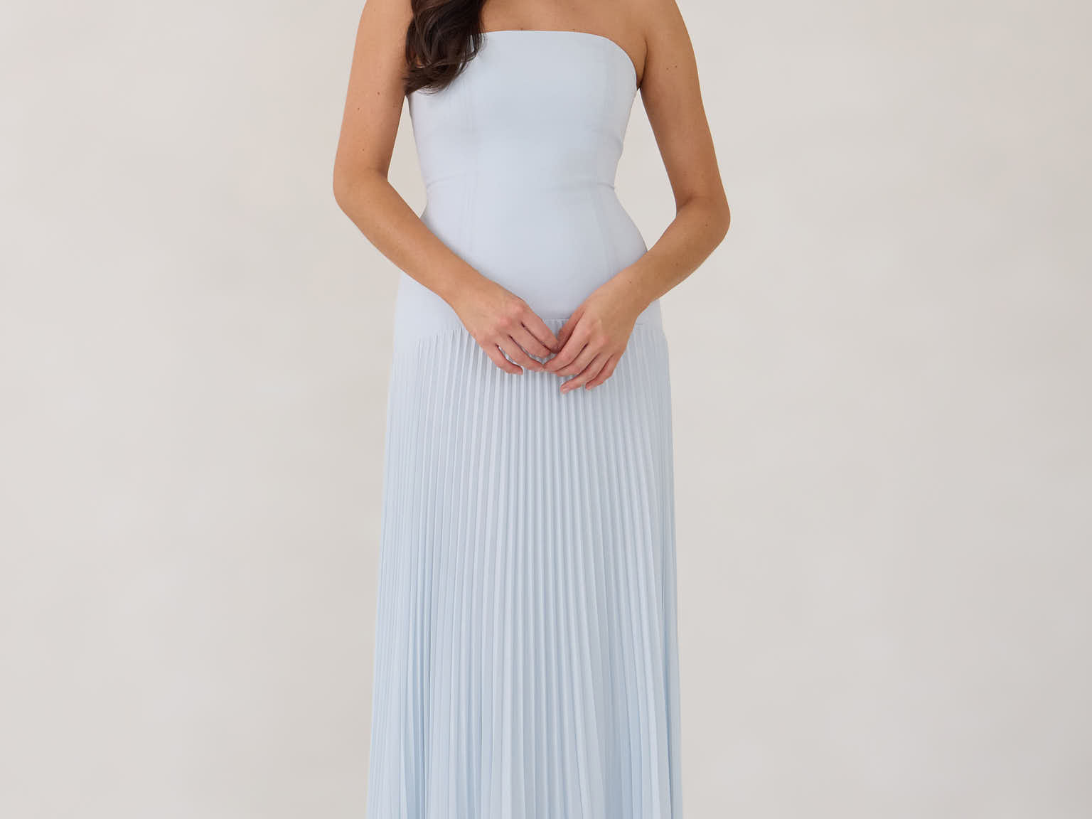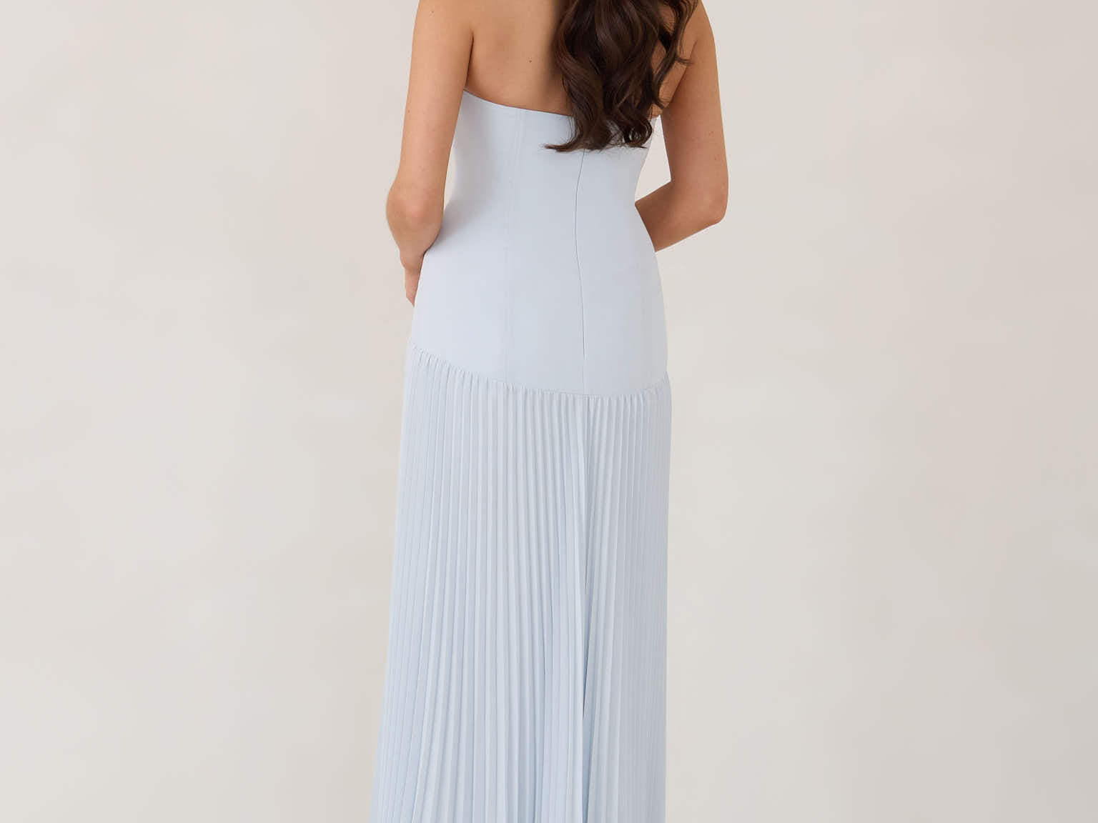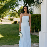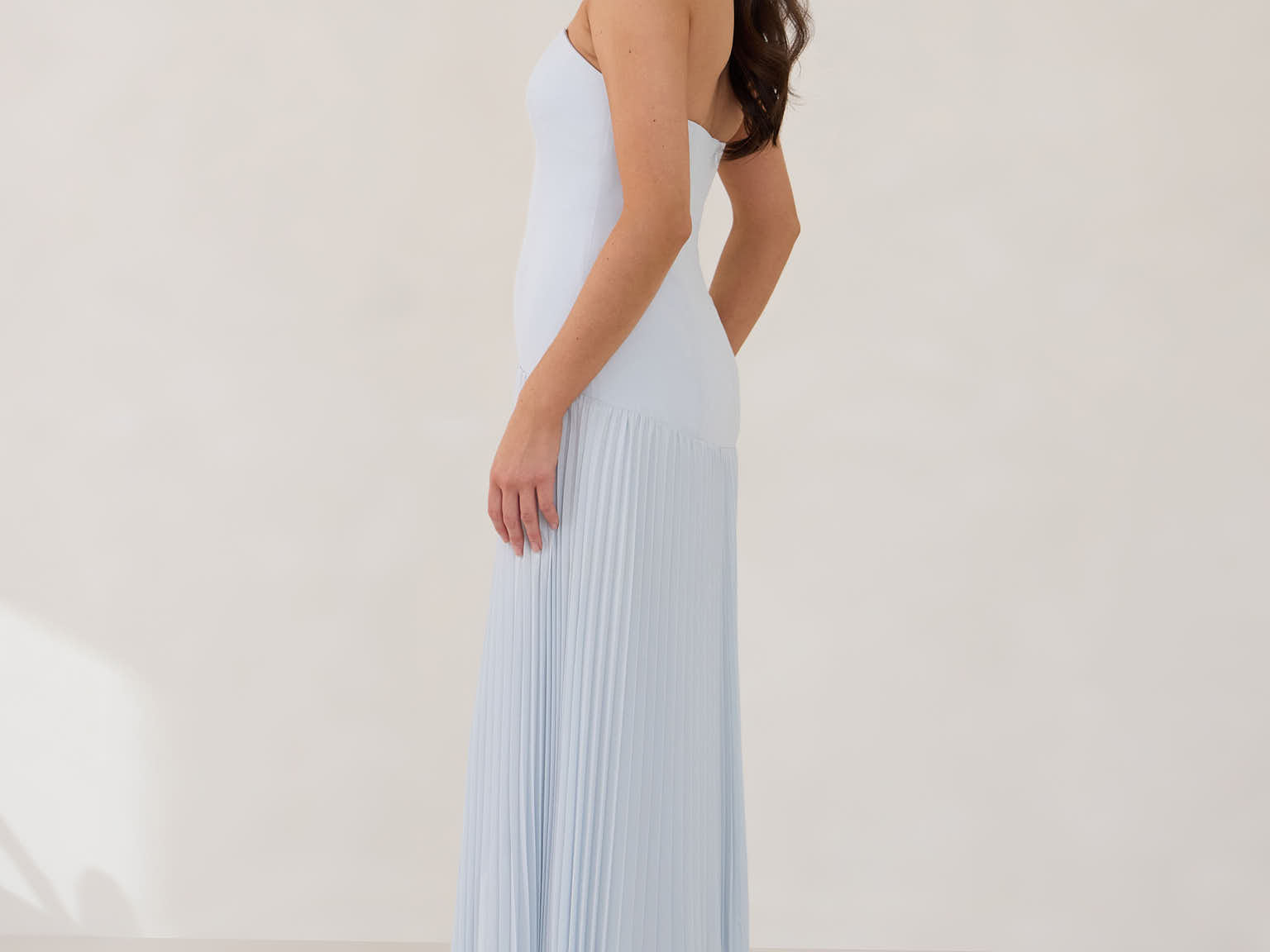 The contrast of the sleek bodice and the pleated skirt make this dress a real stunner. With boning through the bodice and into the dropped waist, and a light flowy skirt, you’ll be all set to dance the night away - twirls included.