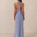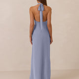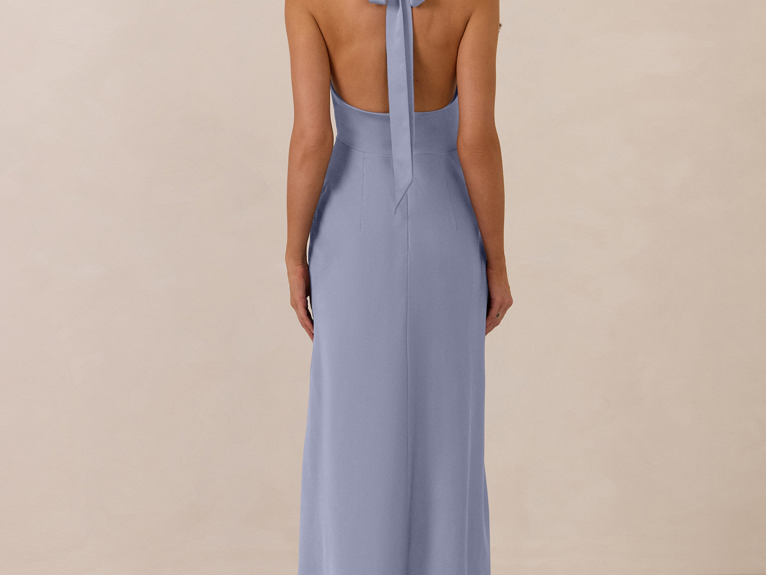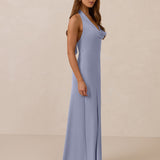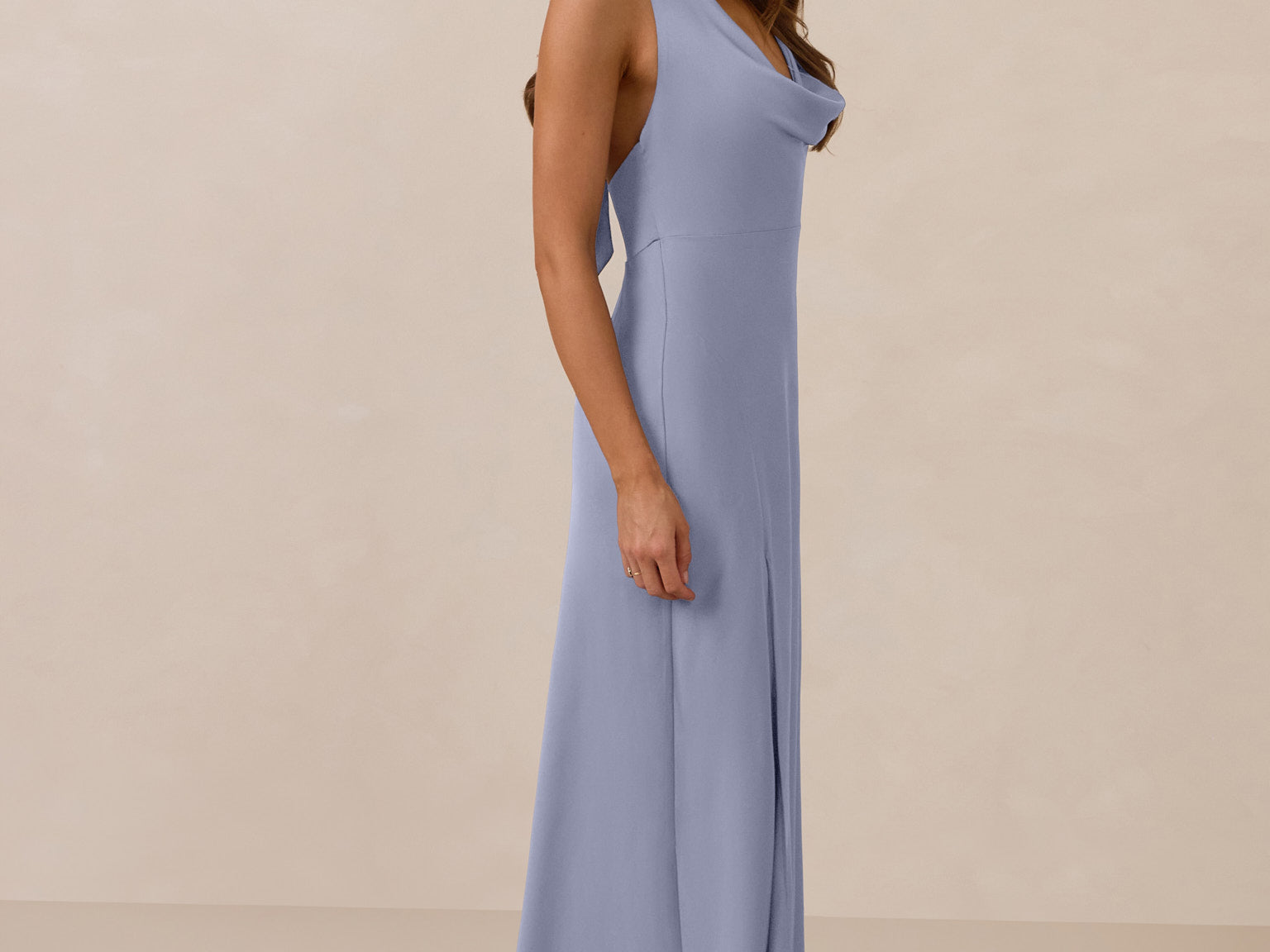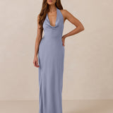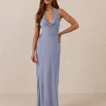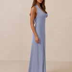 Effortlessly elegant, this bias-cut satin maxi dress features a fluid skirt with a curved thigh-high slit and a draped cowl neckline. Delicate, adjustable cross-back straps complete the look. Perfect for any occasion, it's glossy and flattering.
