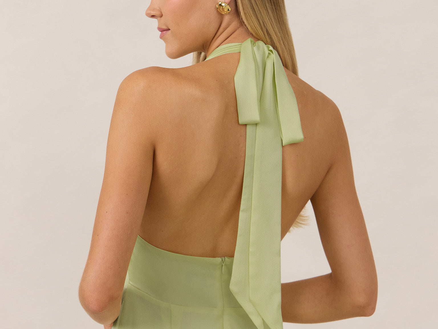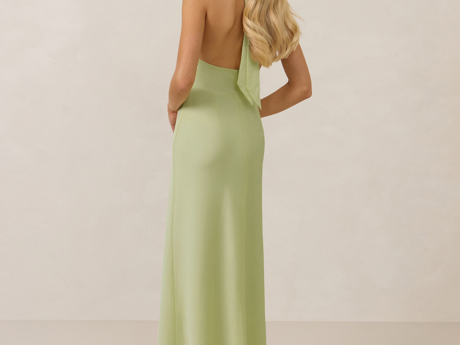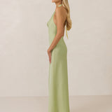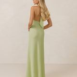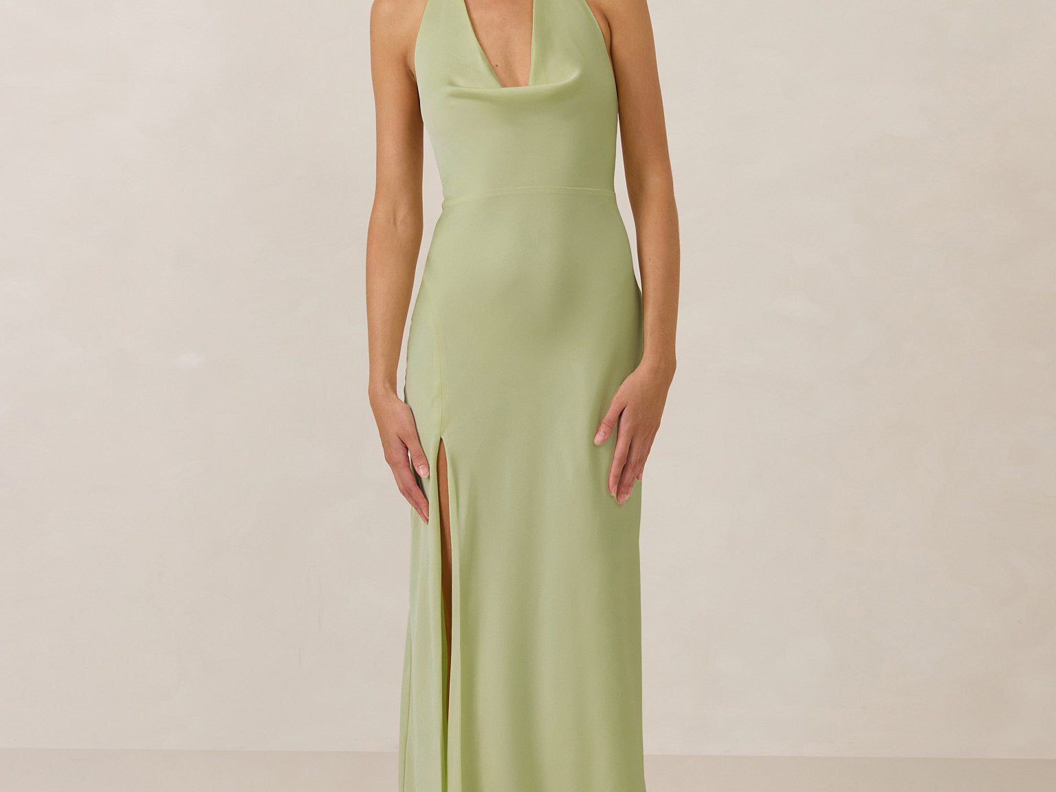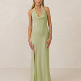Effortlessly elegant, this bias-cut satin maxi dress features a fluid skirt with a curved thigh-high slit and a draped cowl neckline. Delicate, adjustable cross-back straps complete the look. Perfect for any occasion, it's glossy and flattering.