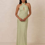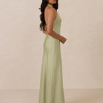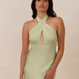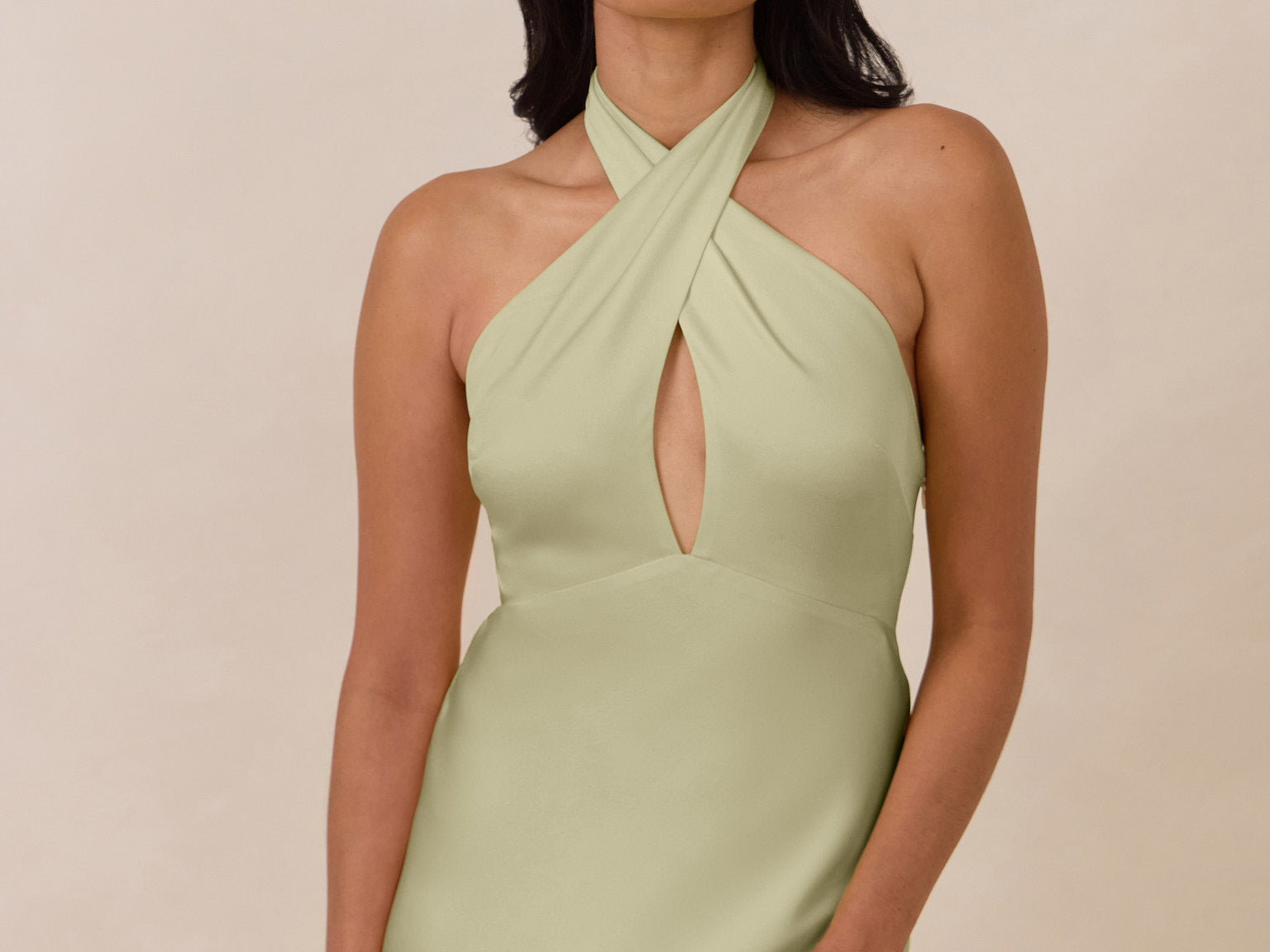 The Emery dress redefines timeless elegance with a contemporary twist. Crafted from our signature bubble satin, this full-length dress features a flattering cross-front halter neckline, creating soft drapes and a delicate keyhole detail for a touch of allure. The bias-cut skirt gracefully skims the body, ensuring comfort and a flawless silhouette that you'll want to wear repeatedly.