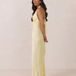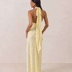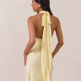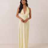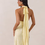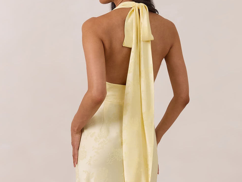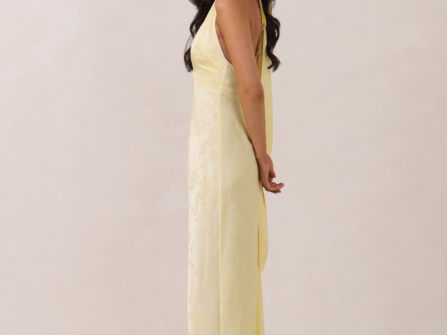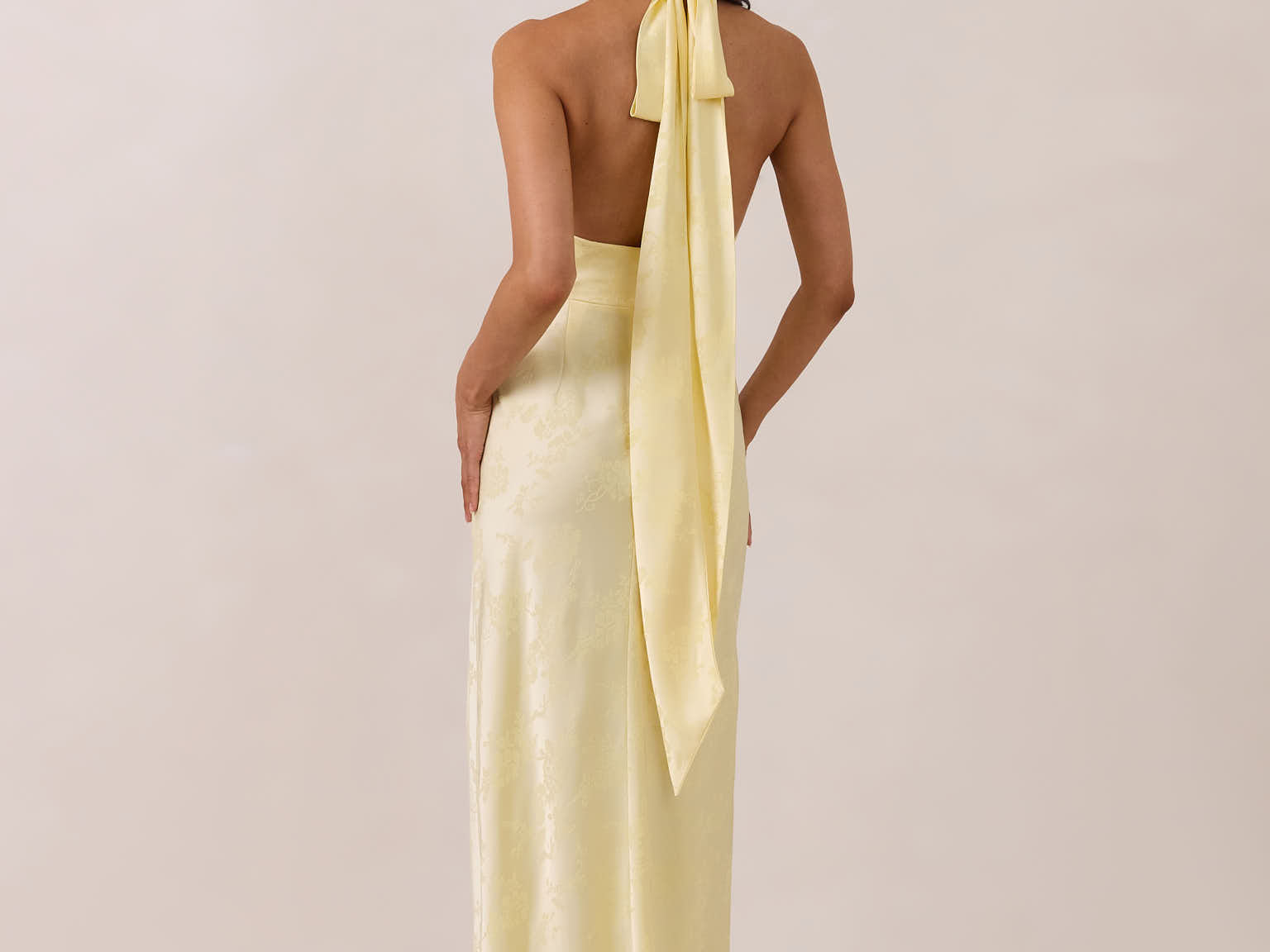A sleek and versatile silhouette crafted in luxurious Jacquard for a touch of texture and sophistication. Designed for effortless elegance, it features a halter neckline with a dramatic open back and long ties that can be styled as a scarf or knotted for a custom halter look. The bias-cut skirt flows beautifully into a flattering maxi length, creating graceful movement with every step.