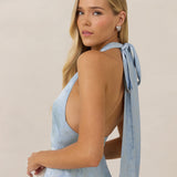 A sleek and versatile silhouette crafted in luxurious Jacquard for a touch of texture and sophistication. Designed for effortless elegance, it features a halter neckline with a dramatic open back and long ties that can be styled as a scarf or knotted for a custom halter look. The bias-cut skirt flows beautifully into a flattering maxi length, creating graceful movement with every step.