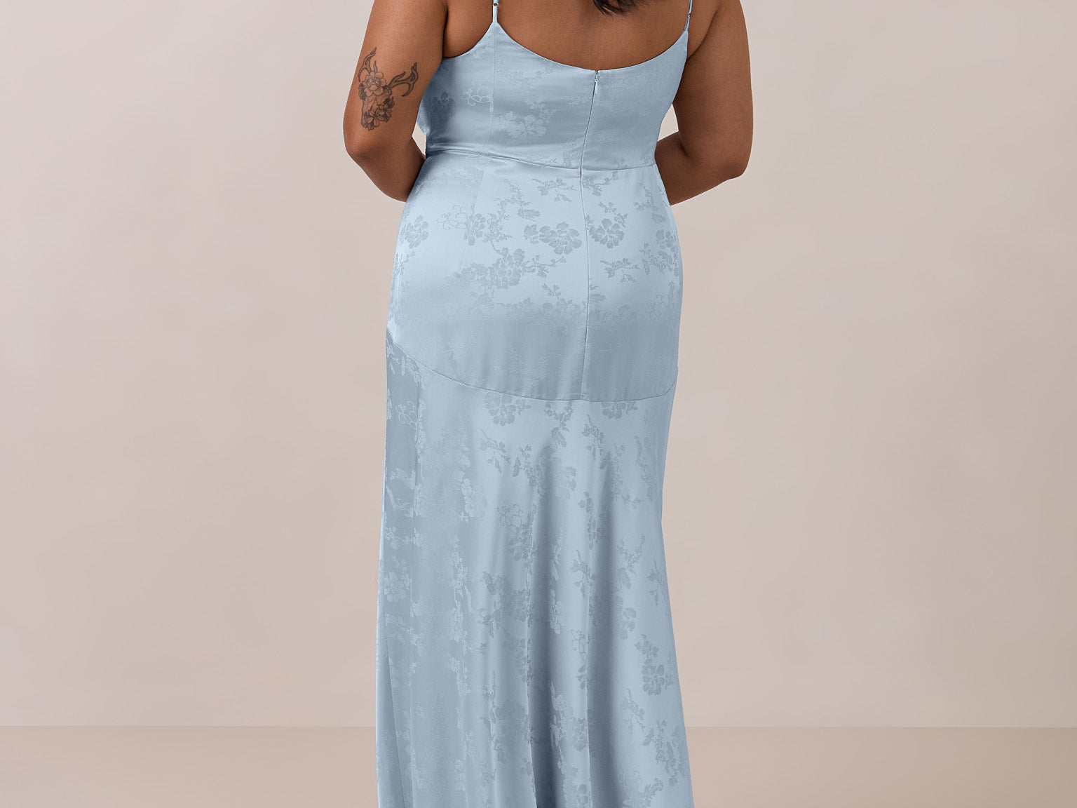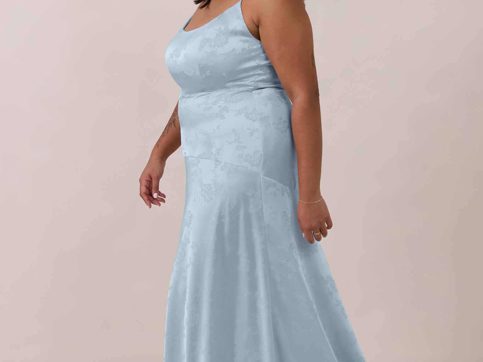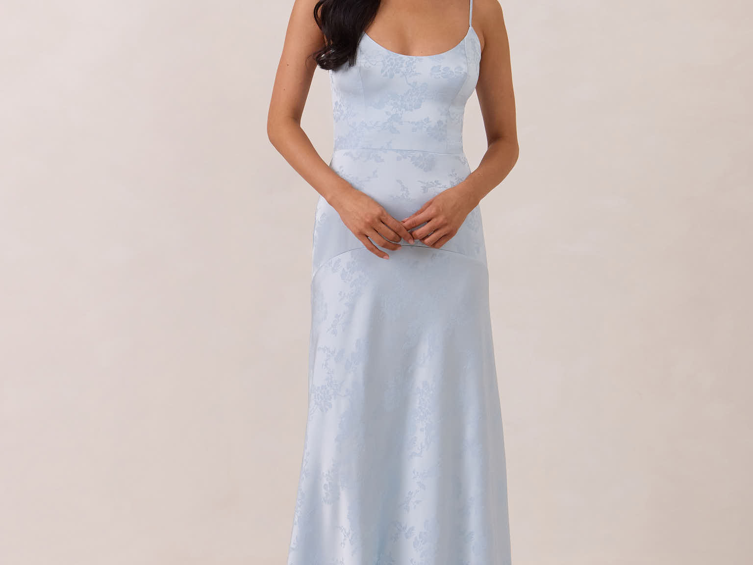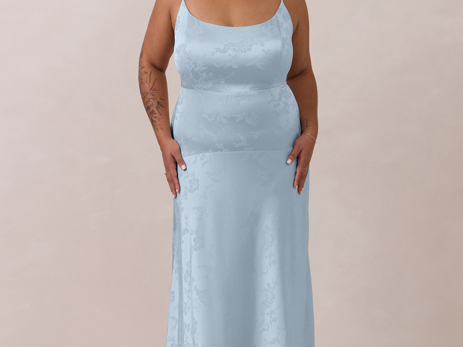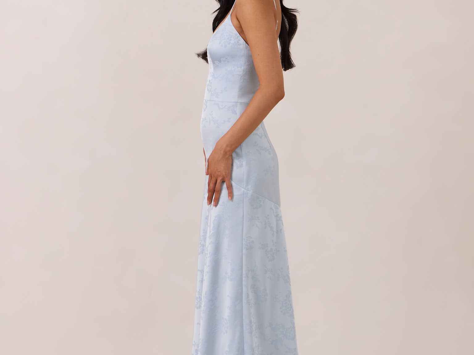 Crafted from luxurious Jacquard satin, this full-length dress features adjustable straps and a flattering drop waist, creating an elegant silhouette with timeless appeal. The scoop neckline and back add a delicate, feminine touch, while the bias-cut skirt flows gracefully to the floor, combining sophistication and comfort for a truly captivating look.