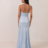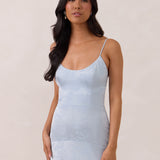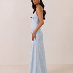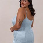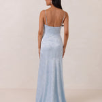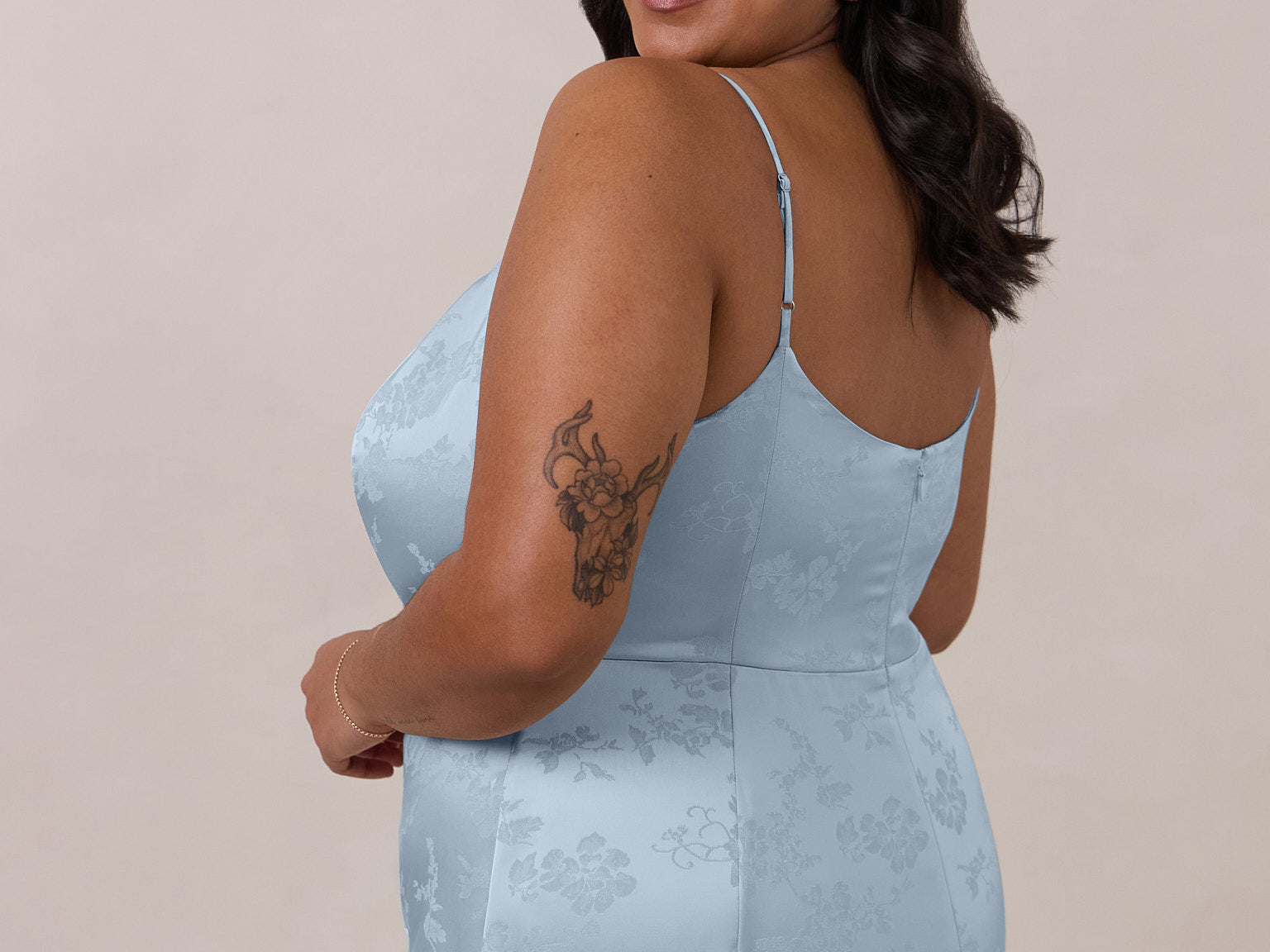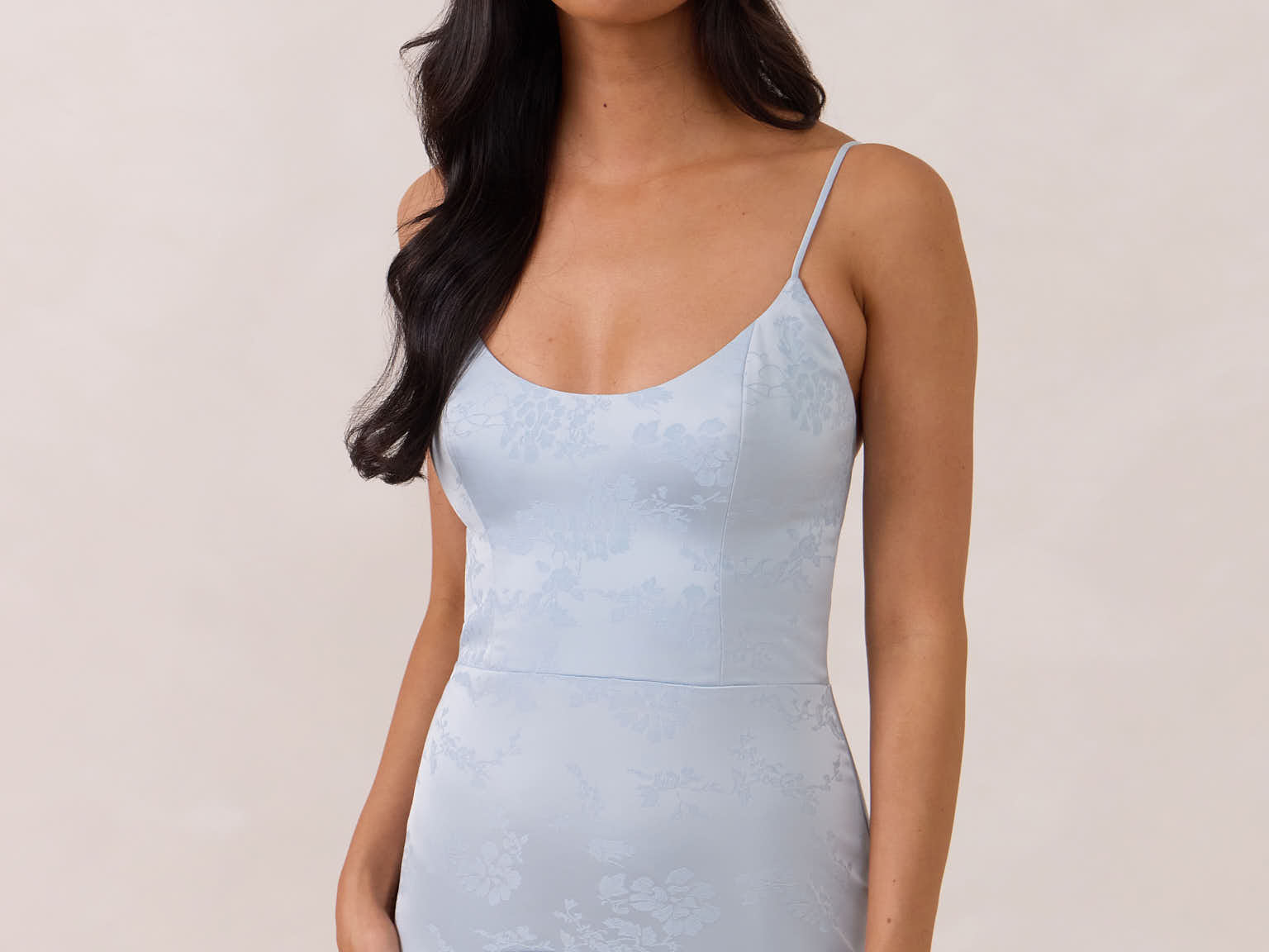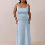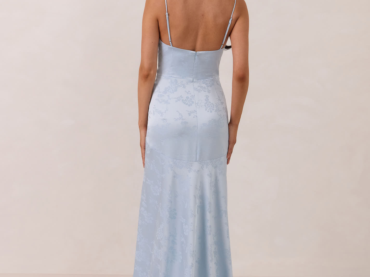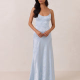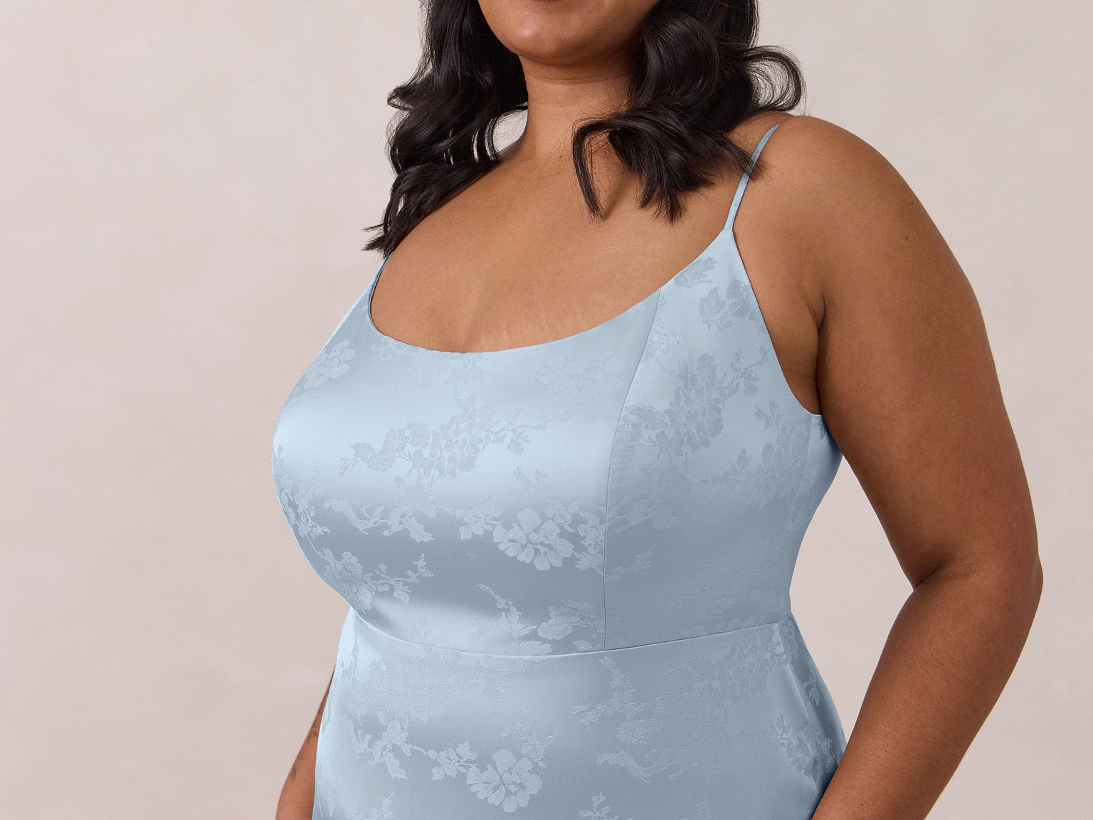 Crafted from luxurious Jacquard satin, this full-length dress features adjustable straps and a flattering drop waist, creating an elegant silhouette with timeless appeal. The scoop neckline and back add a delicate, feminine touch, while the bias-cut skirt flows gracefully to the floor, combining sophistication and comfort for a truly captivating look.