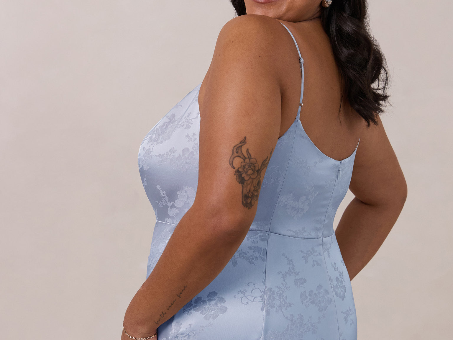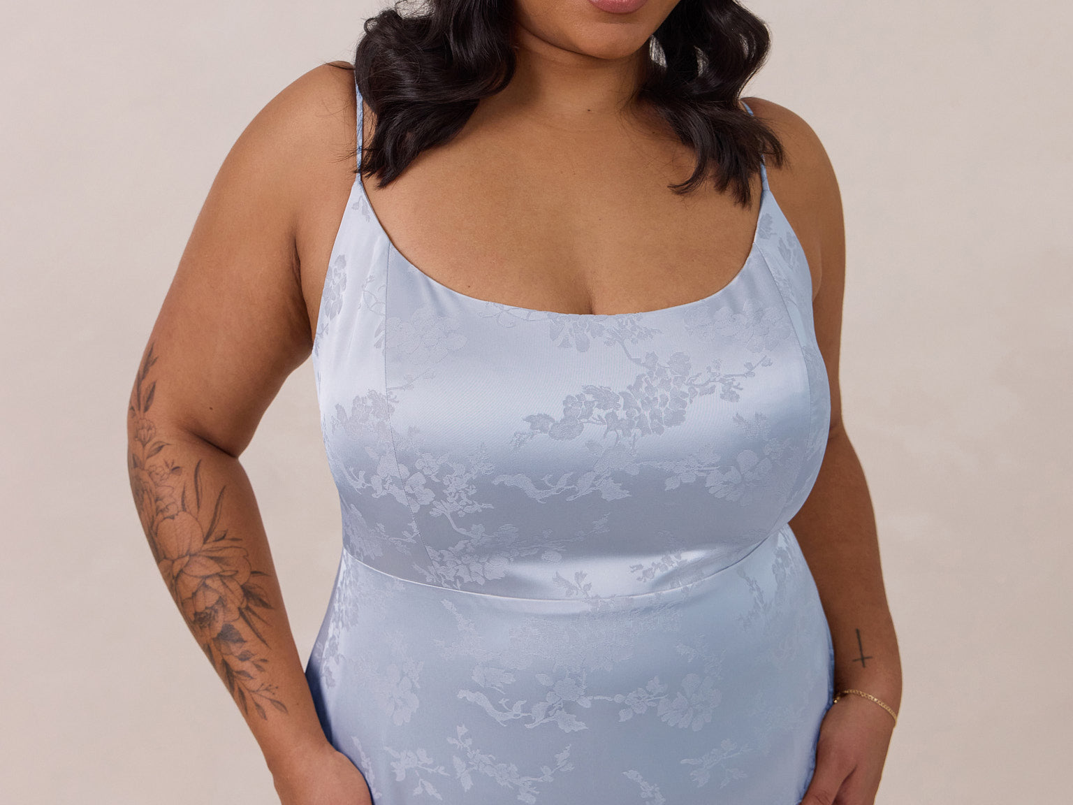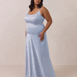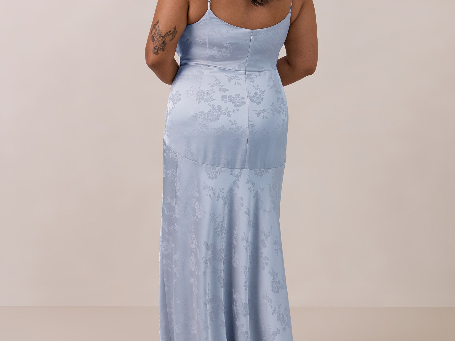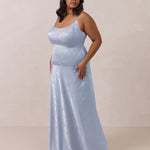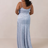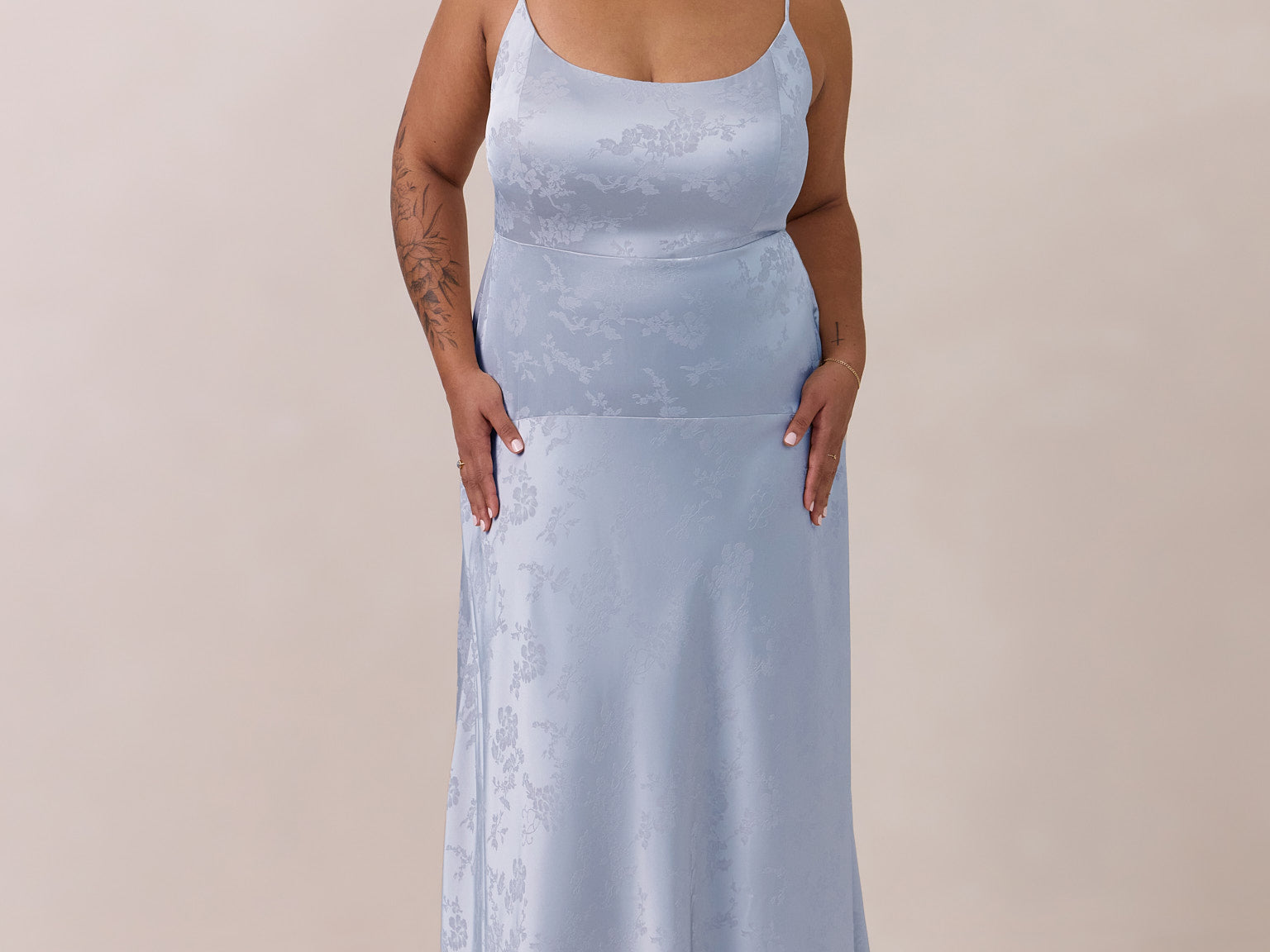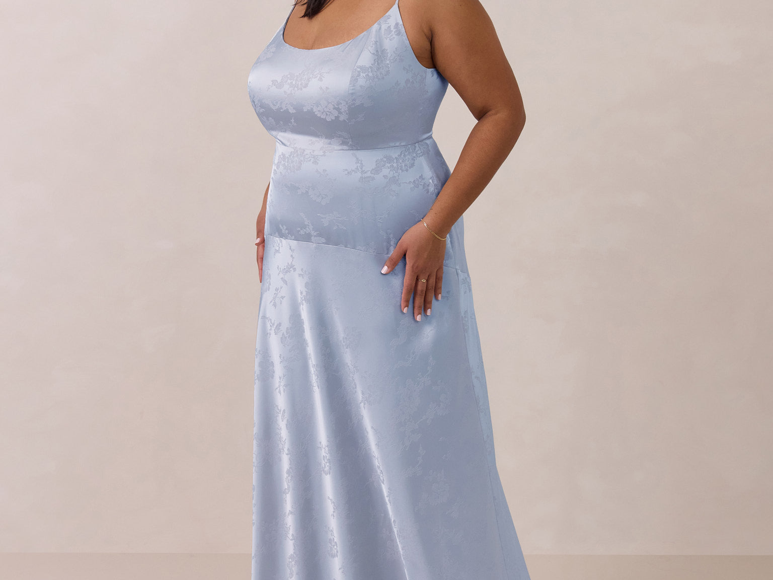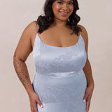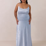 Crafted from luxurious Jacquard satin, this full-length dress features adjustable straps and a flattering drop waist, creating an elegant silhouette with timeless appeal. The scoop neckline and back add a delicate, feminine touch, while the bias-cut skirt flows gracefully to the floor, combining sophistication and comfort for a truly captivating look.