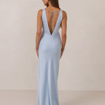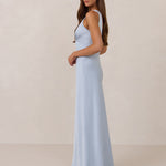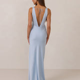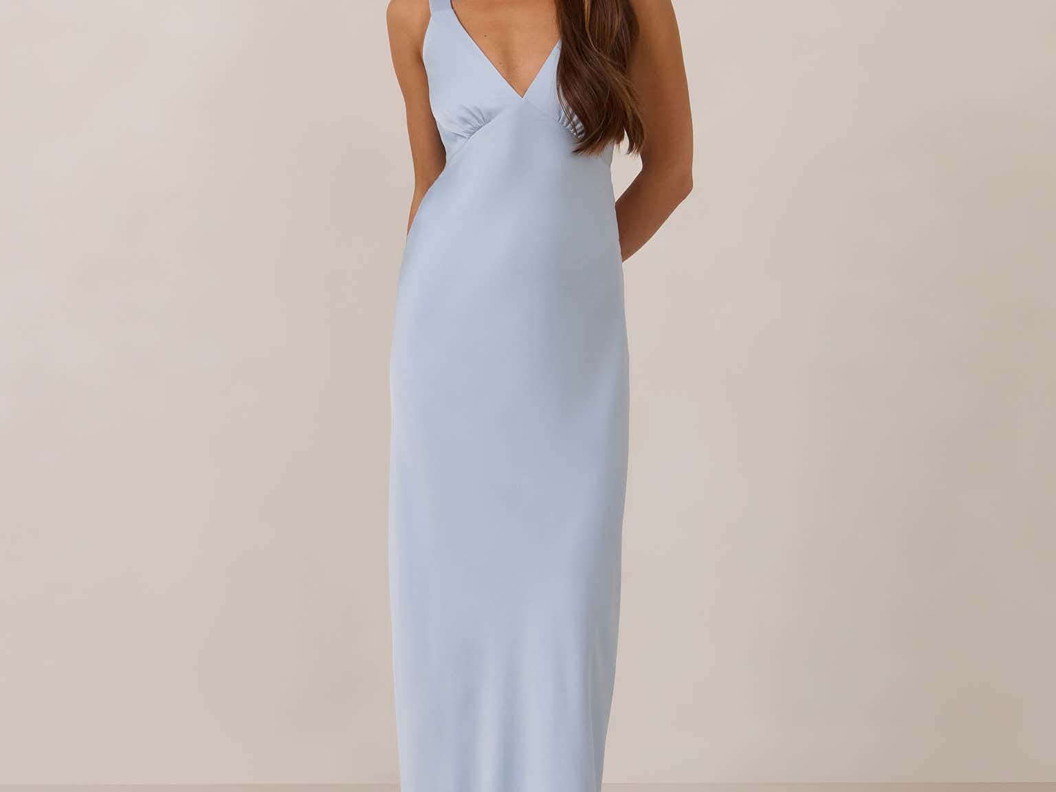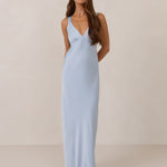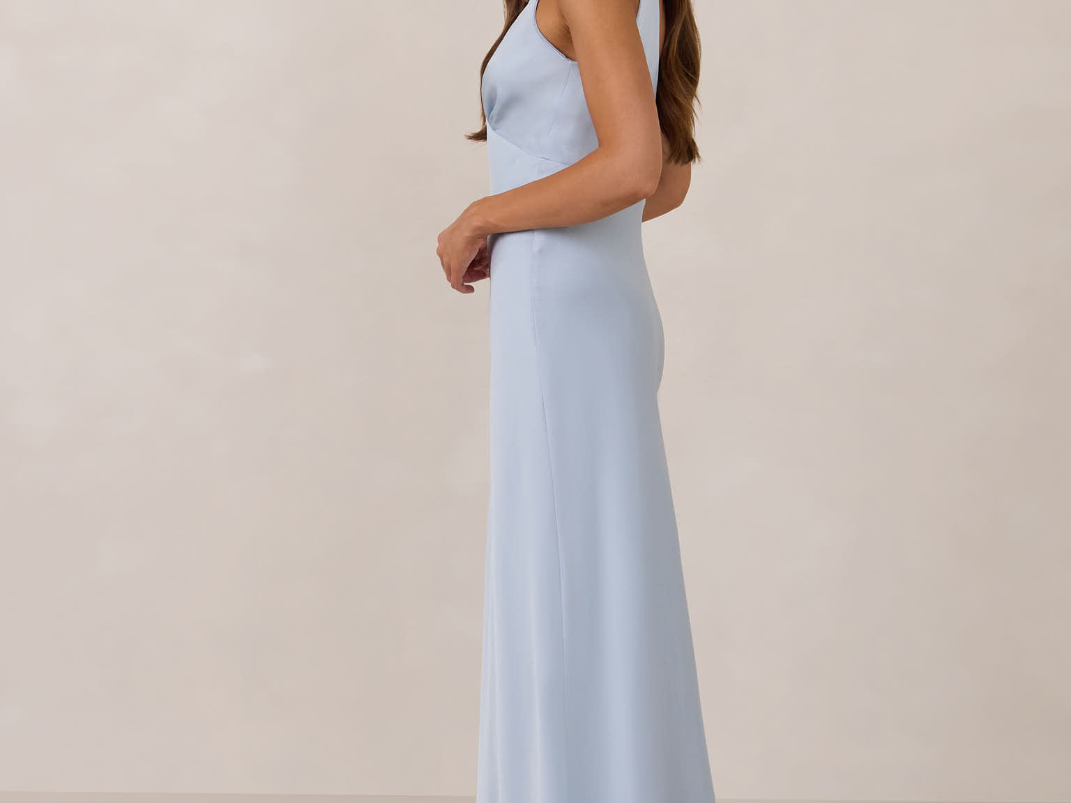 Featuring a flattering V-neckline, gathering at the bust, and an open back, this bias-cut dress offers a sleek, elongating silhouette. The clean lines and minimalist design make it the perfect choice for any special occasion.