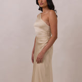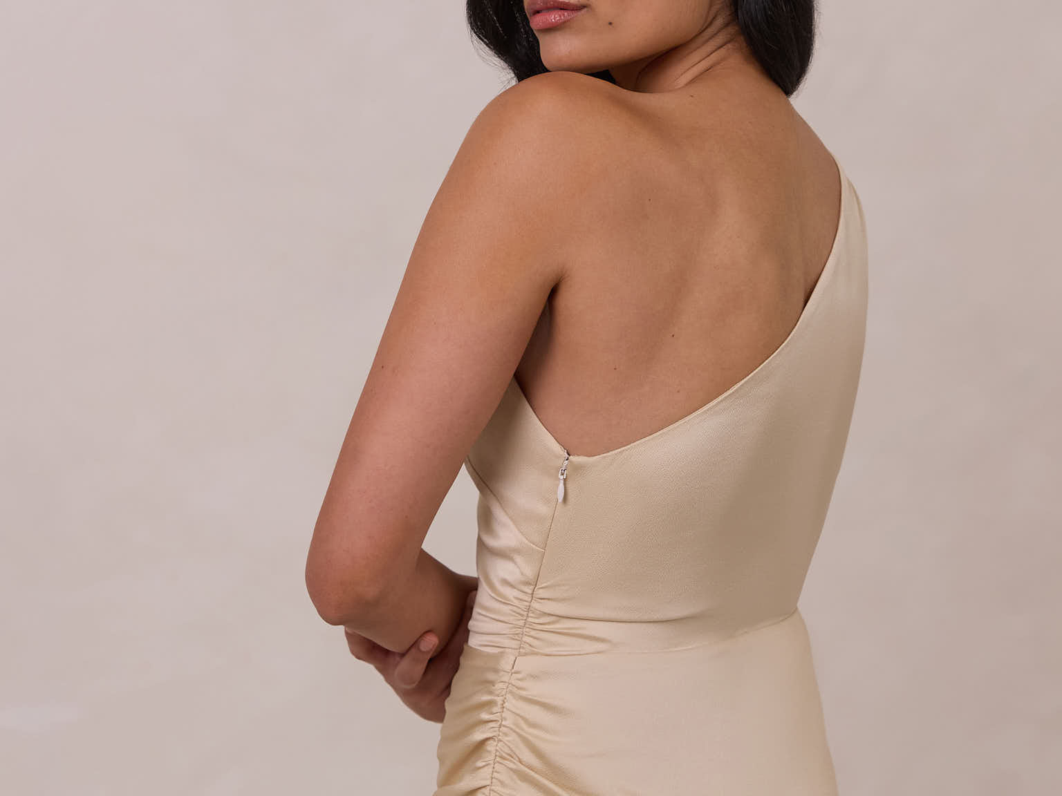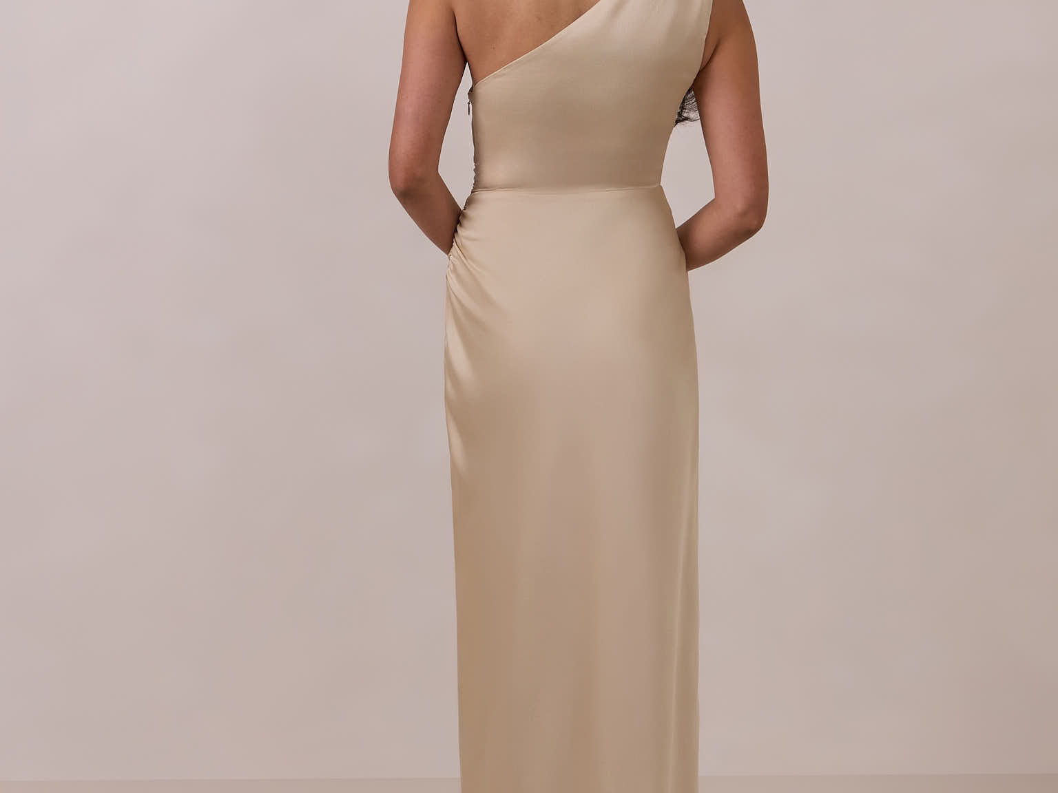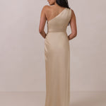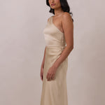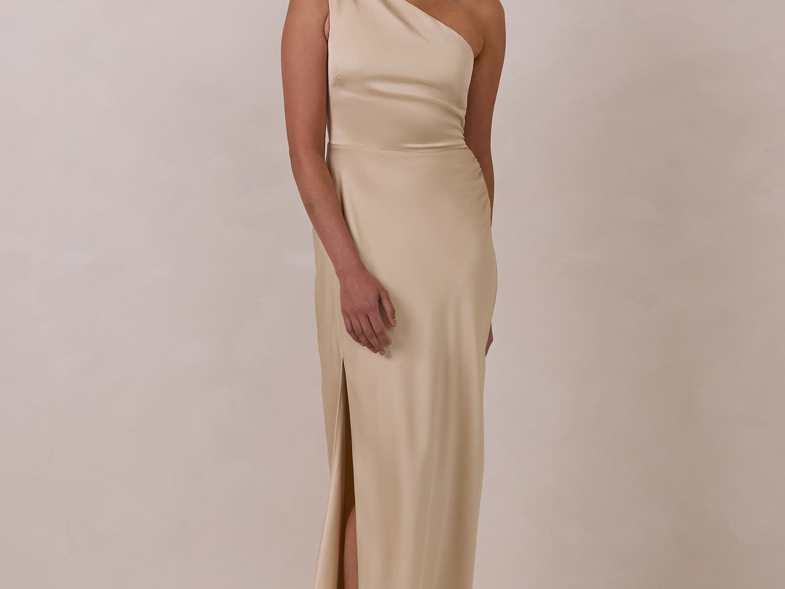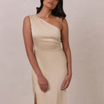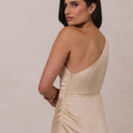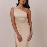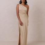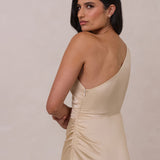 The Hartley dress offers modern minimalism and effortless charm. Made from soft, silky satin, this full-length silhouette drapes beautifully. Delicate ruching on the one-shoulder strap and right side seam adds subtle texture and enhances the figure-hugging fit. A sleek side slit completes the look, offering just the right amount of movement and allure.