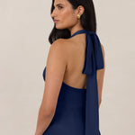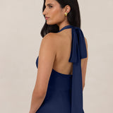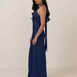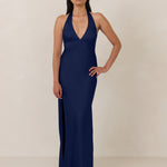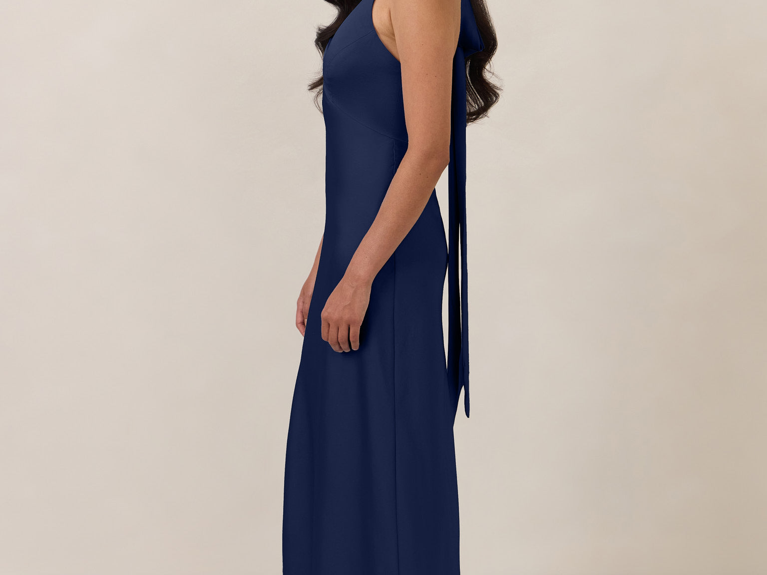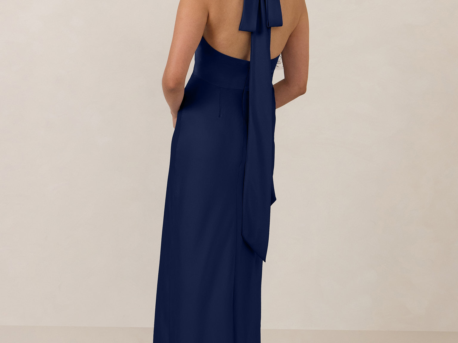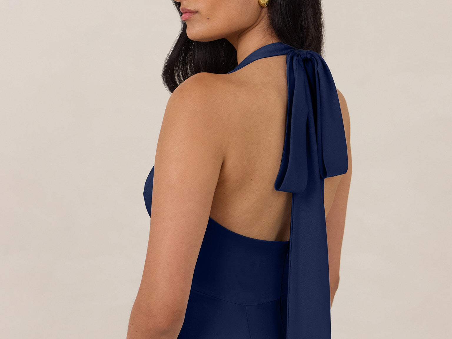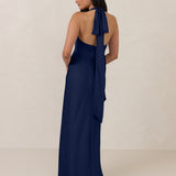Designed to turn heads. Crafted from our smooth satin, this bust-friendly halter style features long, versatile ties that can be styled in a bow or worn as a neck scarf for a modern touch. Finished with a bias-cut skirt and a subtle slit, this dress effortlessly balances elegance with a bold edge.