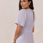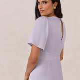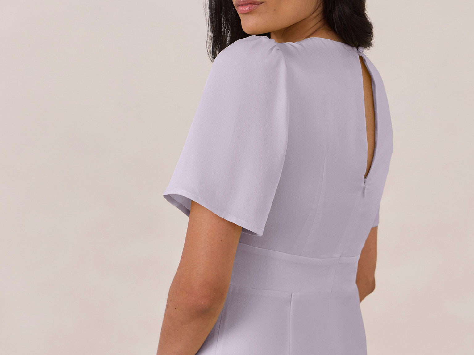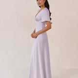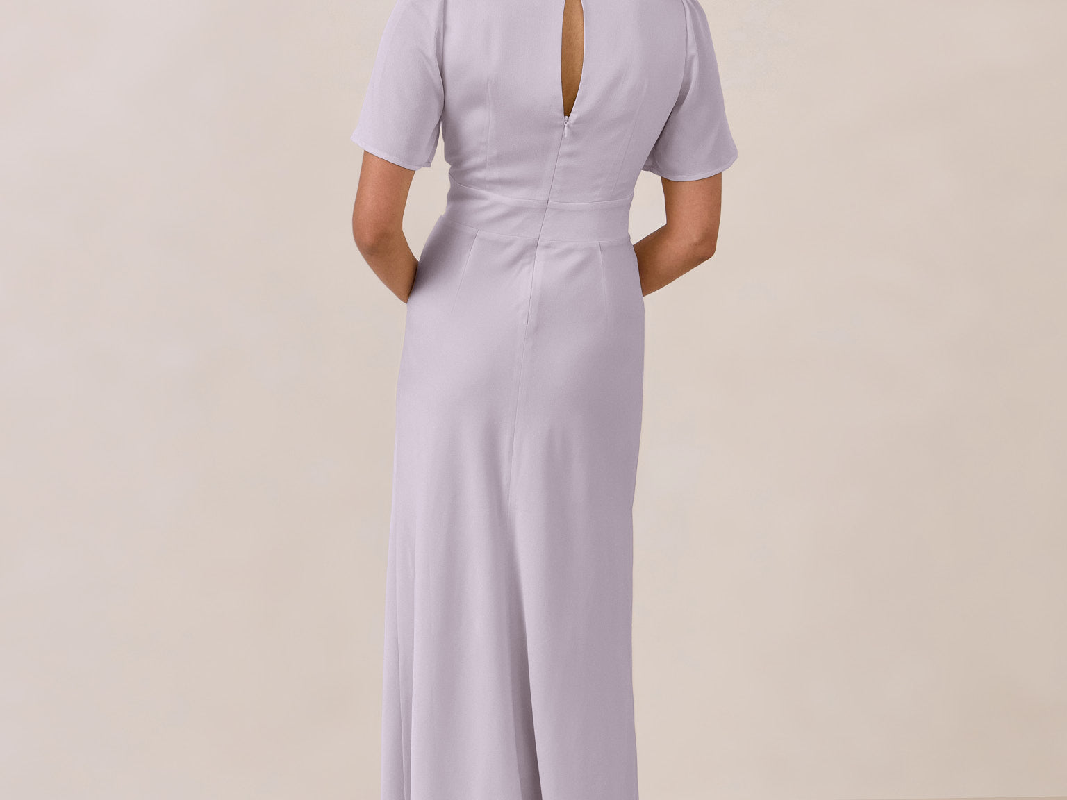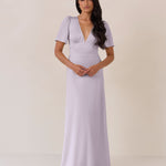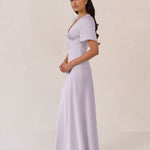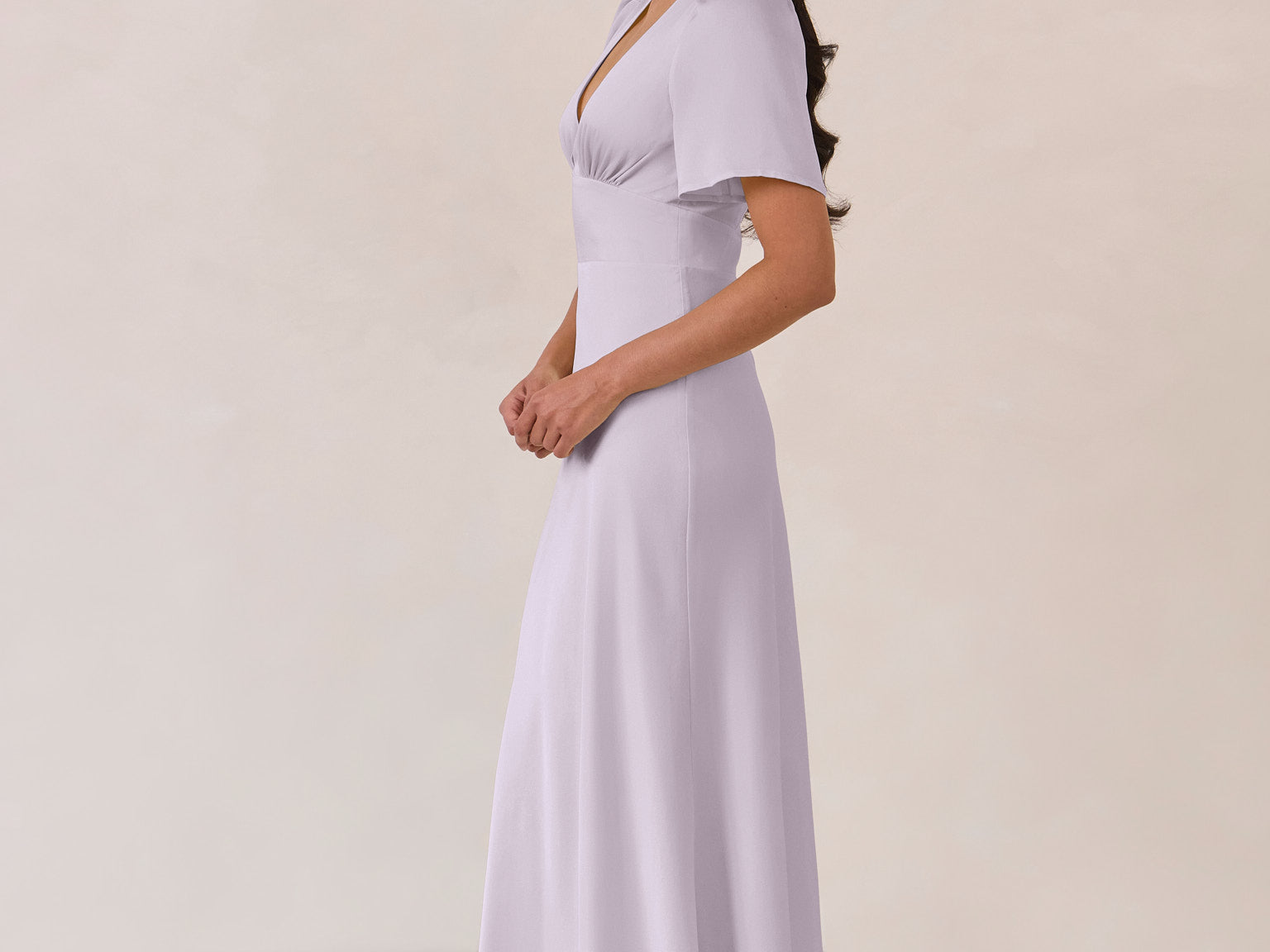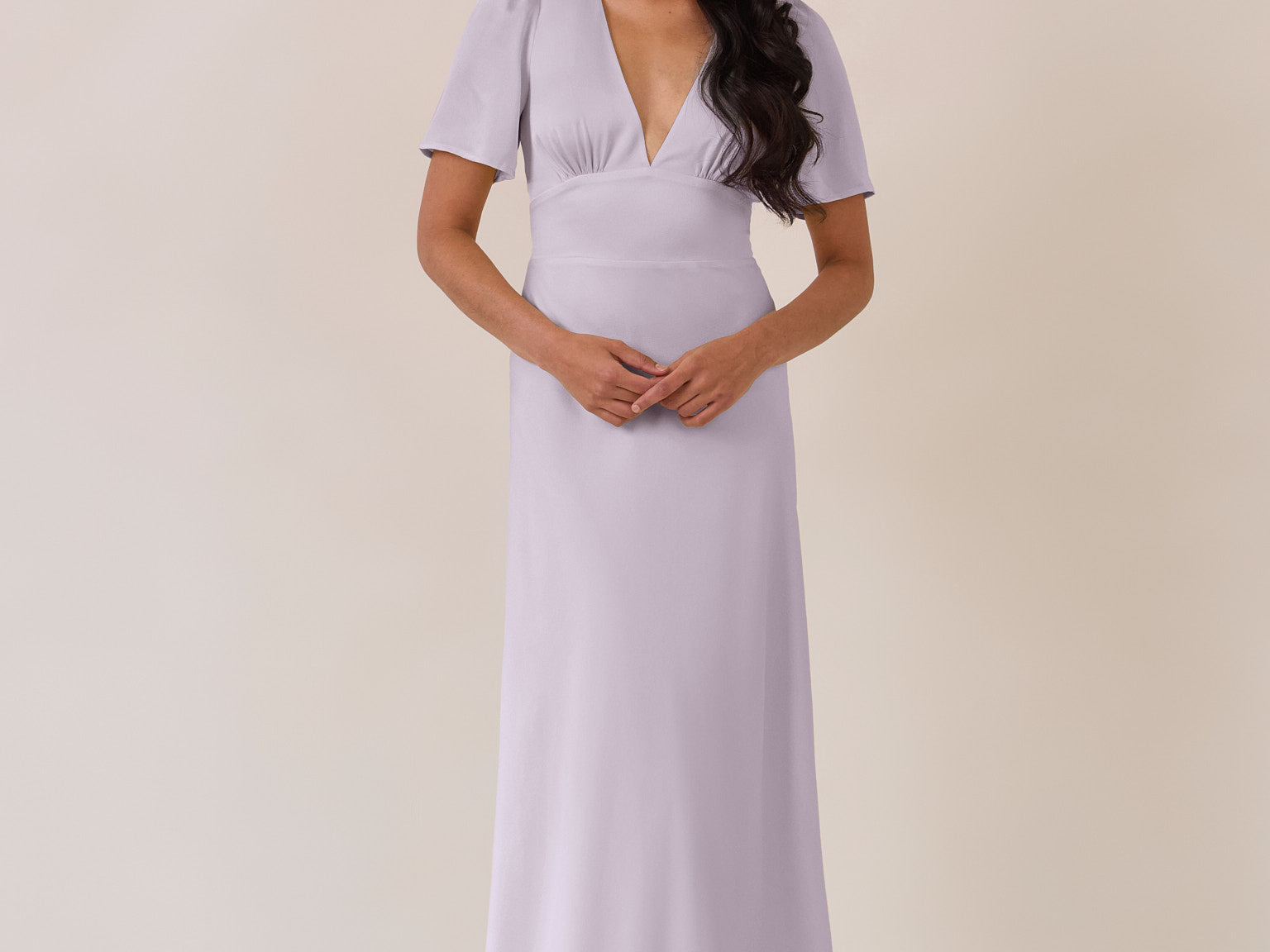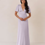 This full-length satin dress features a romantic V neckline, short sleeves, and a bias-cut skirt for an effortlessly feminine silhouette. A subtle keyhole back and delicate button closure add unexpected detail. Finished in silky satin with a soft, light-catching sheen.