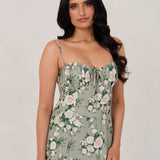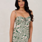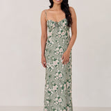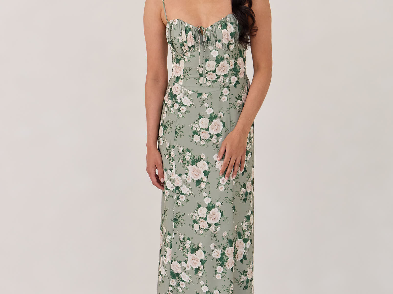 Designed with a basque waist and structured paneling, this dress offers a flattering, sculpted silhouette. The ruched bodice and shirred back give it a comfortable, flexible fit.