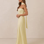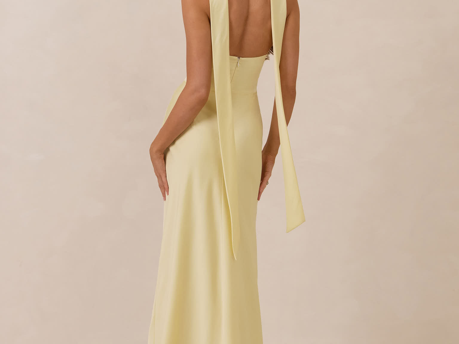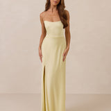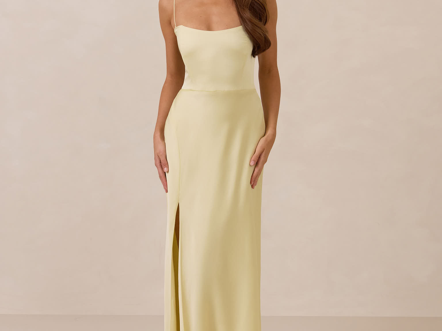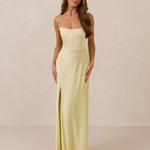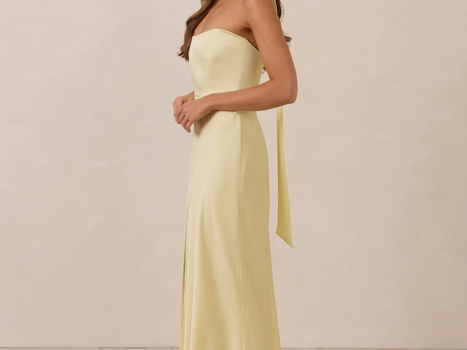 With an emphasis on the details, this satin maxi dress is cut on the bias for an ultra-flattering drape that skims the body perfectly. A subtle, hip-grazing slit adds movement and a touch of leg, while removable straps offer versatility—wear it strapless for a sleek look or with straps for added support and structure.