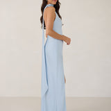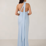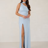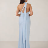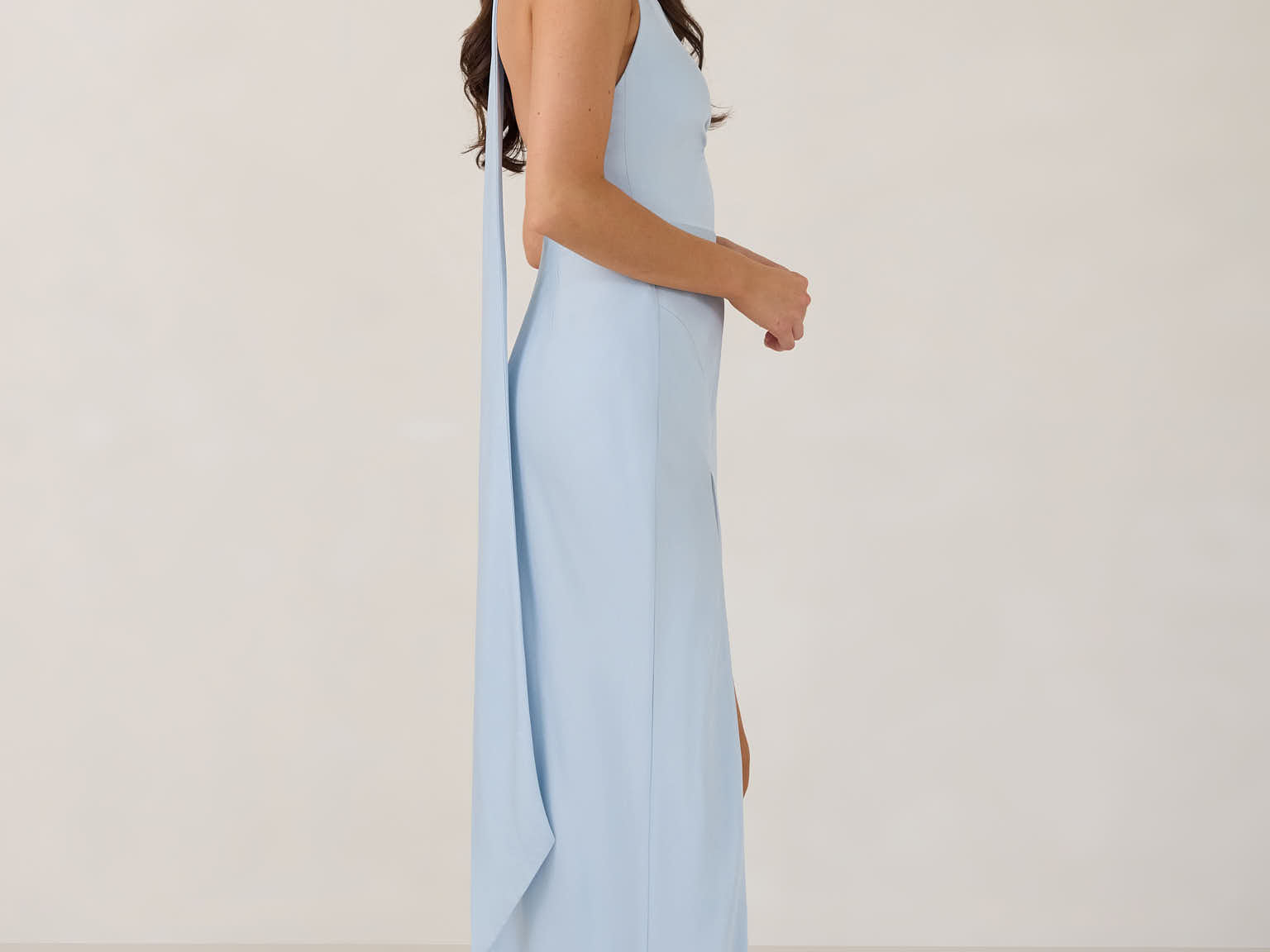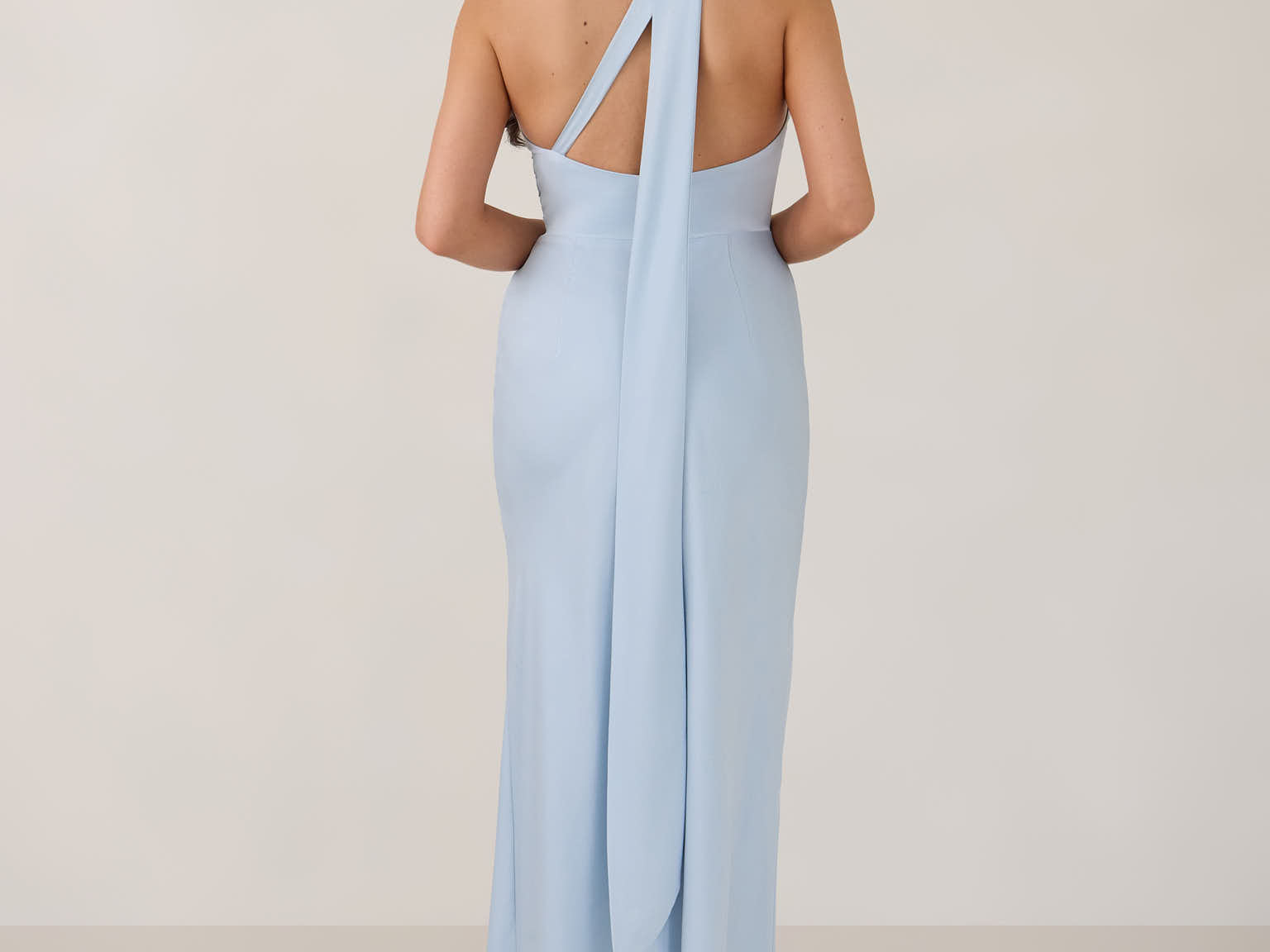 Perfect for turning heads at any event. Featuring a trend-forward scarf detail and a striking asymmetrical neckline, this design makes a bold statement. The slit skirt completes the look, creating a graceful silhouette.