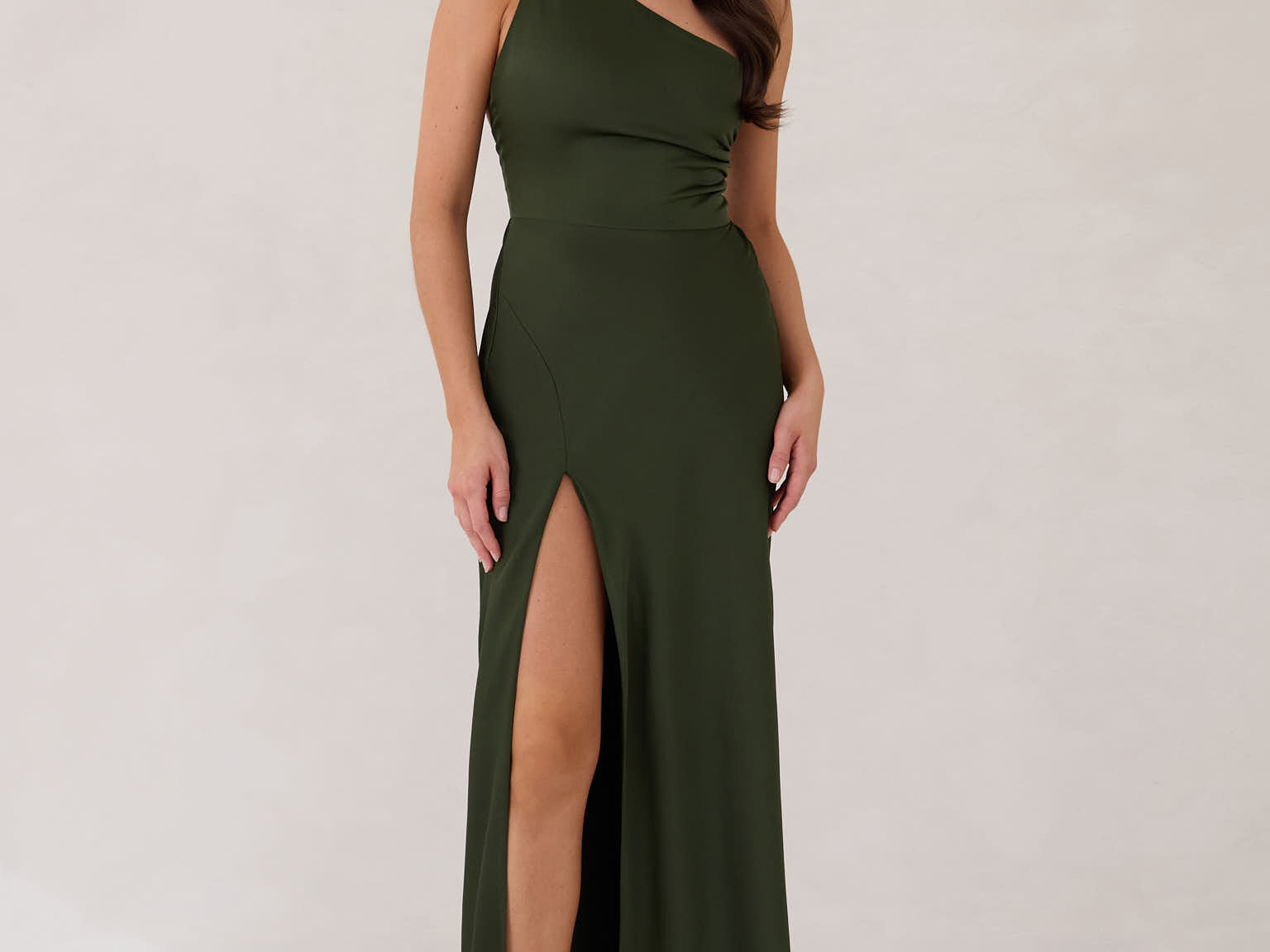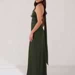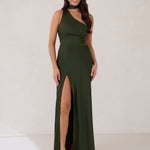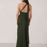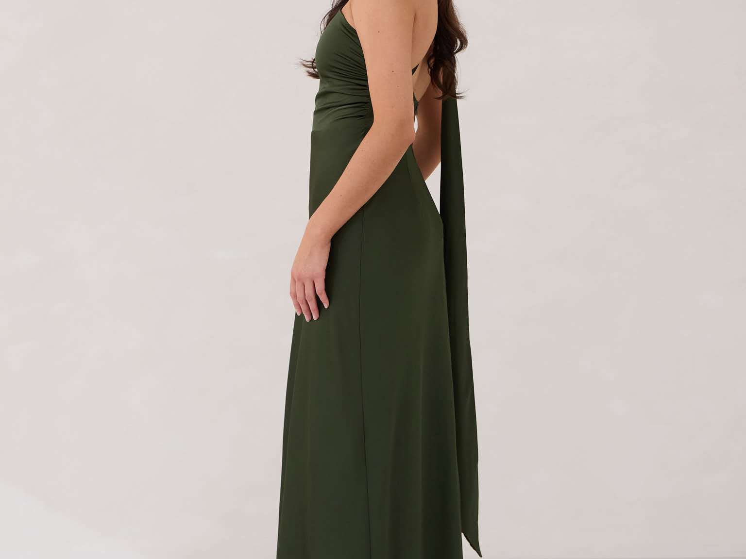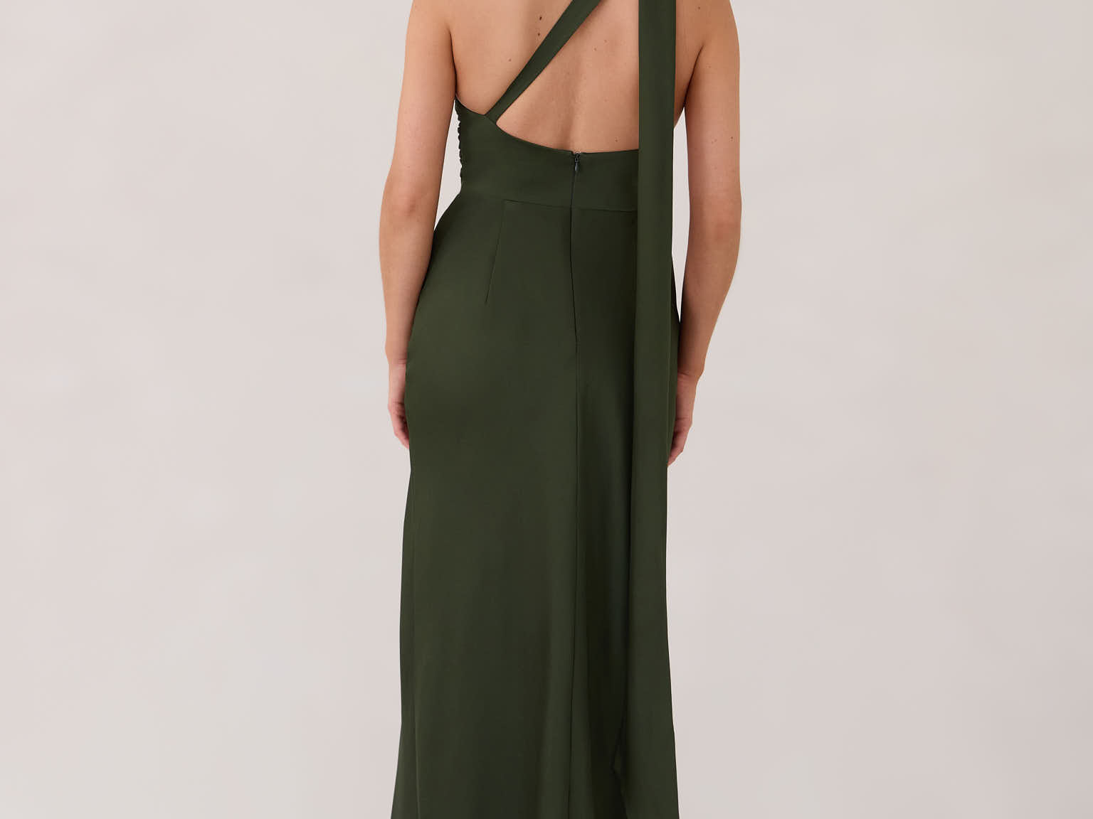 Perfect for turning heads at any event. Featuring a trend-forward scarf detail and a striking asymmetrical neckline, this design makes a bold statement. The slit skirt completes the look, creating a graceful silhouette.