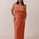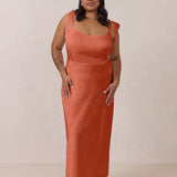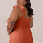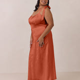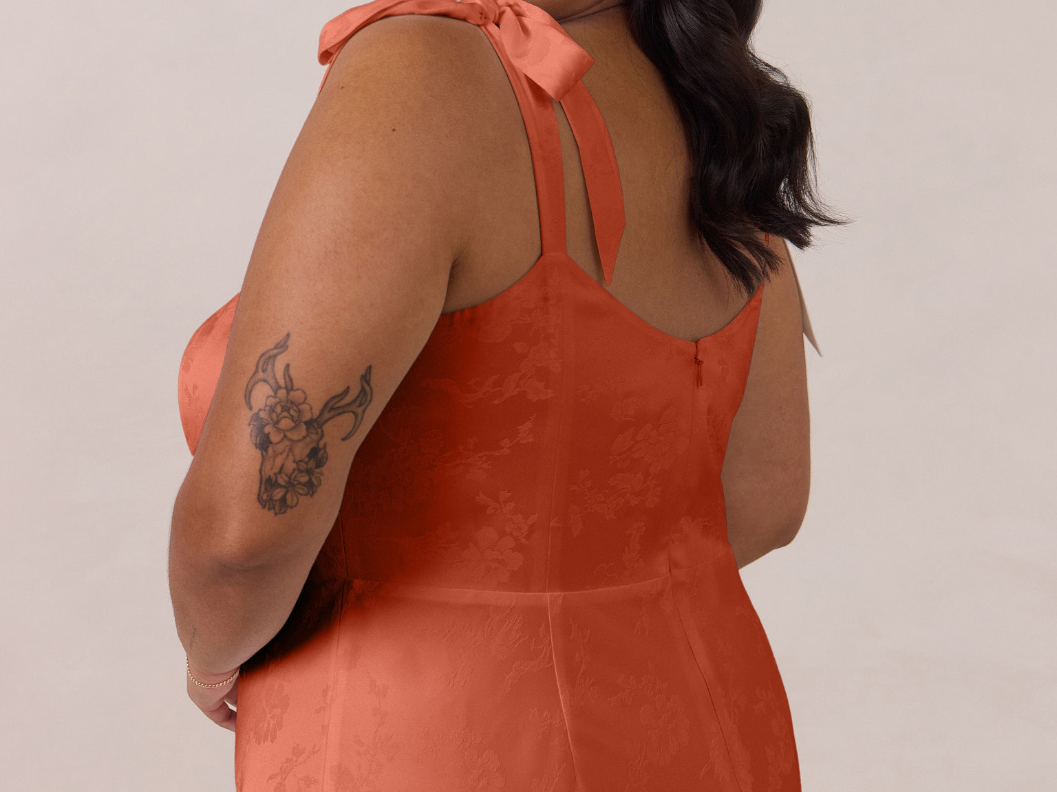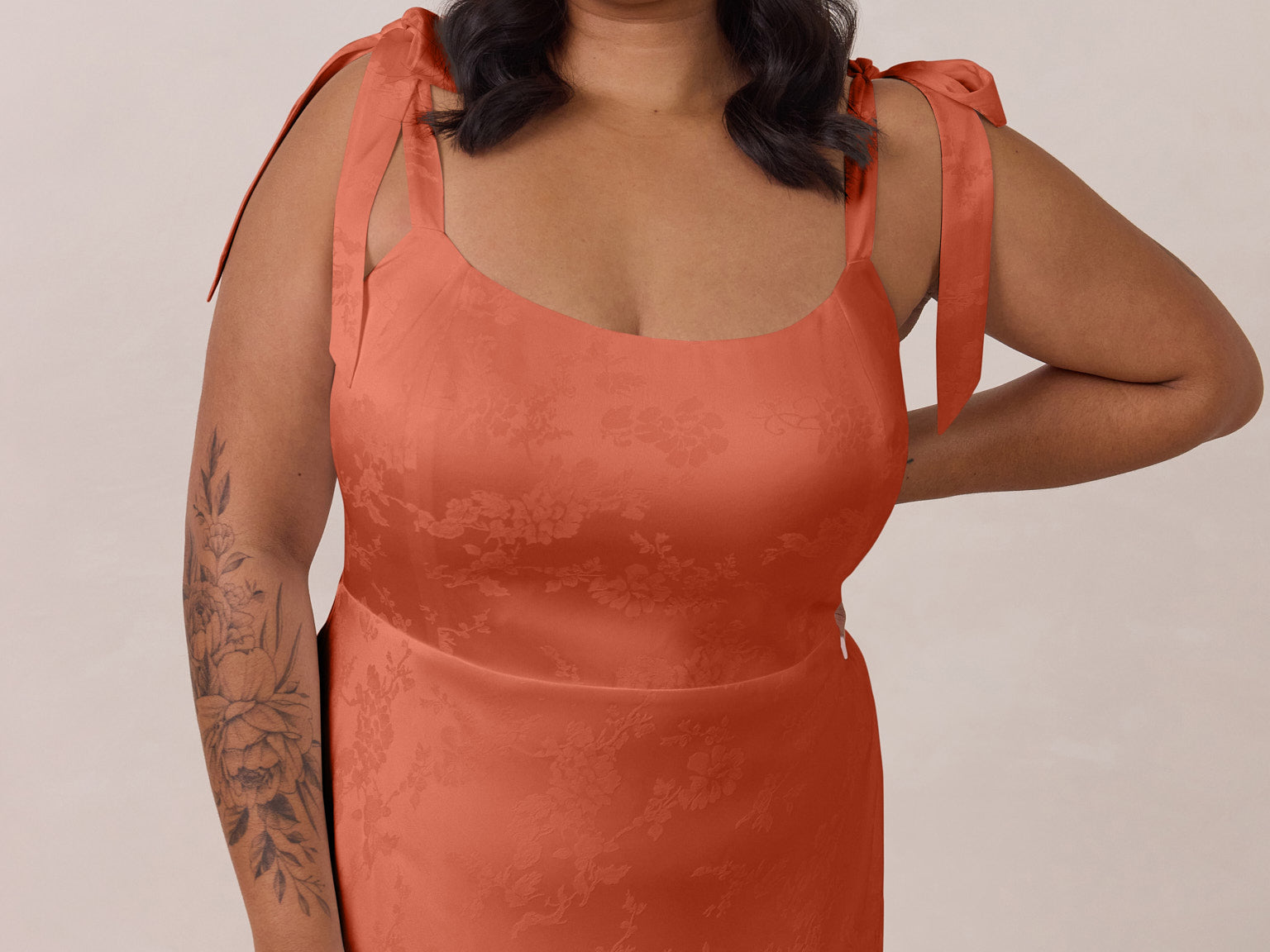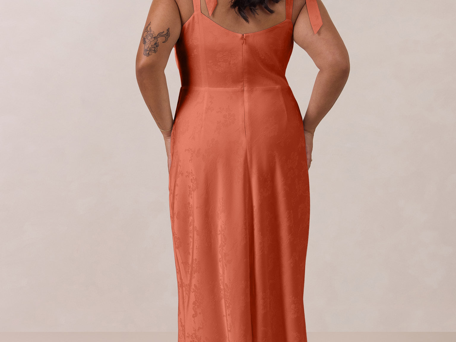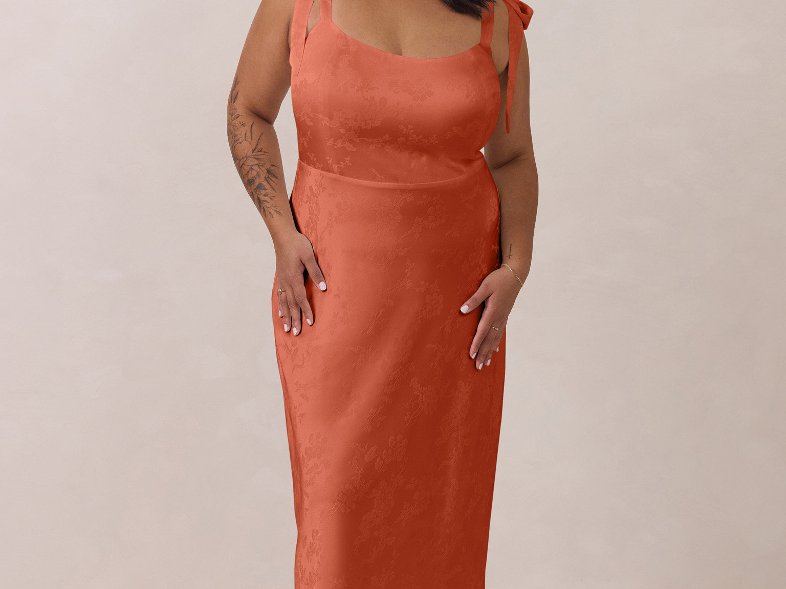 Crafted from luxurious Jacquard satin, this dress features feminine tie straps and a flattering bias-cut skirt, offering a flattering silhouette with timeless appeal.