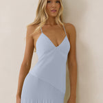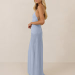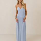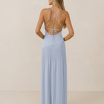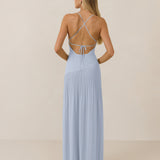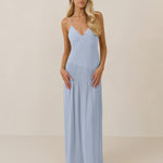 This full-length chiffon gown offers a flattering silhouette with its gently fitted bodice, soft V-neckline, and open back. The lightweight chiffon drapes beautifully, forming a flowing, pleated skirt that moves with ease for a clean, elevated finish. Fully lined for comfort and confidence.