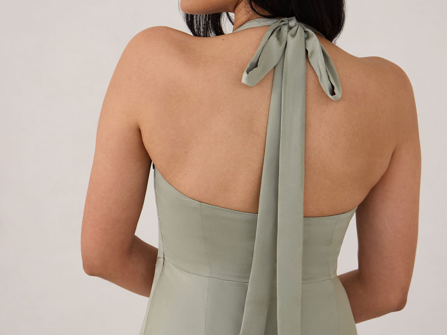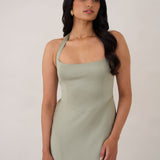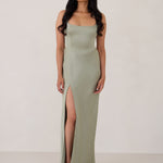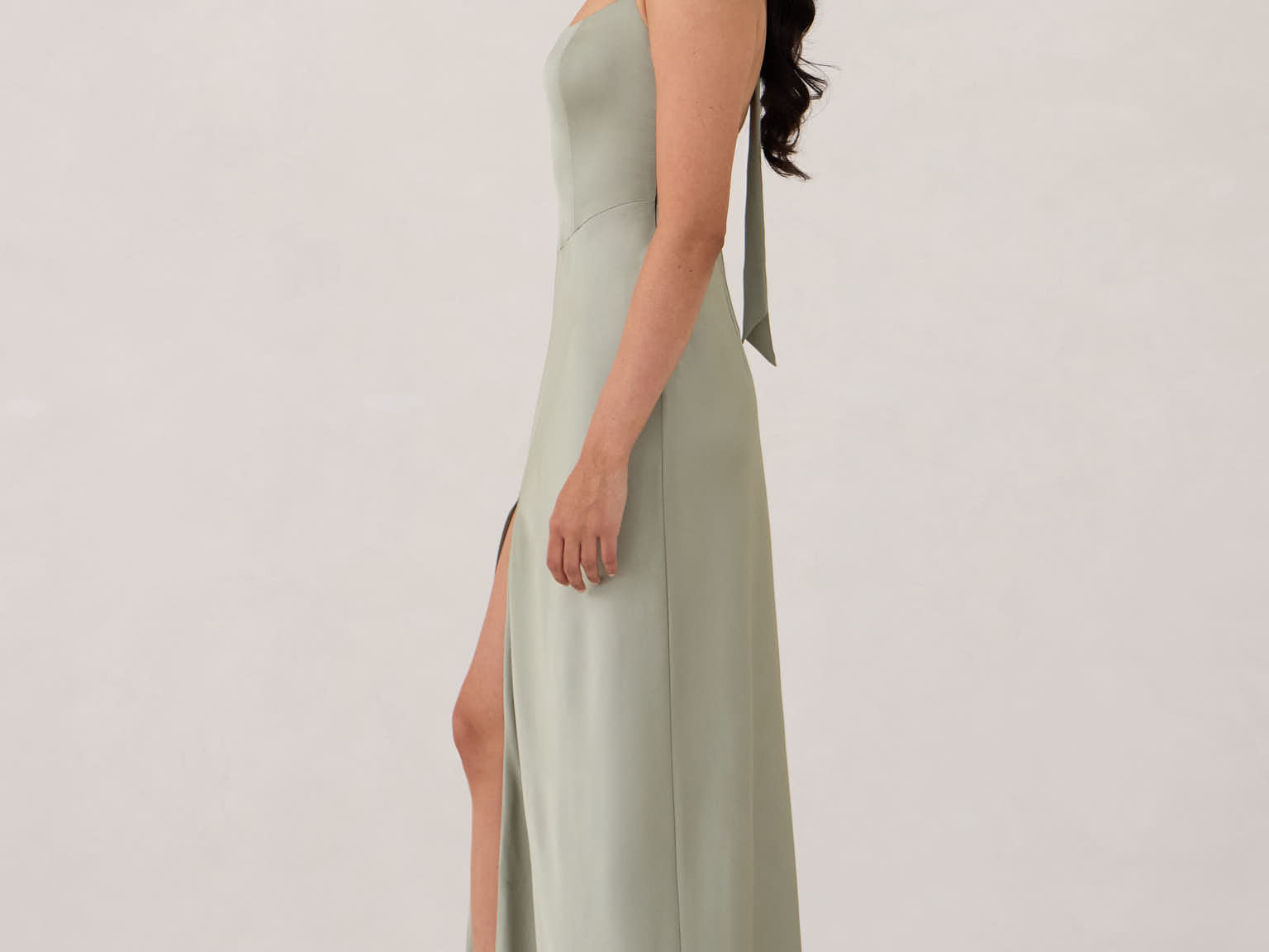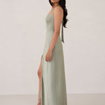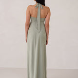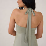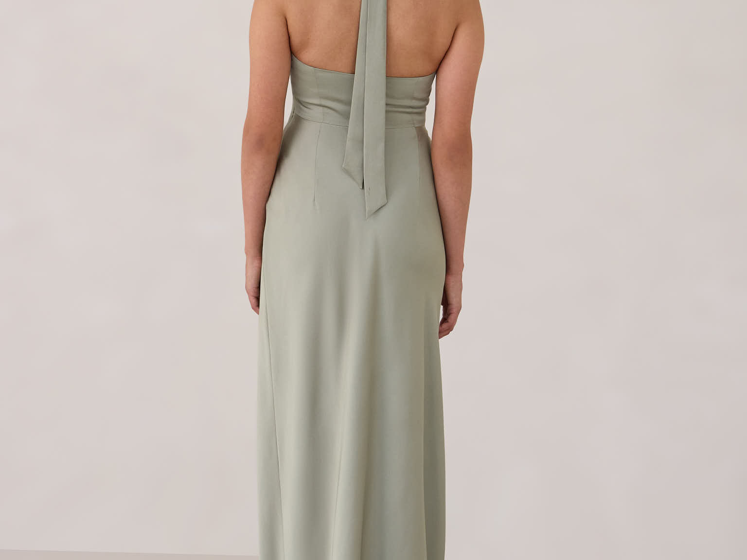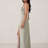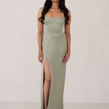 The perfect balance of chic simplicity and modern flair. Designed with wide-set straps and a halter tie, the flattering neckline leads to a low open back, adding a sophisticated touch. The bias-cut skirt gracefully flows down, featuring a high slit from the hip for an extra touch of allure.