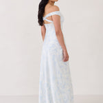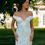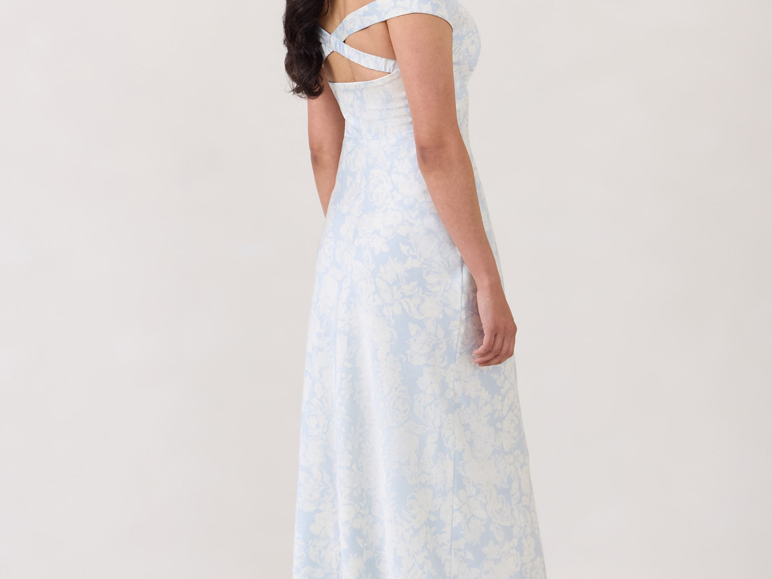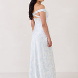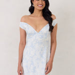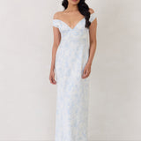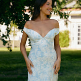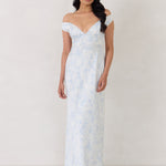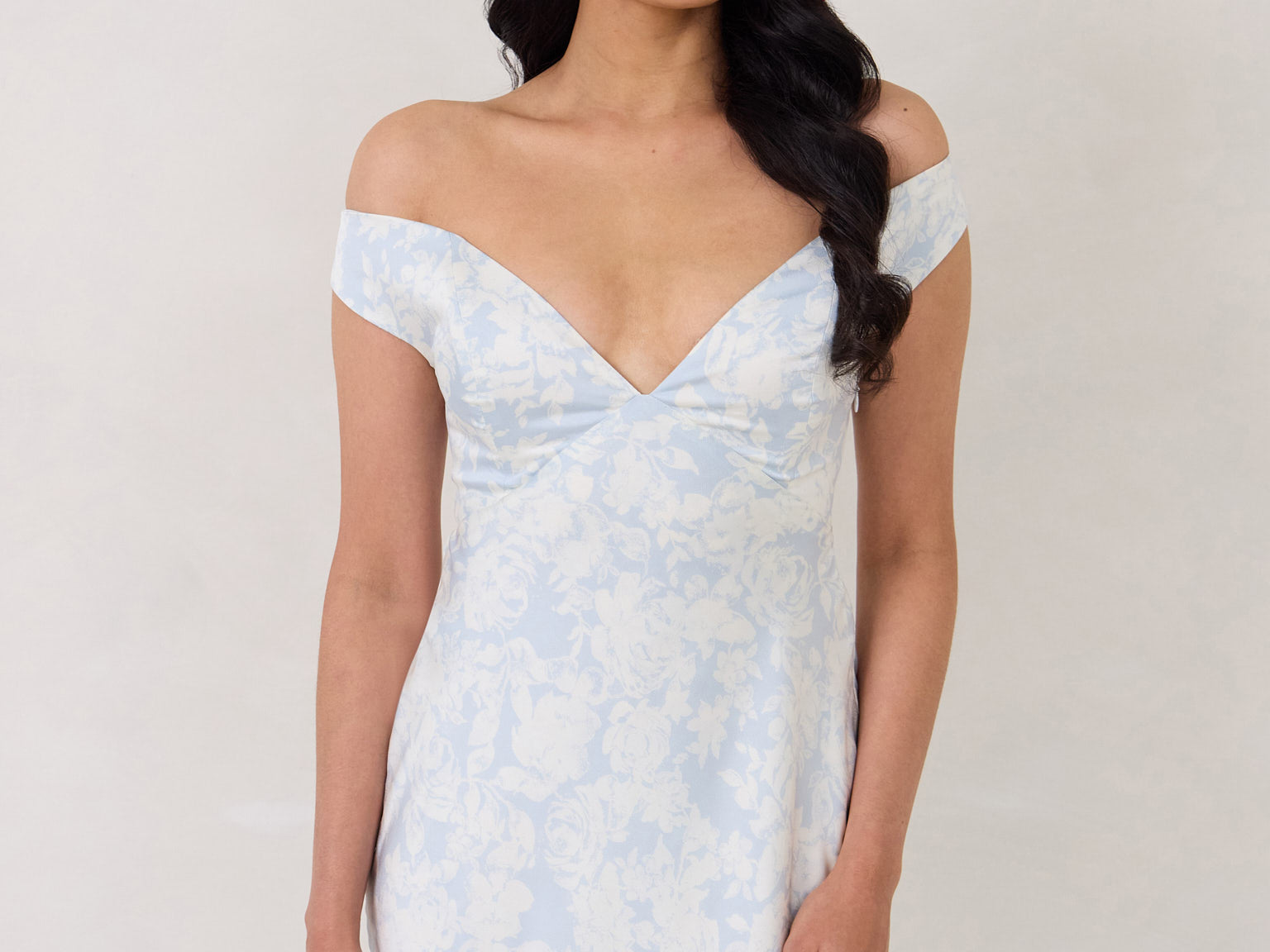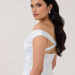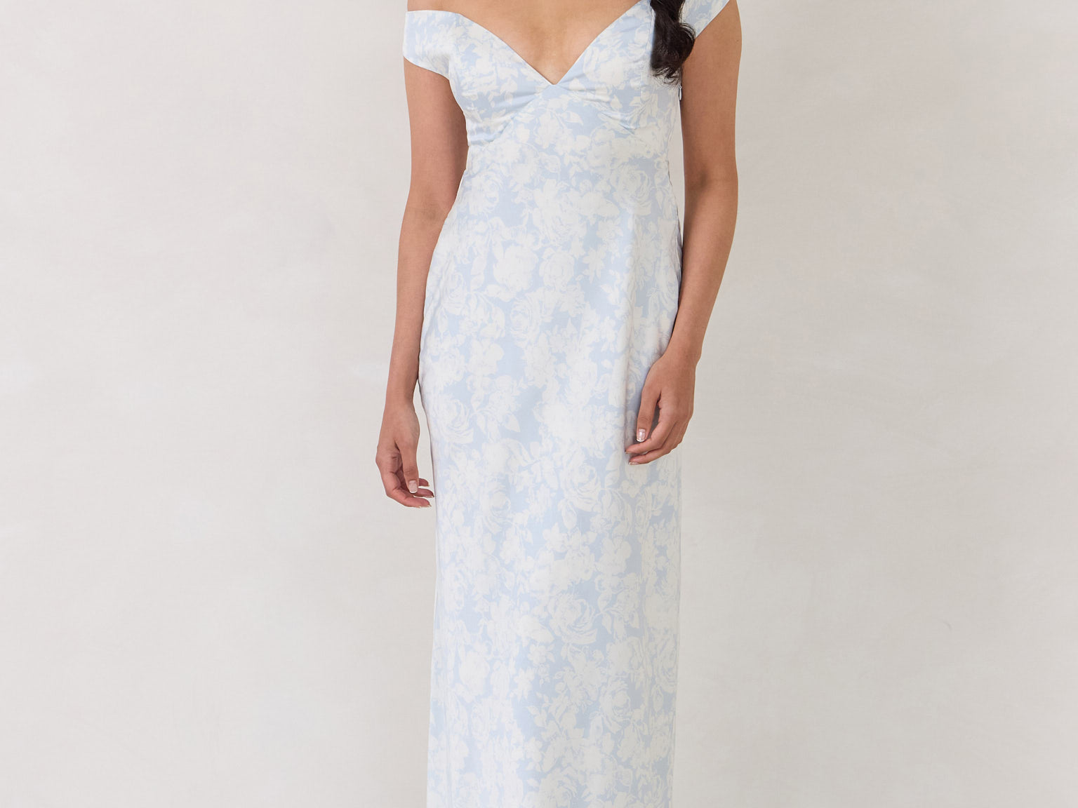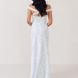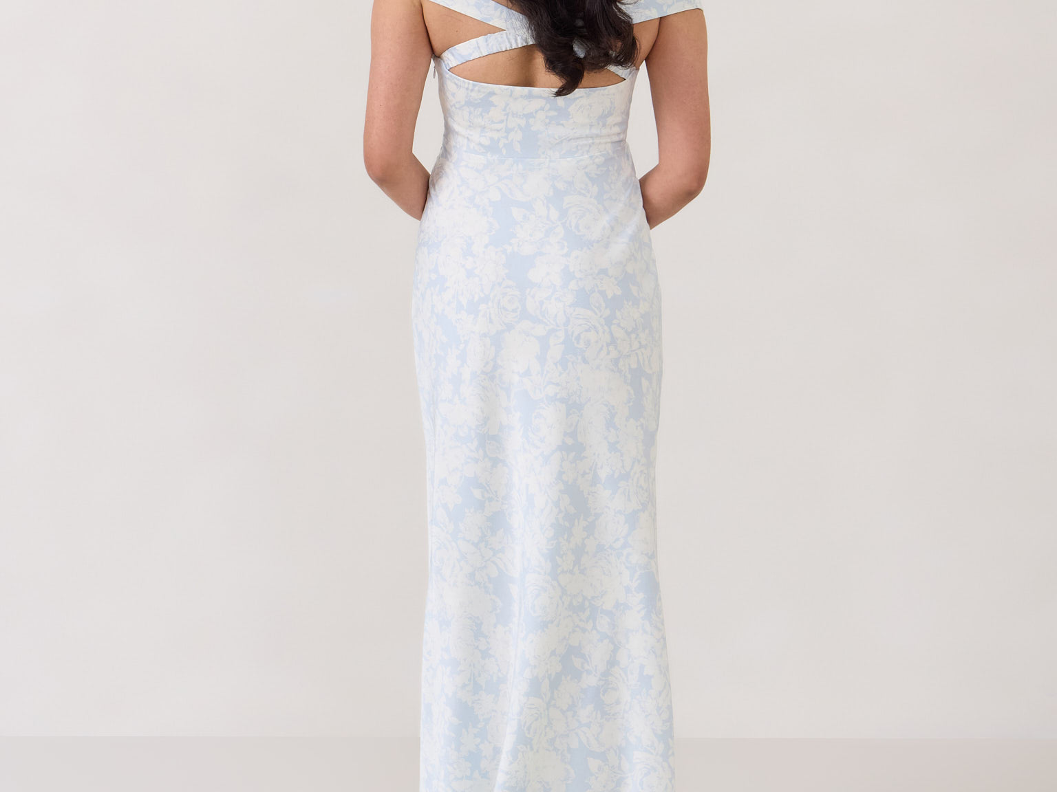 Featuring an off the shoulder design with a plunging neckline, this full-length dress is crafted with a bias-cut skirt for a sleek silhouette. Cross-back elasticated straps add both support and style, ensuring a secure fit. Perfect for the bridesmaid who wants to stand out or for any special occasion.