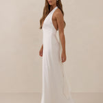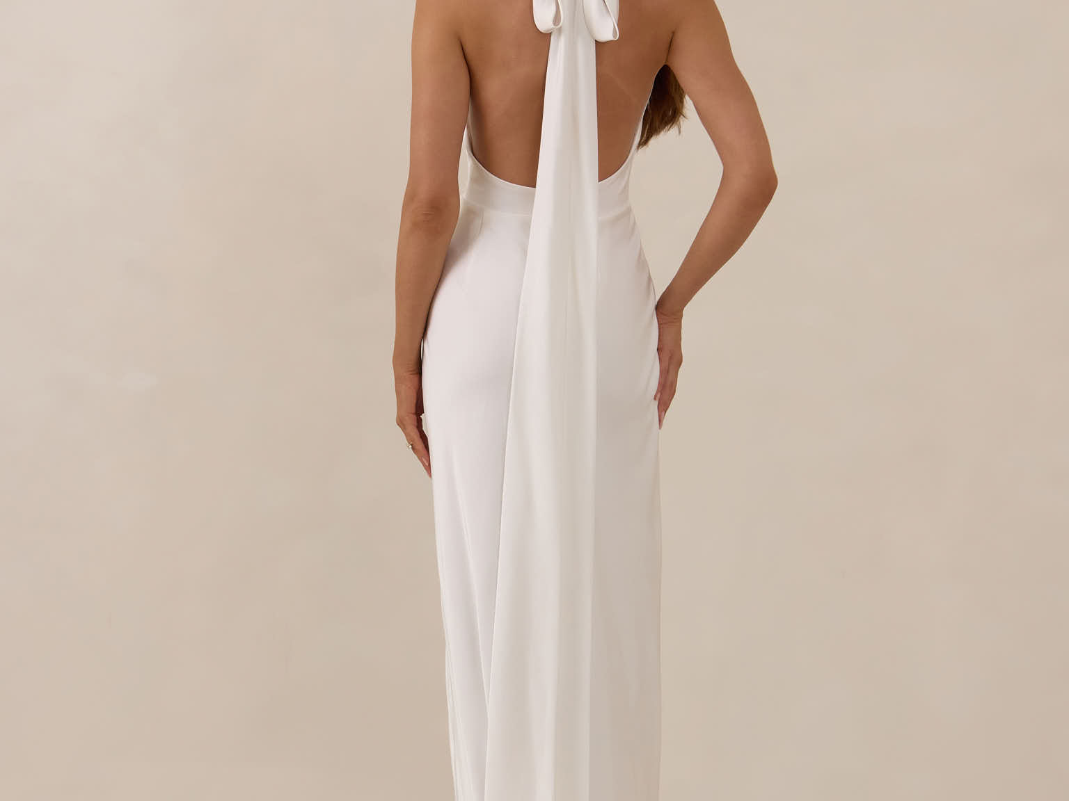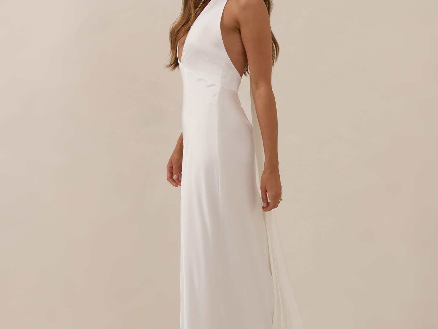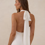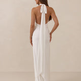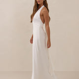 Elegantly understated, the Beaumont dress is designed for the bride who finds beauty in simplicity. Crafted from a silky, smooth satin in a soft off-white colour, this halter-style silhouette drapes effortlessly across the body, catching the light with every movement.