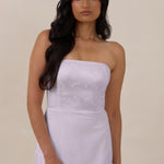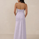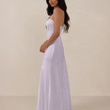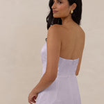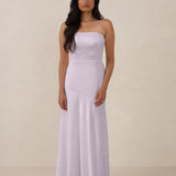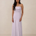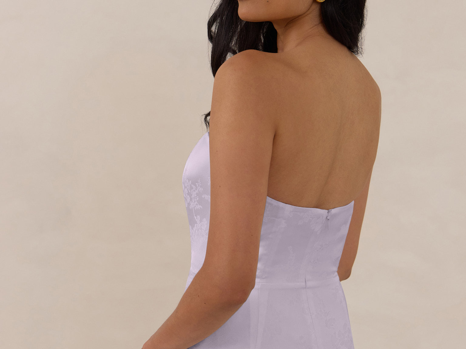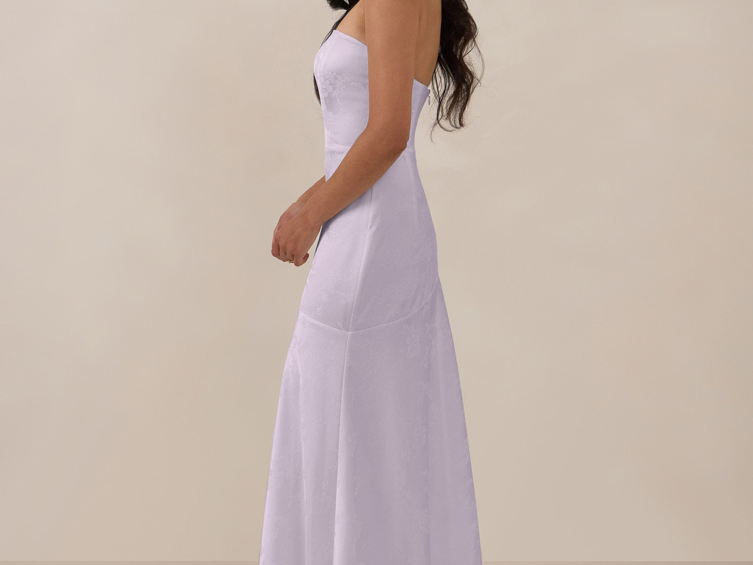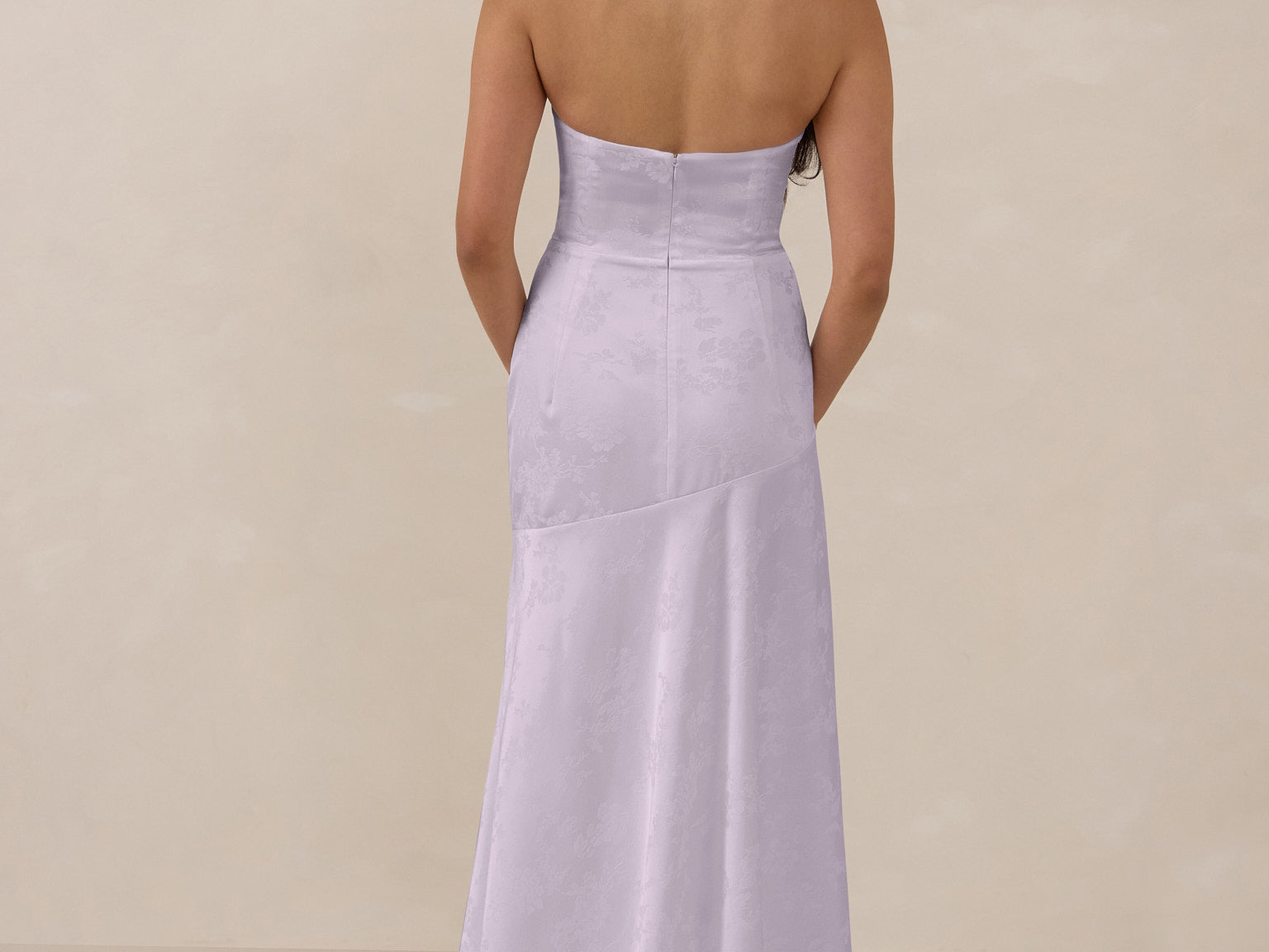 The Delaney is a full-length, strapless silhouette crafted from luxurious Jacquard satin. Clean lines and a smooth, sculpted bodice create a timeless look, while the sleek finish makes it an elevated choice for any bridal party.