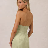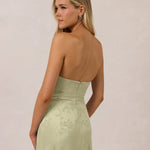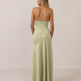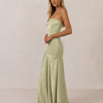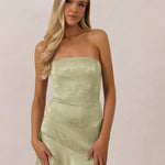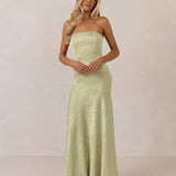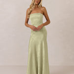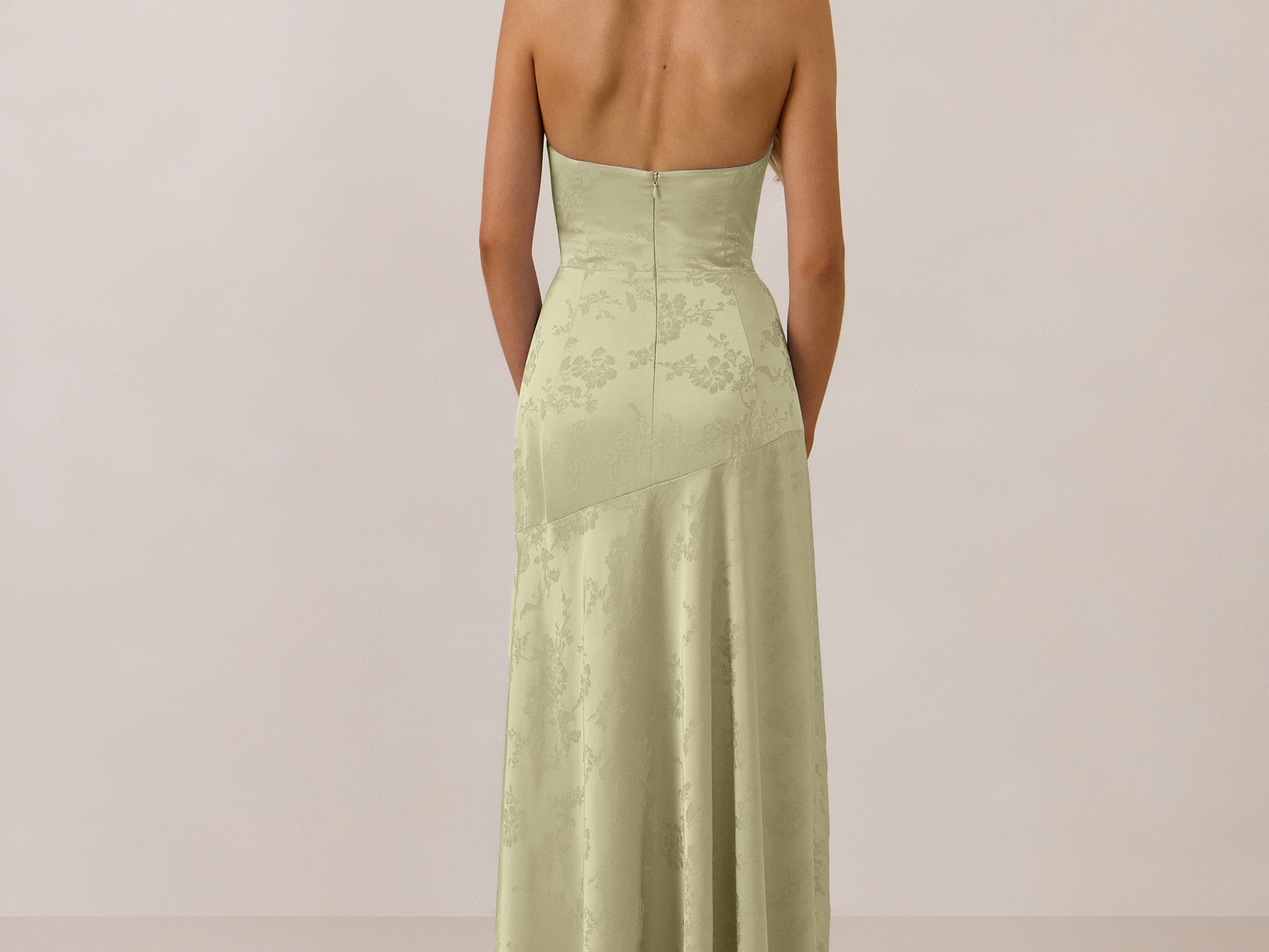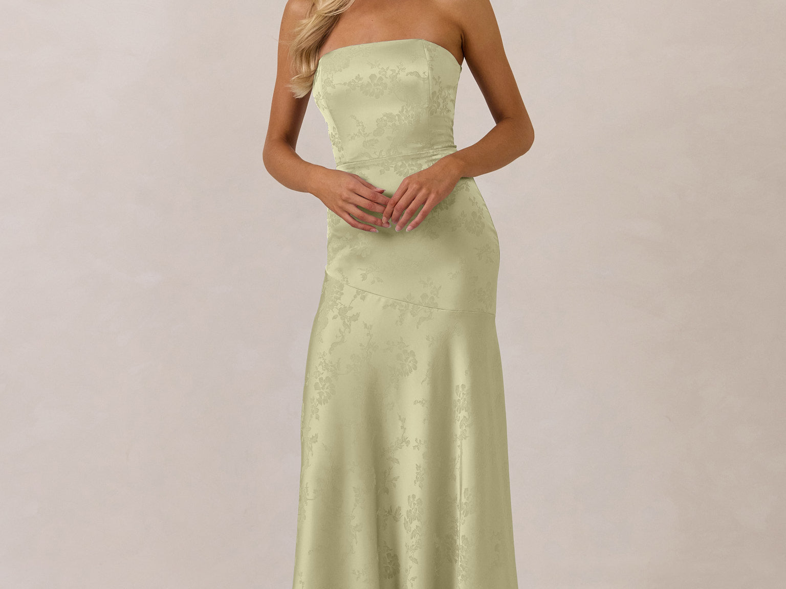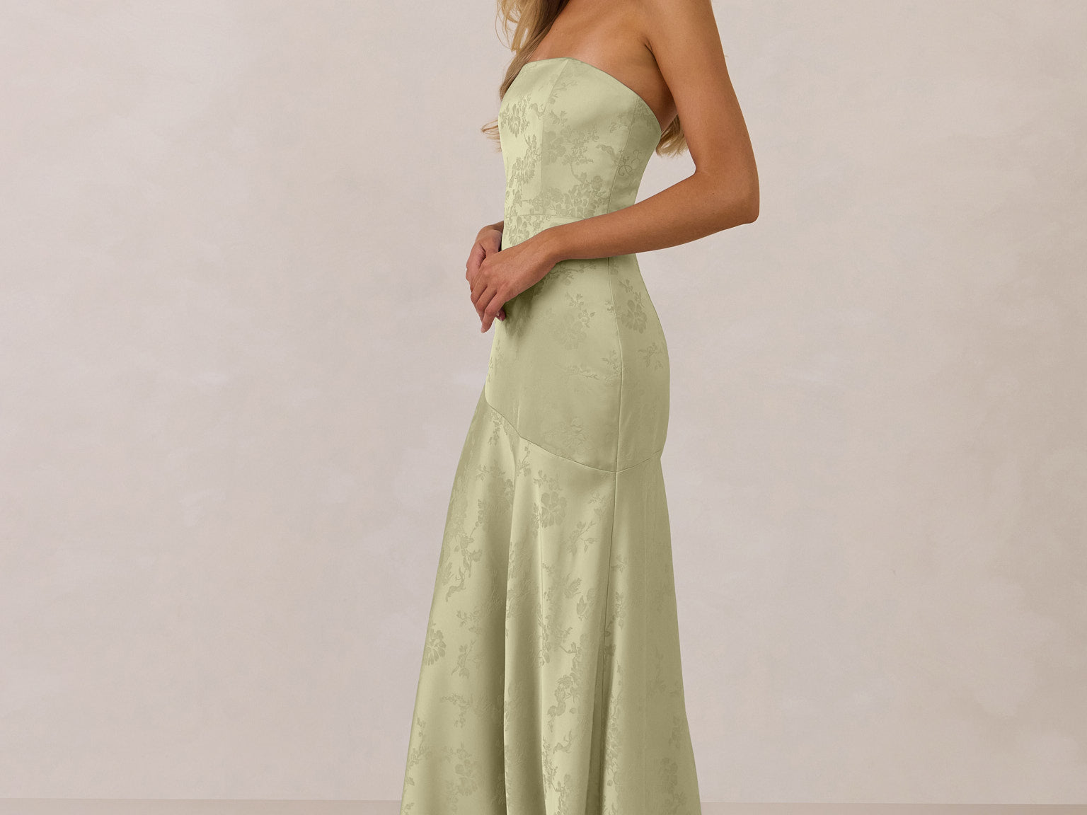 The Delaney is a full-length, strapless silhouette crafted from luxurious Jacquard satin. Clean lines and a smooth, sculpted bodice create a timeless look, while the sleek finish makes it an elevated choice for any bridal party.