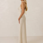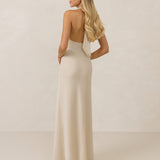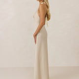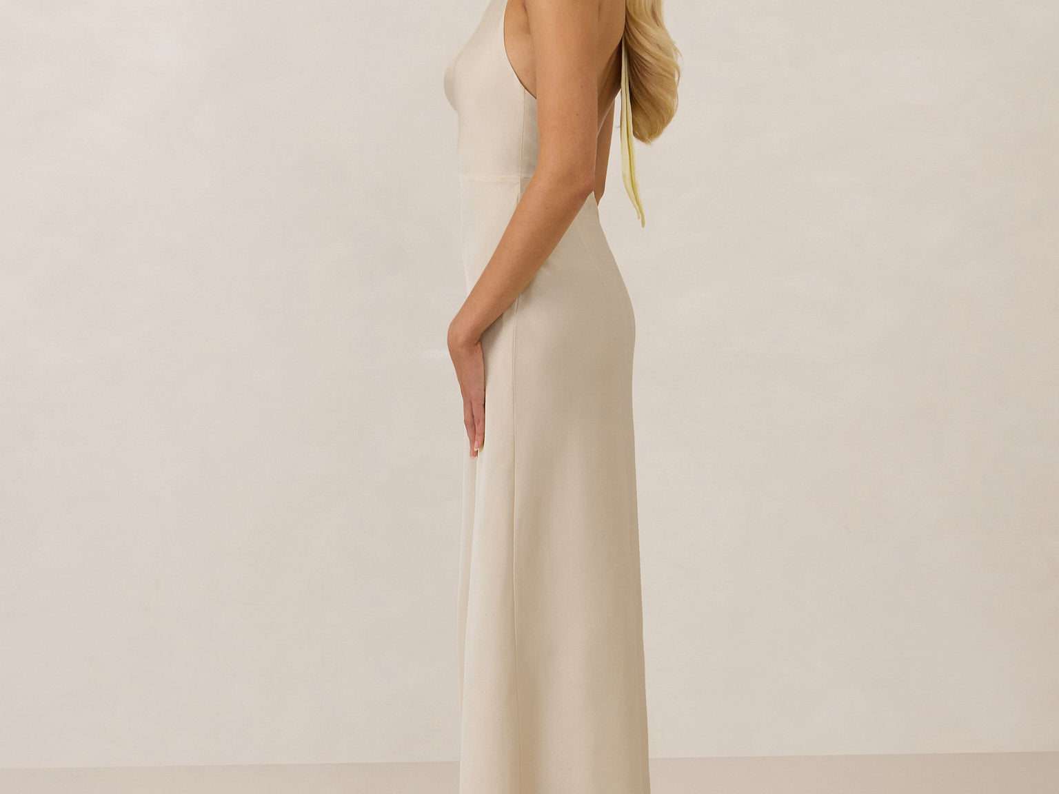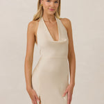 Effortlessly elegant, this bias-cut satin maxi dress features a fluid skirt with a curved thigh-high slit and a draped cowl neckline. Delicate, adjustable cross-back straps complete the look. Perfect for any occasion, it's glossy and flattering.