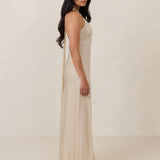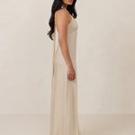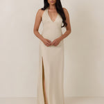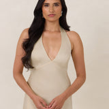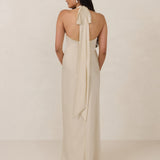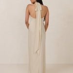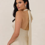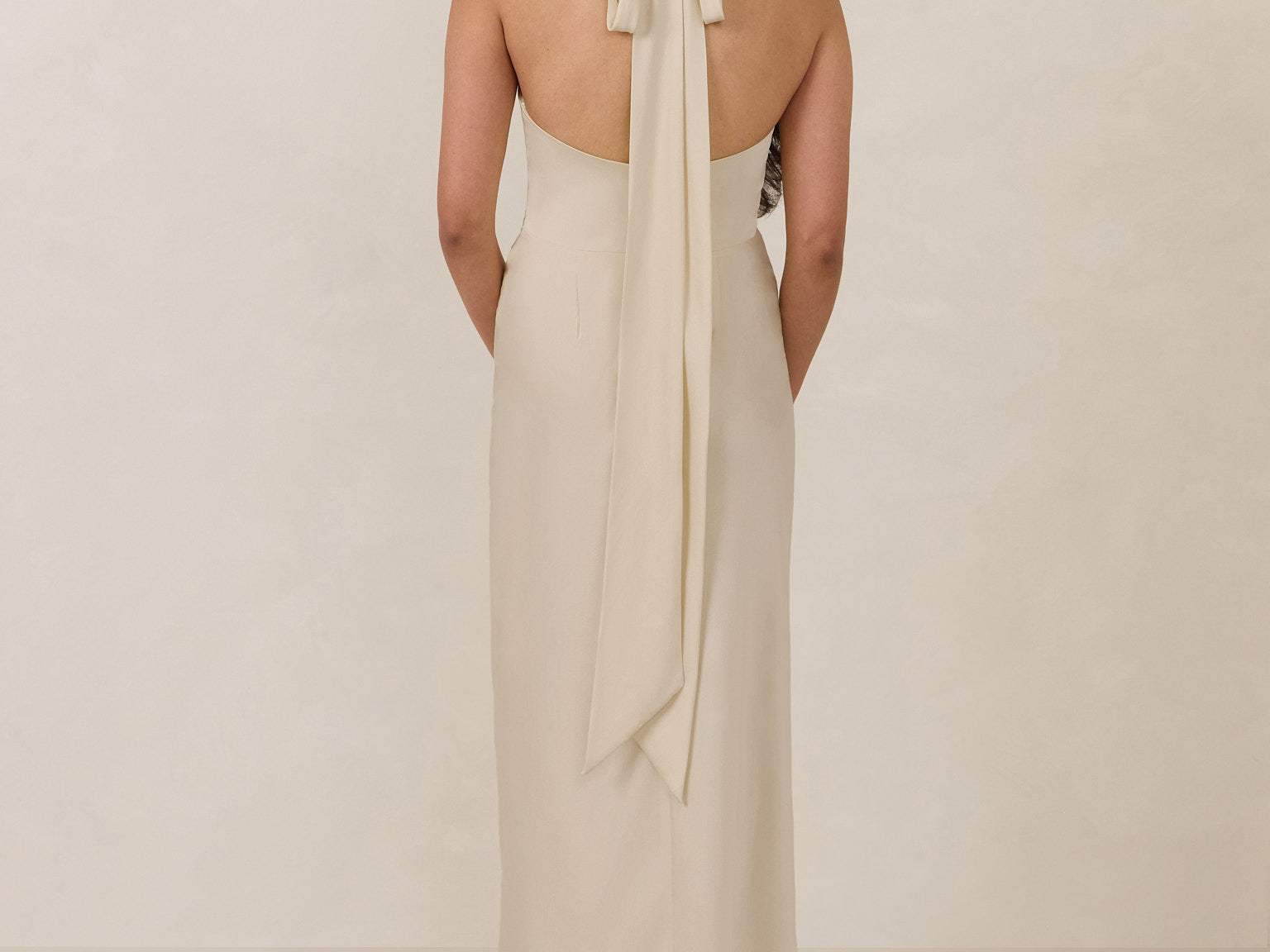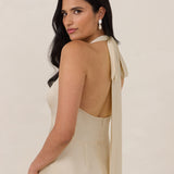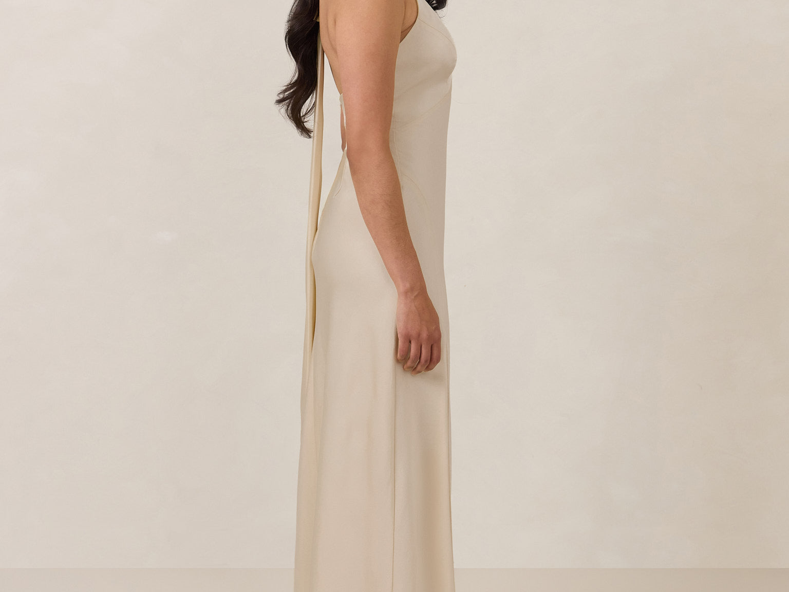 Designed to turn heads. Crafted from our smooth satin, this bust-friendly halter style features long, versatile ties that can be styled in a bow or worn as a neck scarf for a modern touch. Finished with a bias-cut skirt and a subtle slit, this dress effortlessly balances elegance with a bold edge.