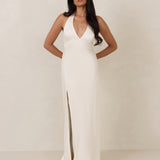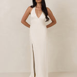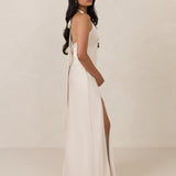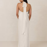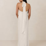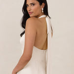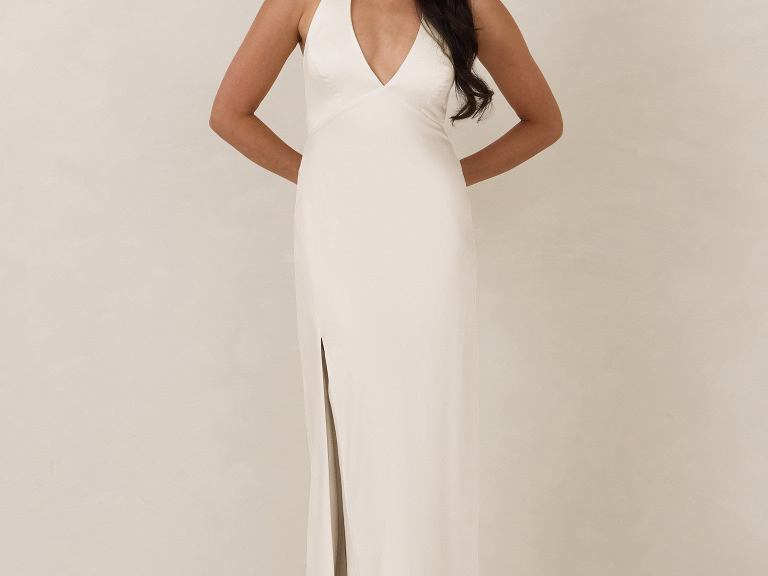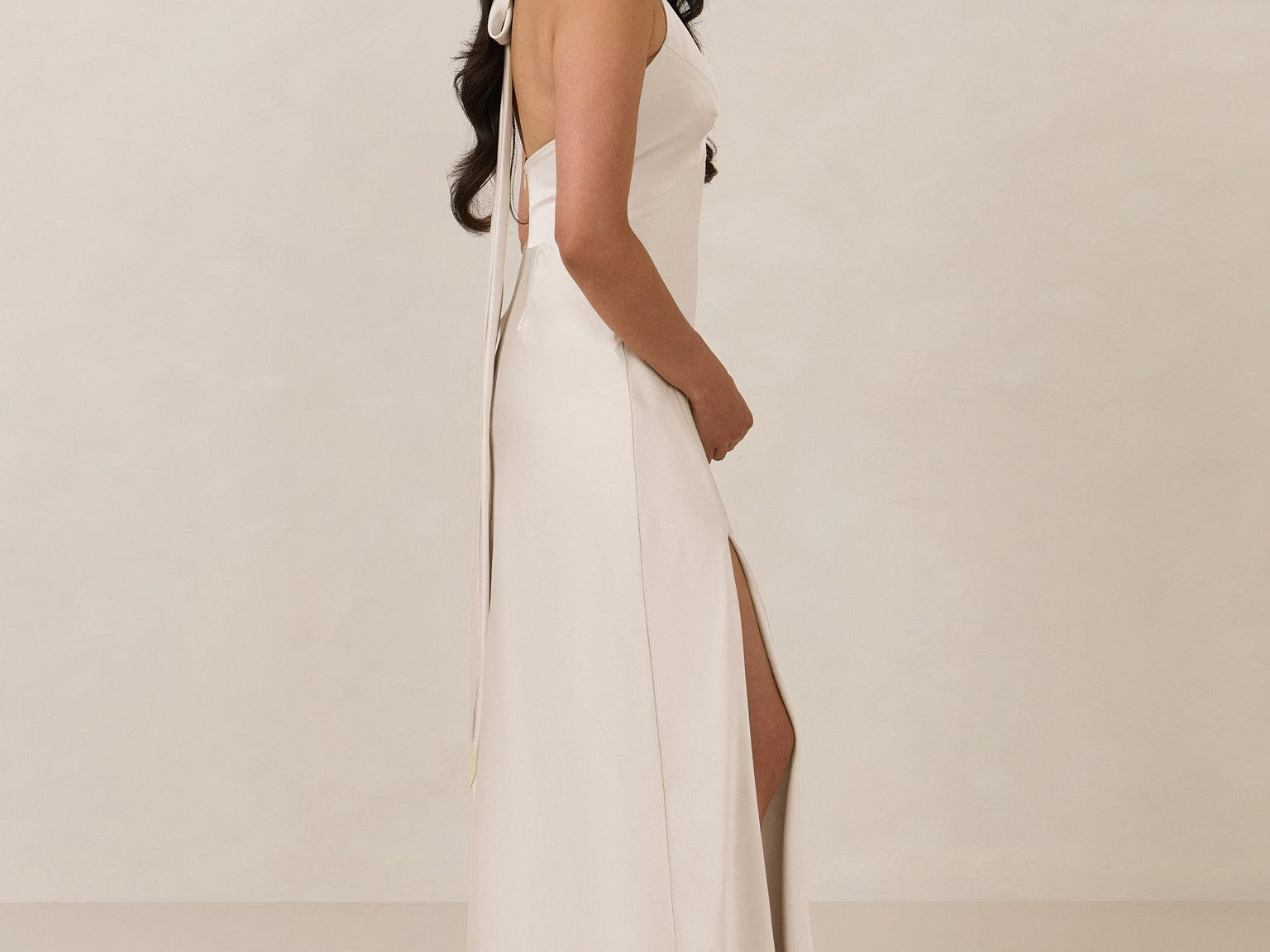 Designed to turn heads. Crafted from our smooth satin, this bust-friendly halter style features long, versatile ties that can be styled in a bow or worn as a neck scarf for a modern touch. Finished with a bias-cut skirt and a subtle slit, this dress effortlessly balances elegance with a bold edge.