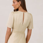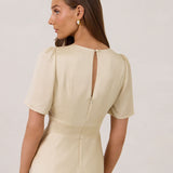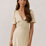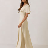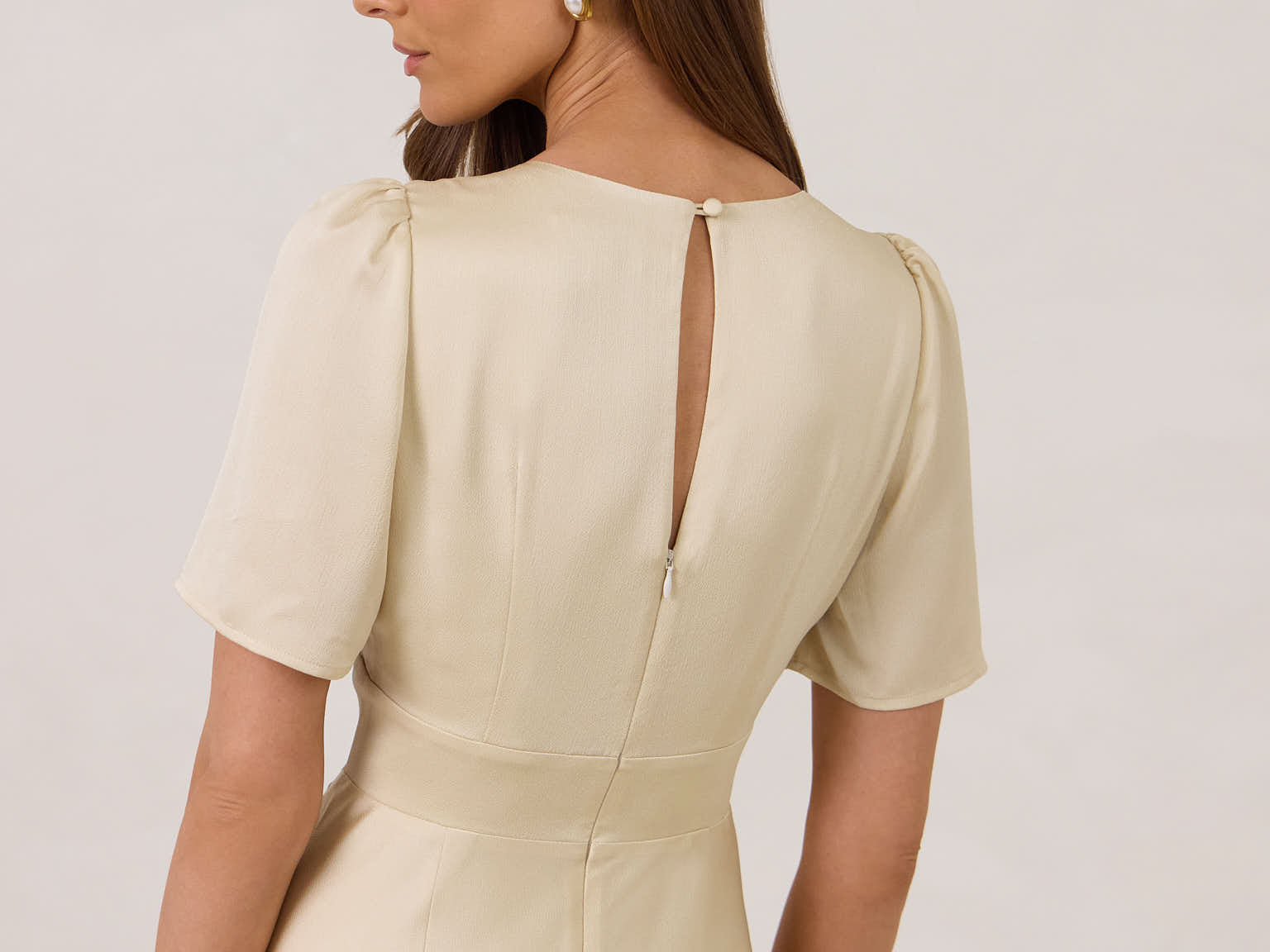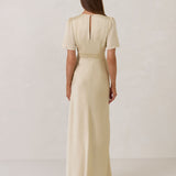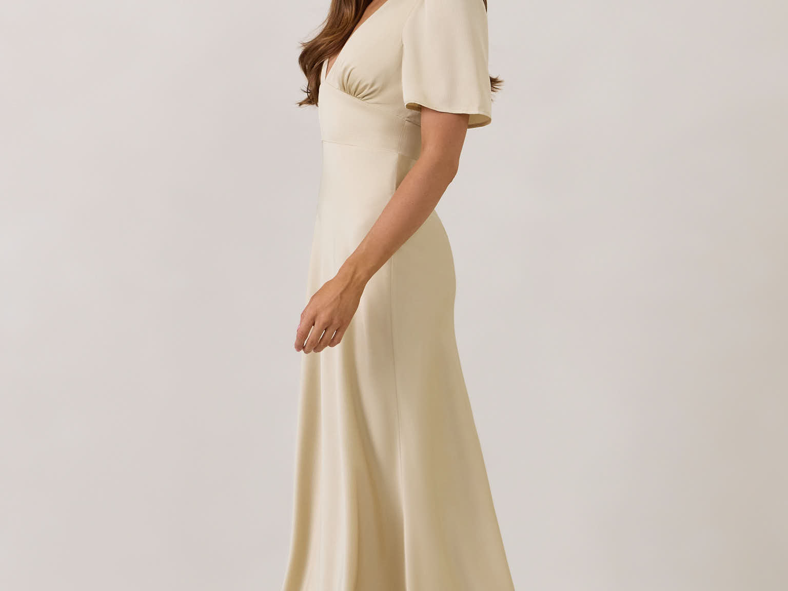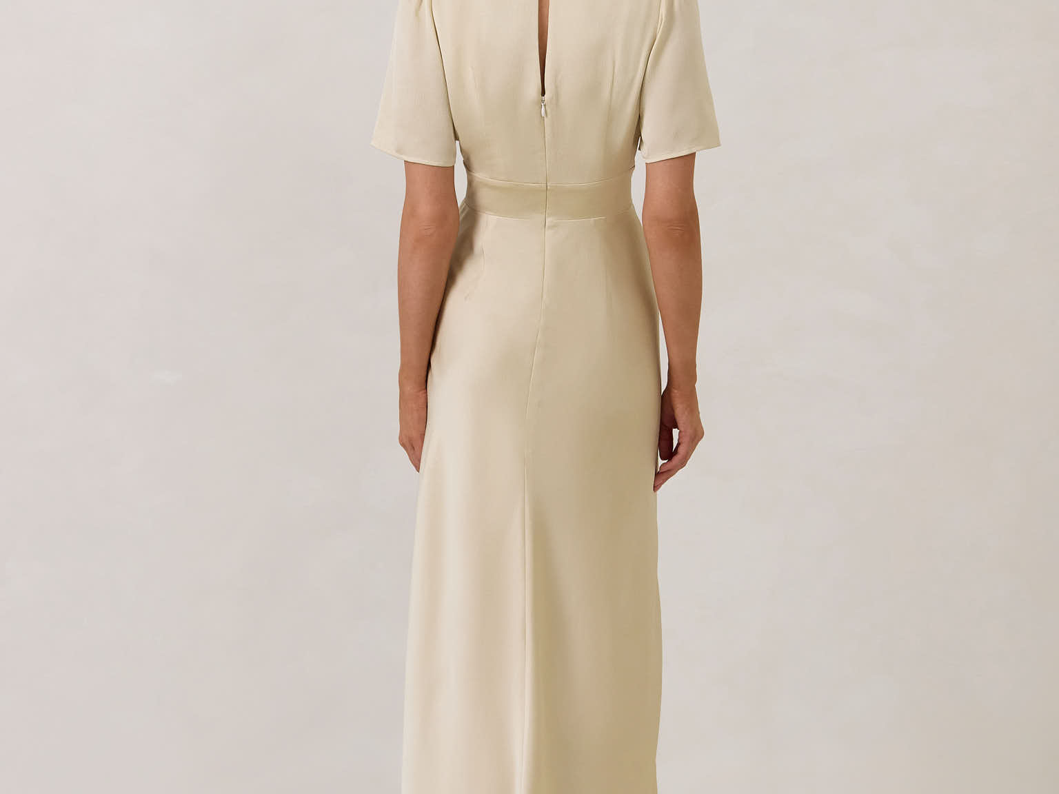 This full-length satin dress features a romantic V neckline, short sleeves, and a bias-cut skirt for an effortlessly feminine silhouette. A subtle keyhole back and delicate button closure add unexpected detail. Finished in silky satin with a soft, light-catching sheen.