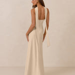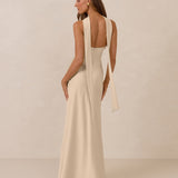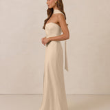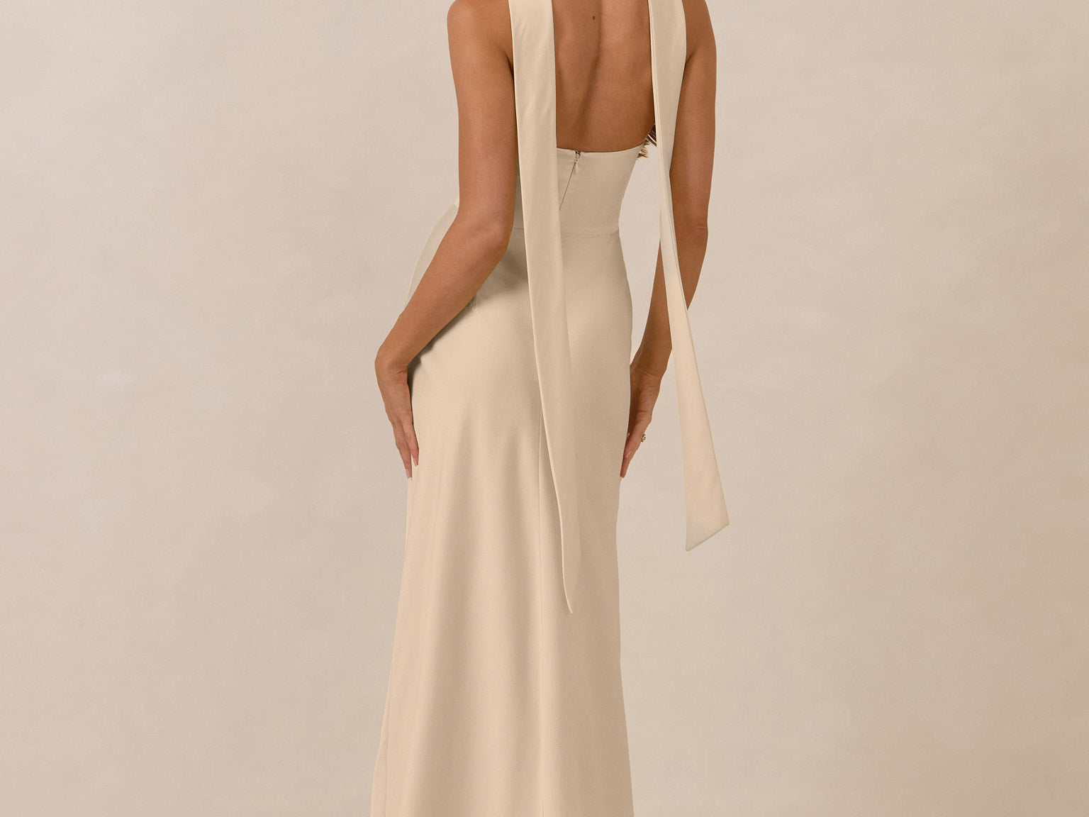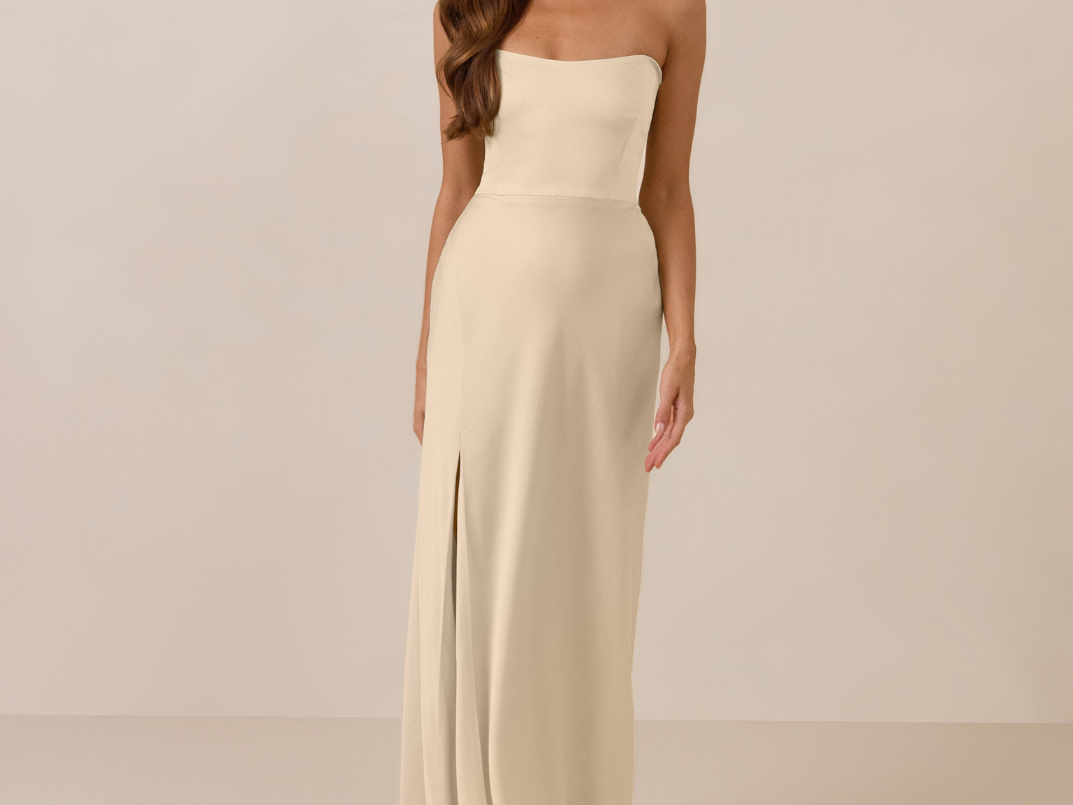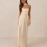 With an emphasis on the details, this satin maxi dress is cut on the bias for an ultra-flattering drape that skims the body perfectly. A subtle, hip-grazing slit adds movement and a touch of leg, while removable straps offer versatility—wear it strapless for a sleek look or with straps for added support and structure.
