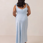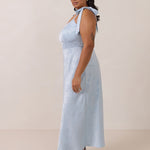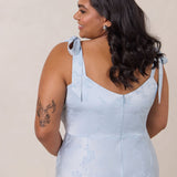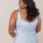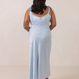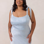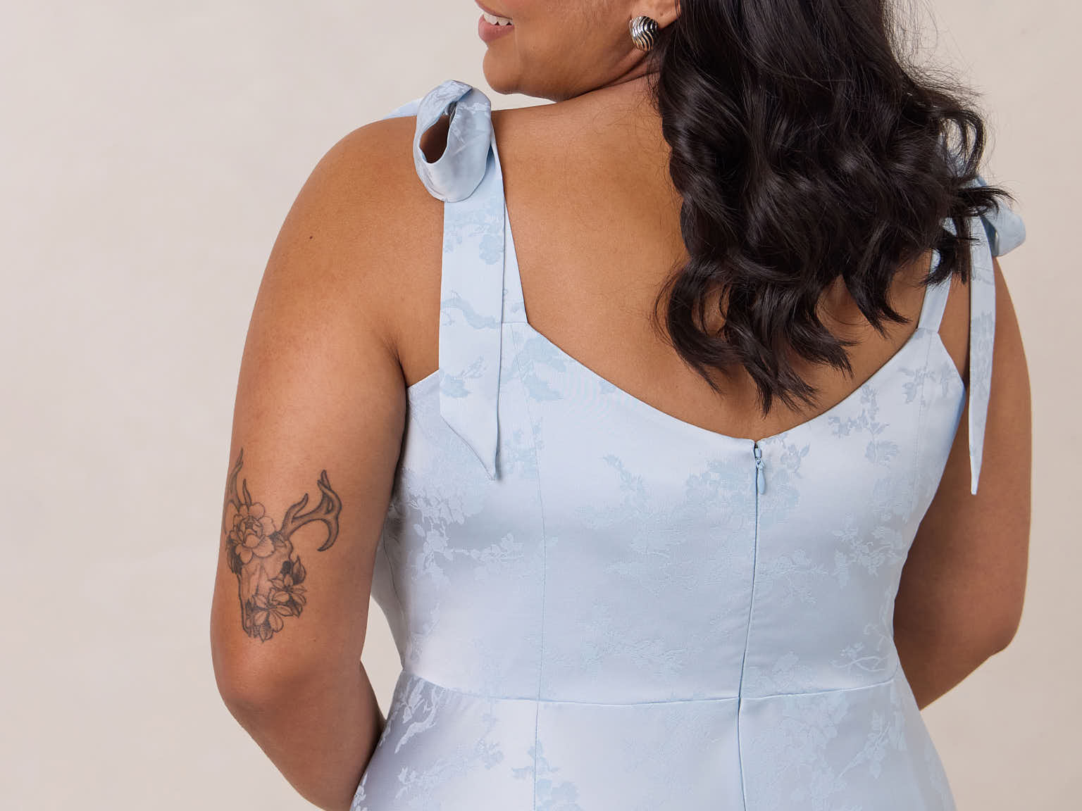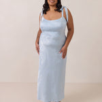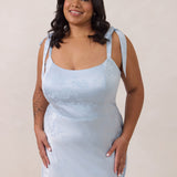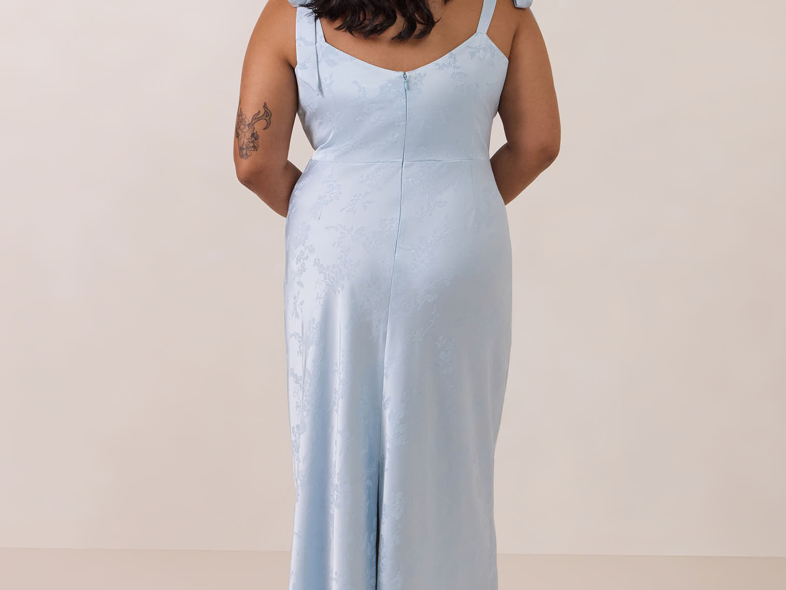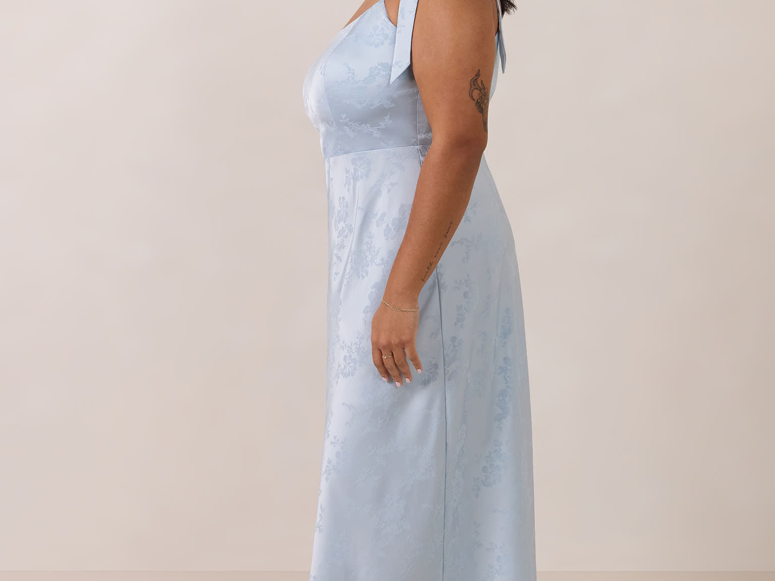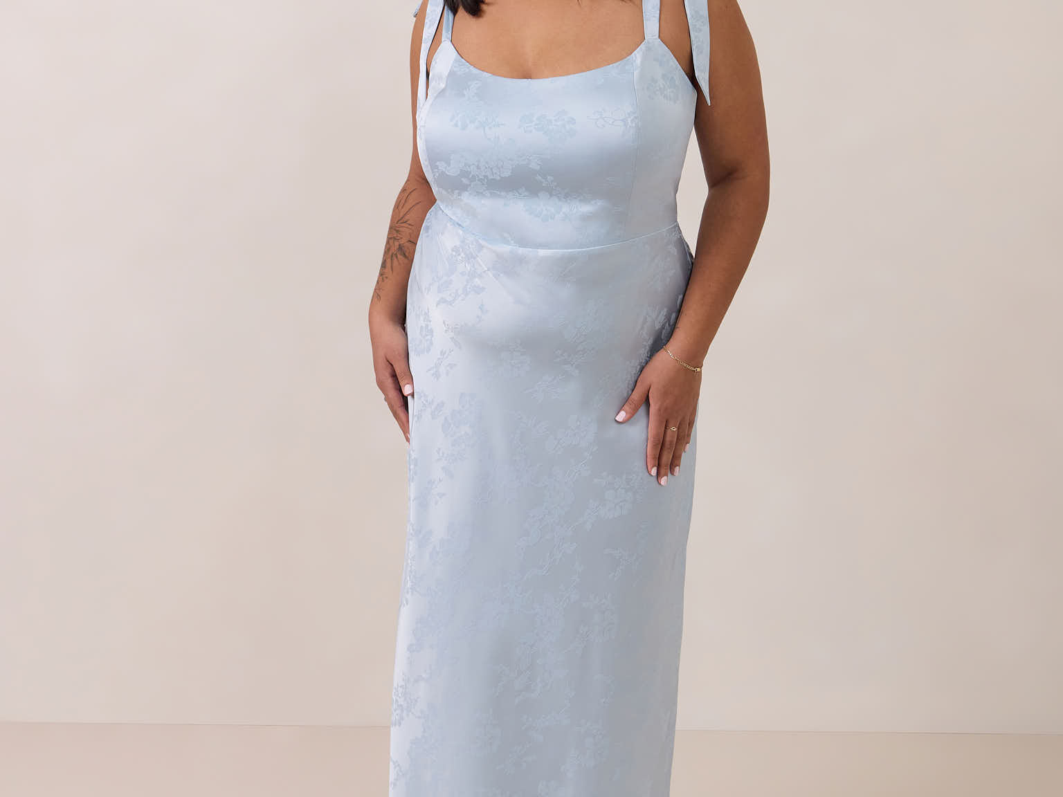 Crafted from luxurious Jacquard satin, this dress features feminine tie straps and a flattering bias-cut skirt, offering a flattering silhouette with timeless appeal.